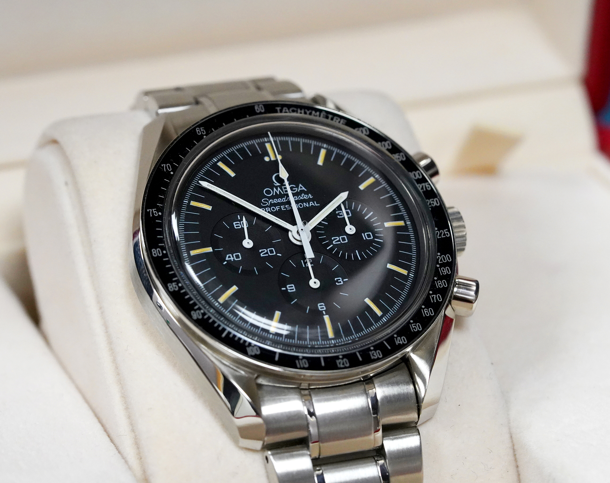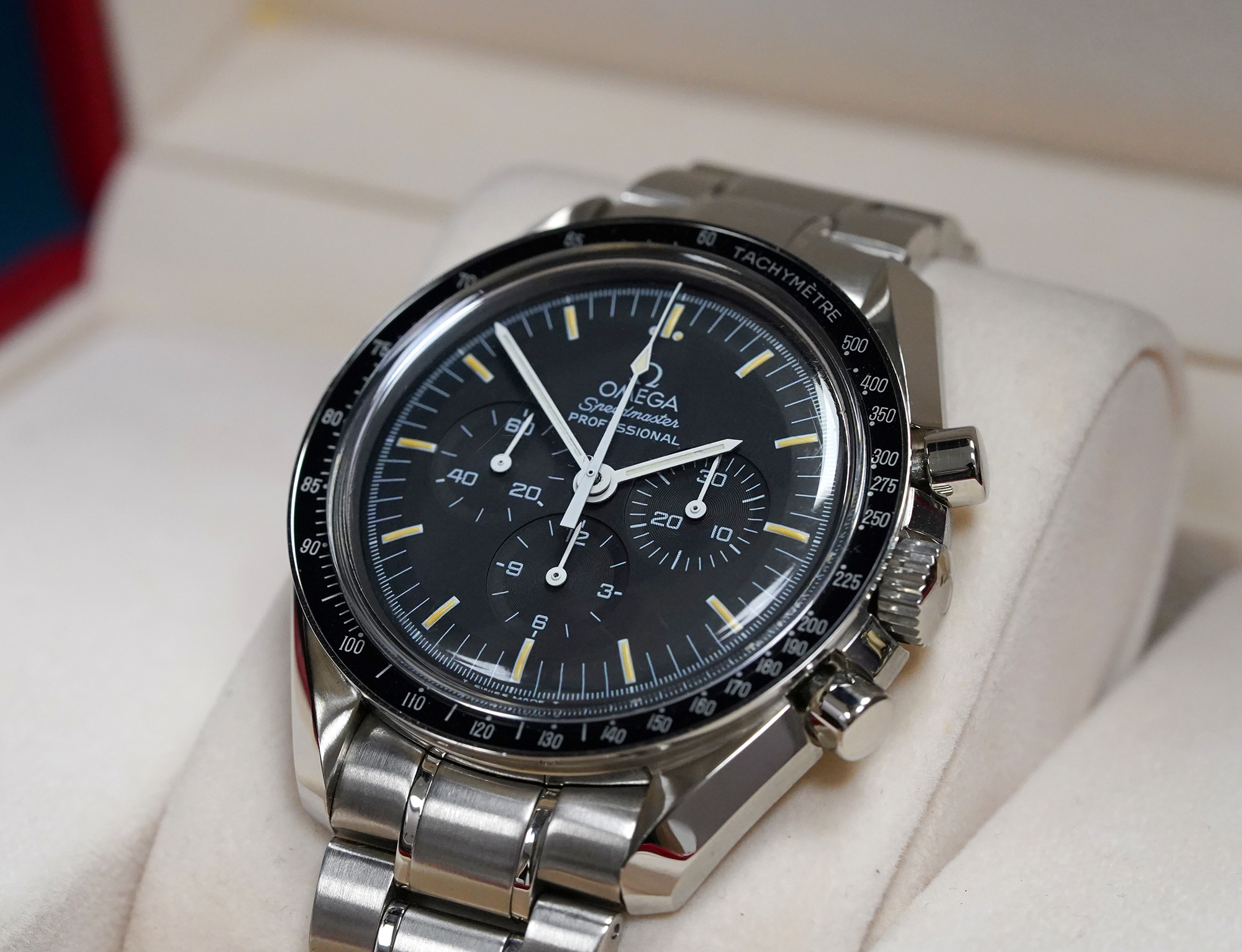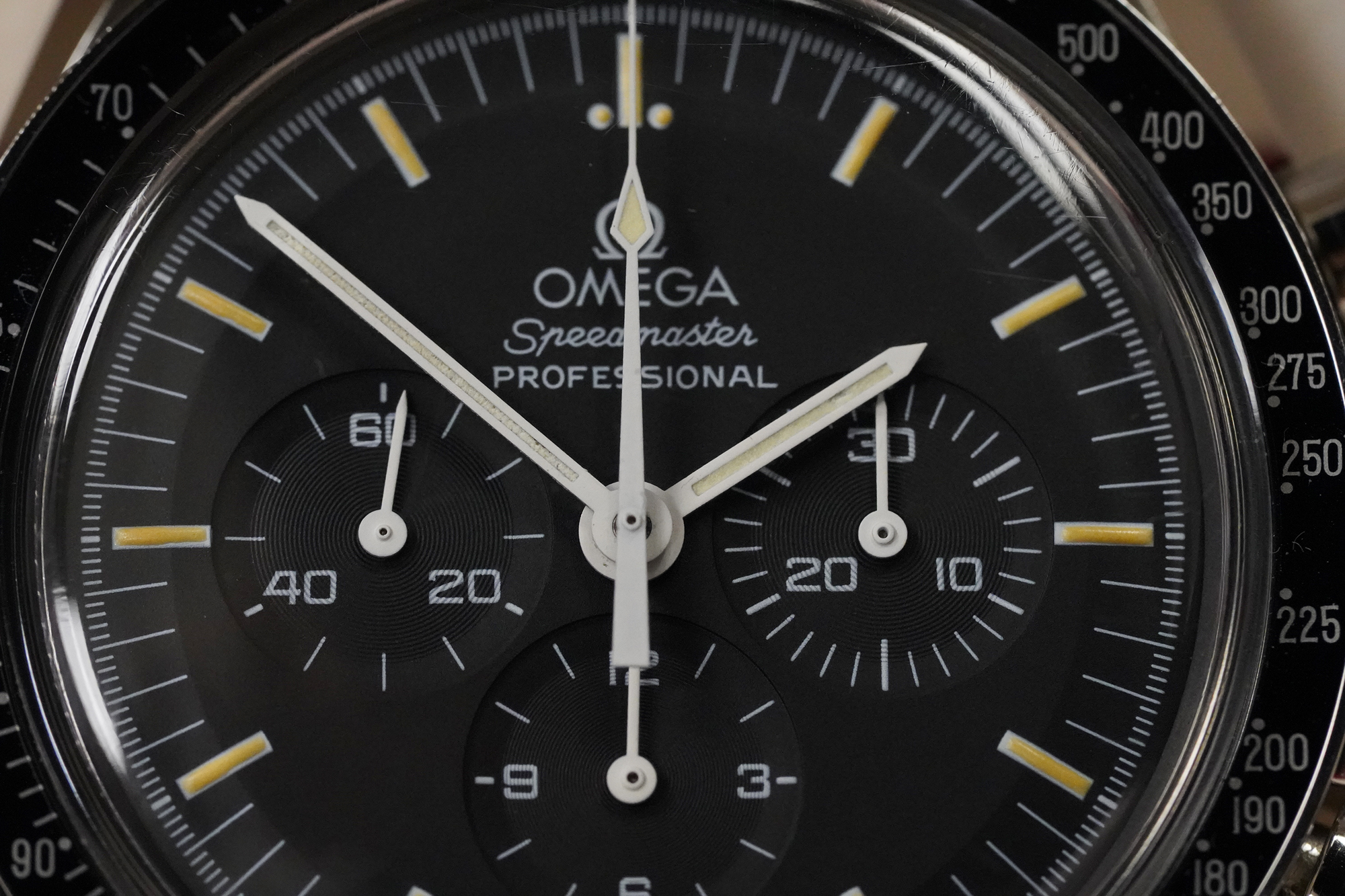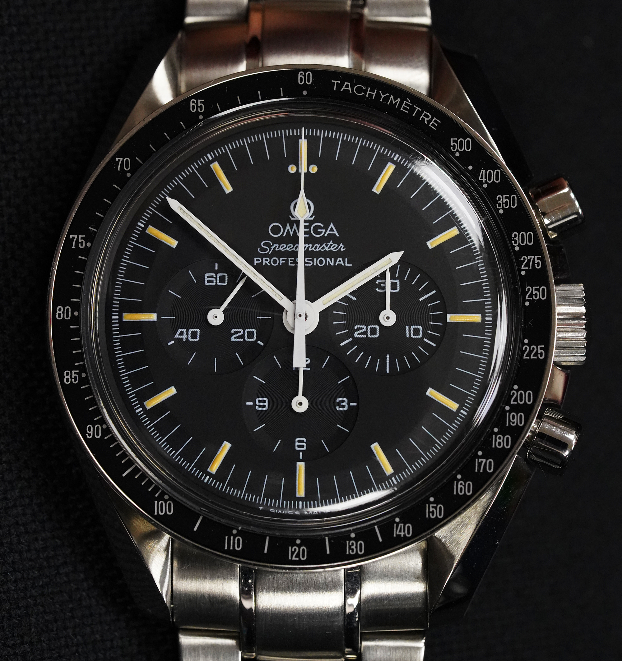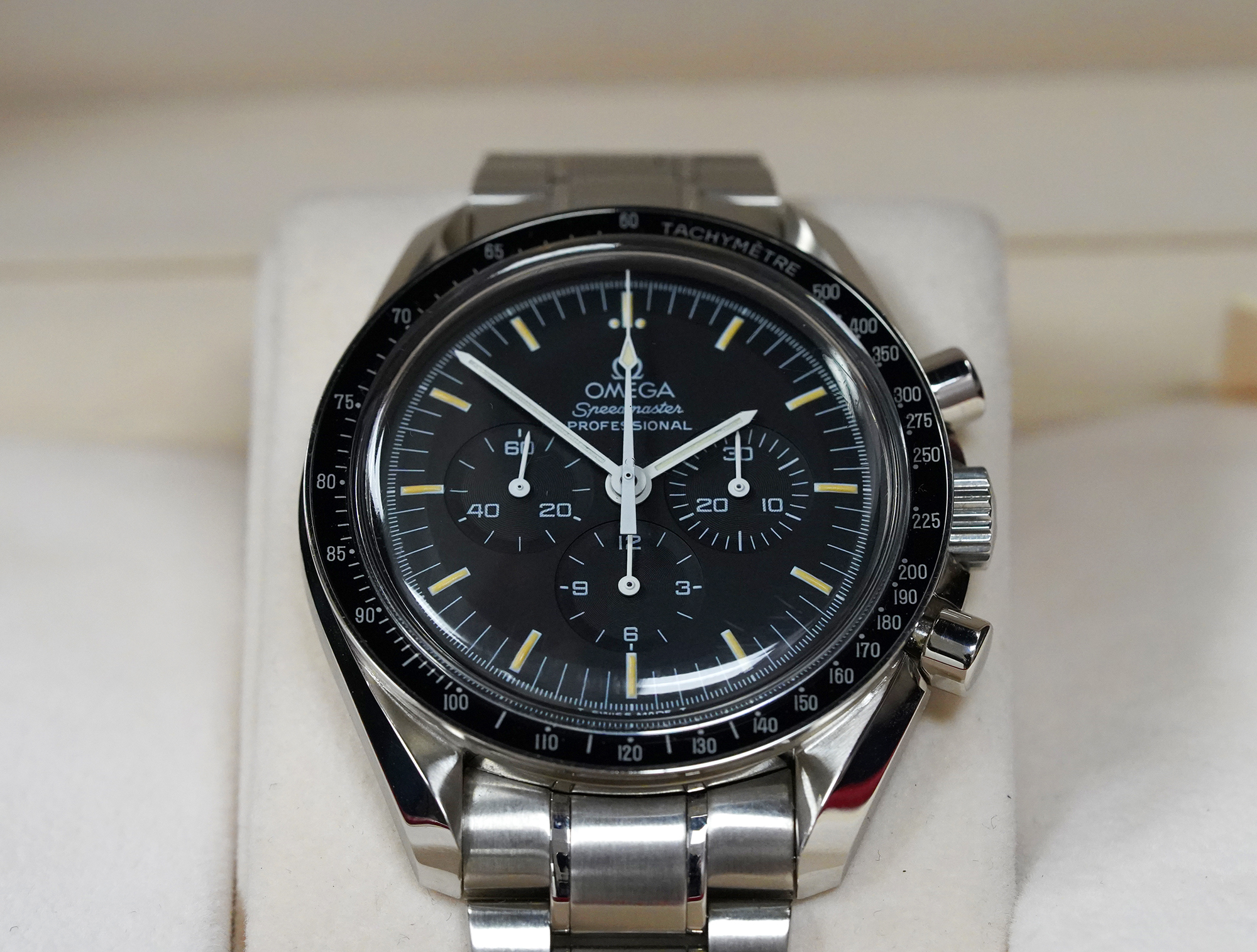 ·For sale Omega Speedmaster Professional 3572.50 with tritium dial and display back. During a very short period, a transitional 3572.50 was produced with the new 1863 caliber and the tritium dial/hands. Many collectors consider it as the best of the two worlds: the more discrete rhodium-plated movement and the yellowish paint of the dial indexes. Tritium markers and hands have aged to beautiful cream shade. Watch comes in Omega box only.