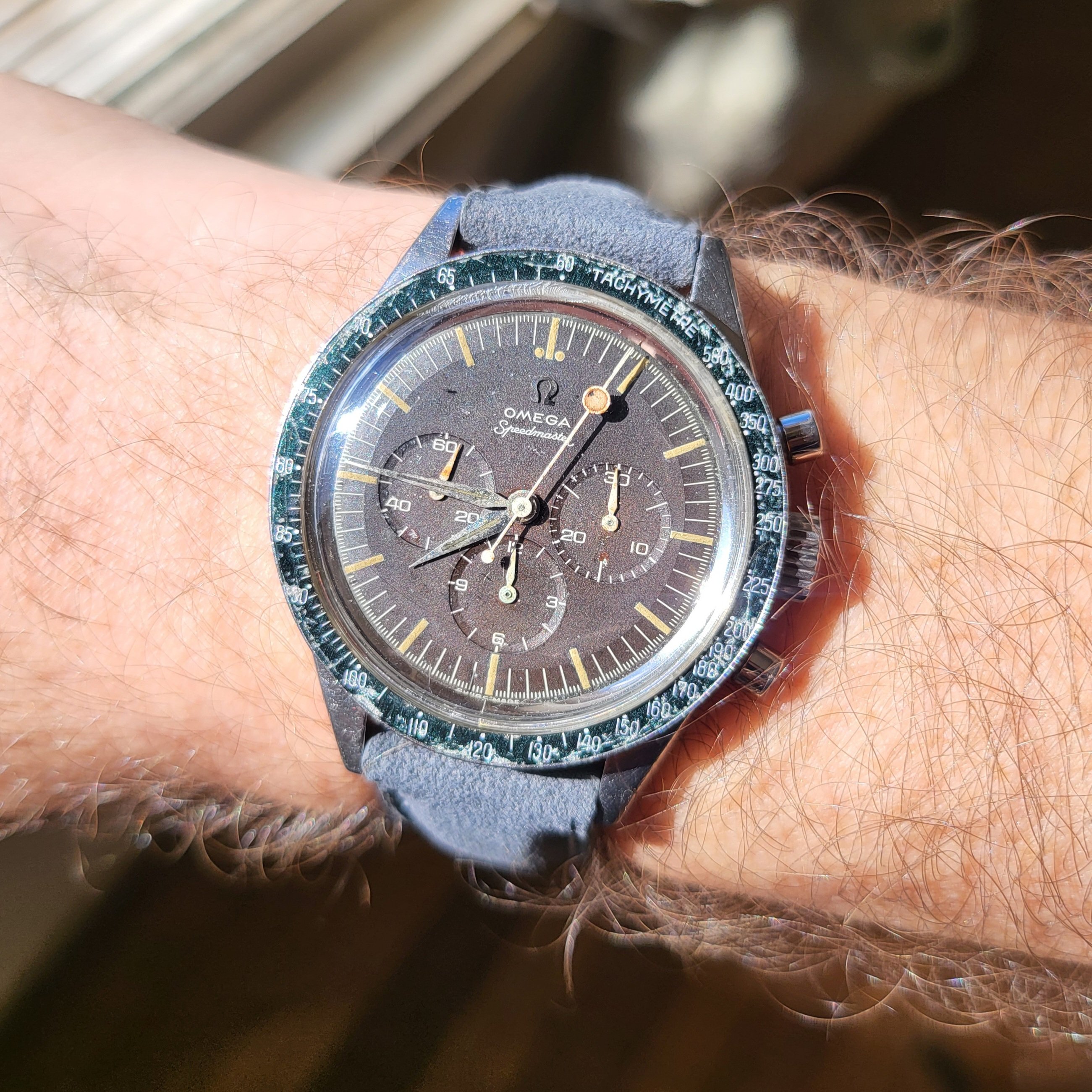 DON bezel in 'ok' condition and has a green hue under certain light. This model should have a Base 1000 bezel according the Speedmaster101/MWO, but the DON looks fine on it as is.