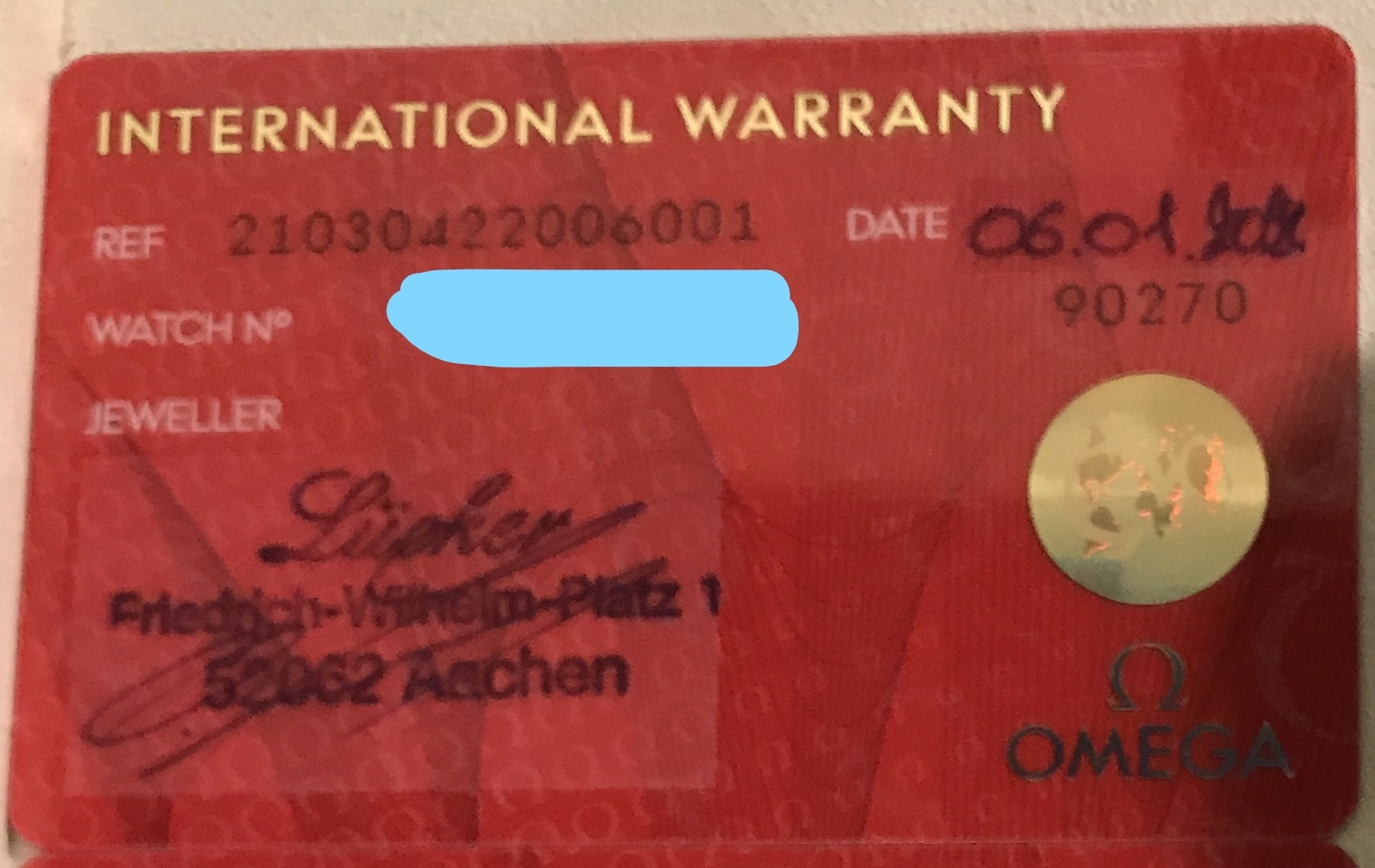 I made my first purchase last week on chrono24, buying an Omega Seamaster 300m. Item was listed as brand new and seemed to be all in order. I took the watch to my local Omega Authorized dealer and had the watch appraised for insurance reasons and to have the watch's authenticity verified. The appraiser told me that she could not appraise the watch because she believes the warranty card to be fraudulent, and it would not be accepted if I needed to make a claim with Omega. Attached you can see the sticker like material on the card where the dealer's store is written (somewhere in Germany) and a date is written (not when I purchased the watch). This lady at Omega said that this is not authentic and could easily be removed.