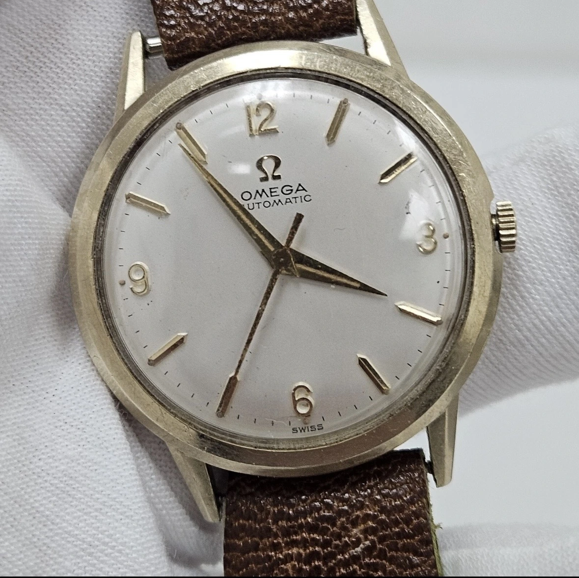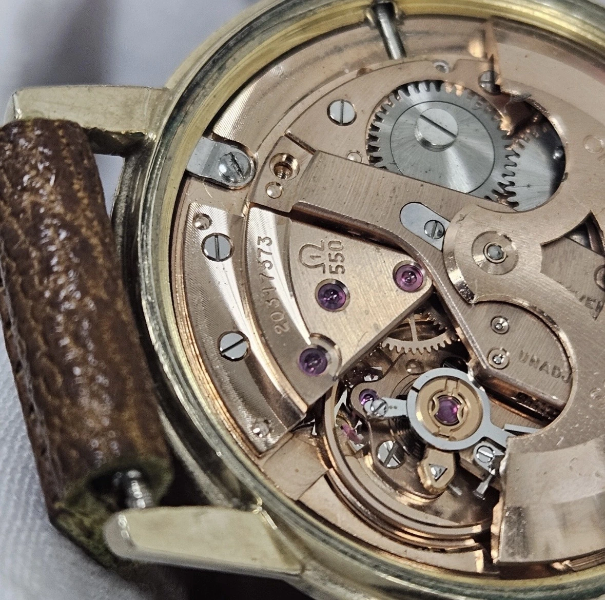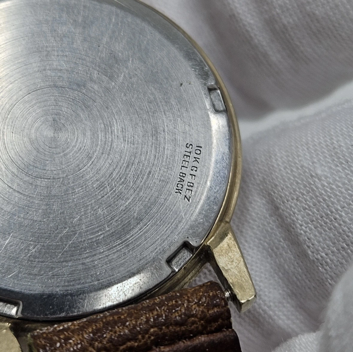 Gold-filled base and embossed dial are signatures of an entry-level piece. I believe that I see some minor brassing on the edges of the lugs. The movement is of course, high quality, but the low jewel version for US import and I see some wear on the rotor.