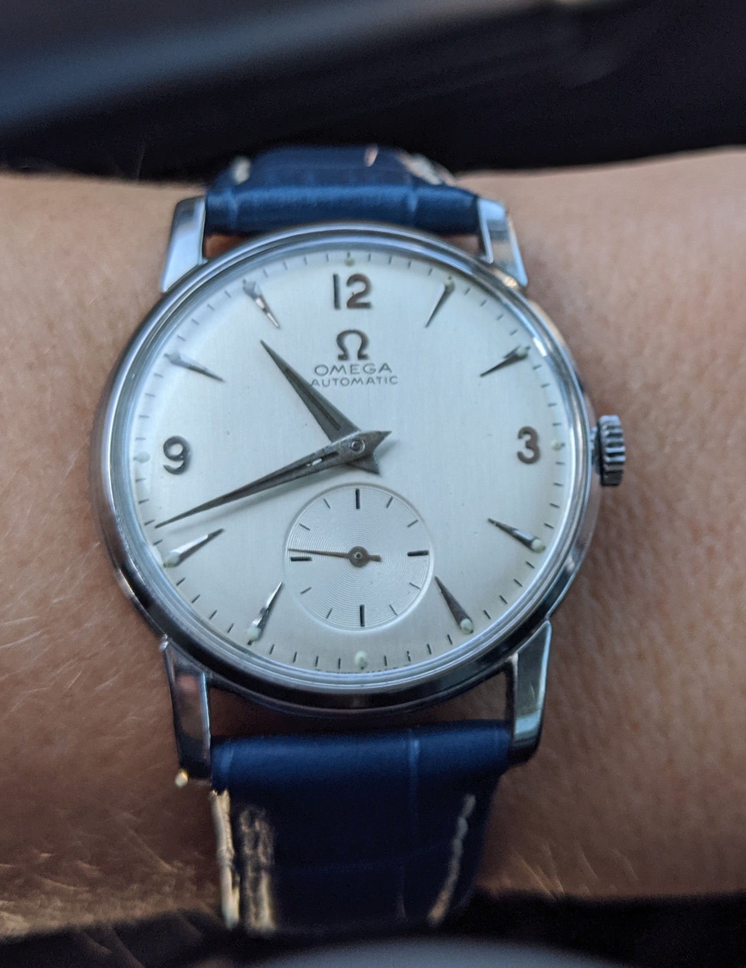 I've researched ebay and this forum comparing the different details (minute and hour markers, shape of the hands, etc) but there are so many differences (and fakes) that I'm not sure of the year. I am confident in saying that it's from 1950-1959 but I'd like to narrow that down instead of just a specific decade. Example: Here is a link to one for sale - notice the hands.. The hour hand doesn't reach the marker - Would that be indicative of the year/style?