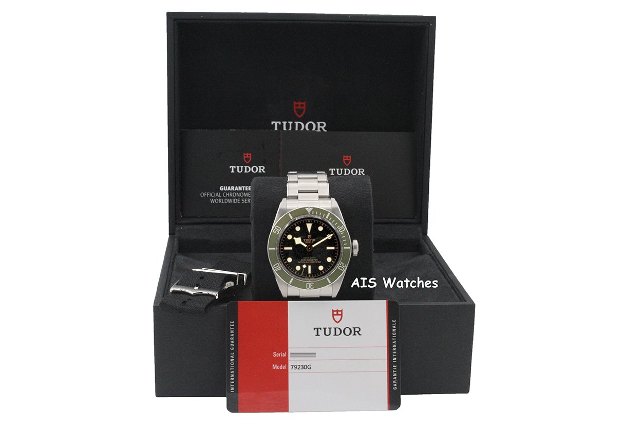 Up for sale is a Tudor 79230G Heritage Black Bay Green Harrods Edition Stainless Steel / NATO Box & Papers. The timepiece is in excellent condition.