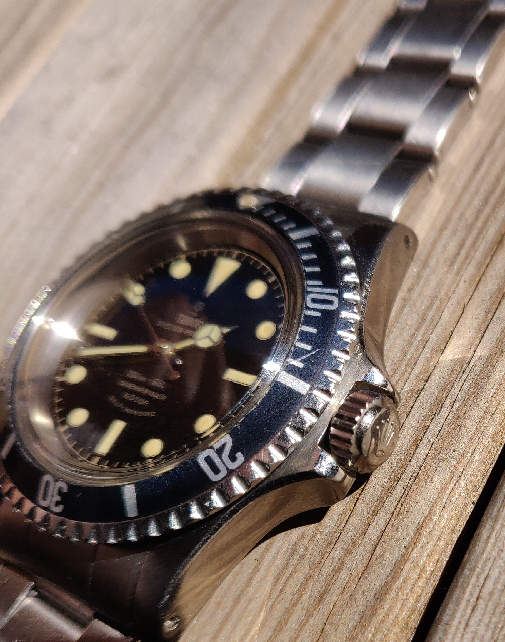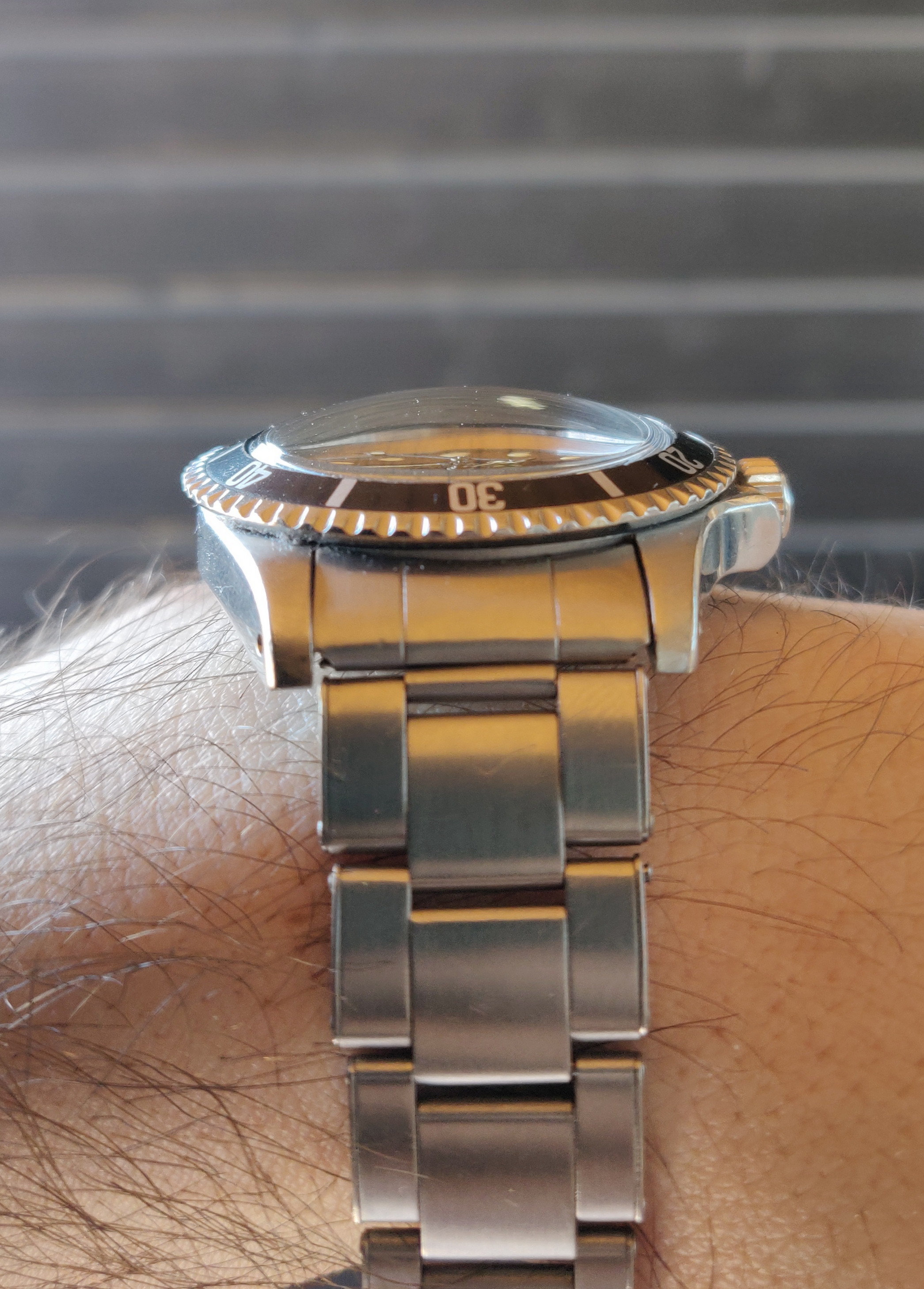 The good:Case and dial is good looking. Case is fat, lugs have visible bevels and caseback is correct. Crown is correct (Rolex). Hands are original and correct flat type. Bezel is original and insert has a slightly faded dark blue/gray tint to it. The lume is gorgeous, in outstanding condition..