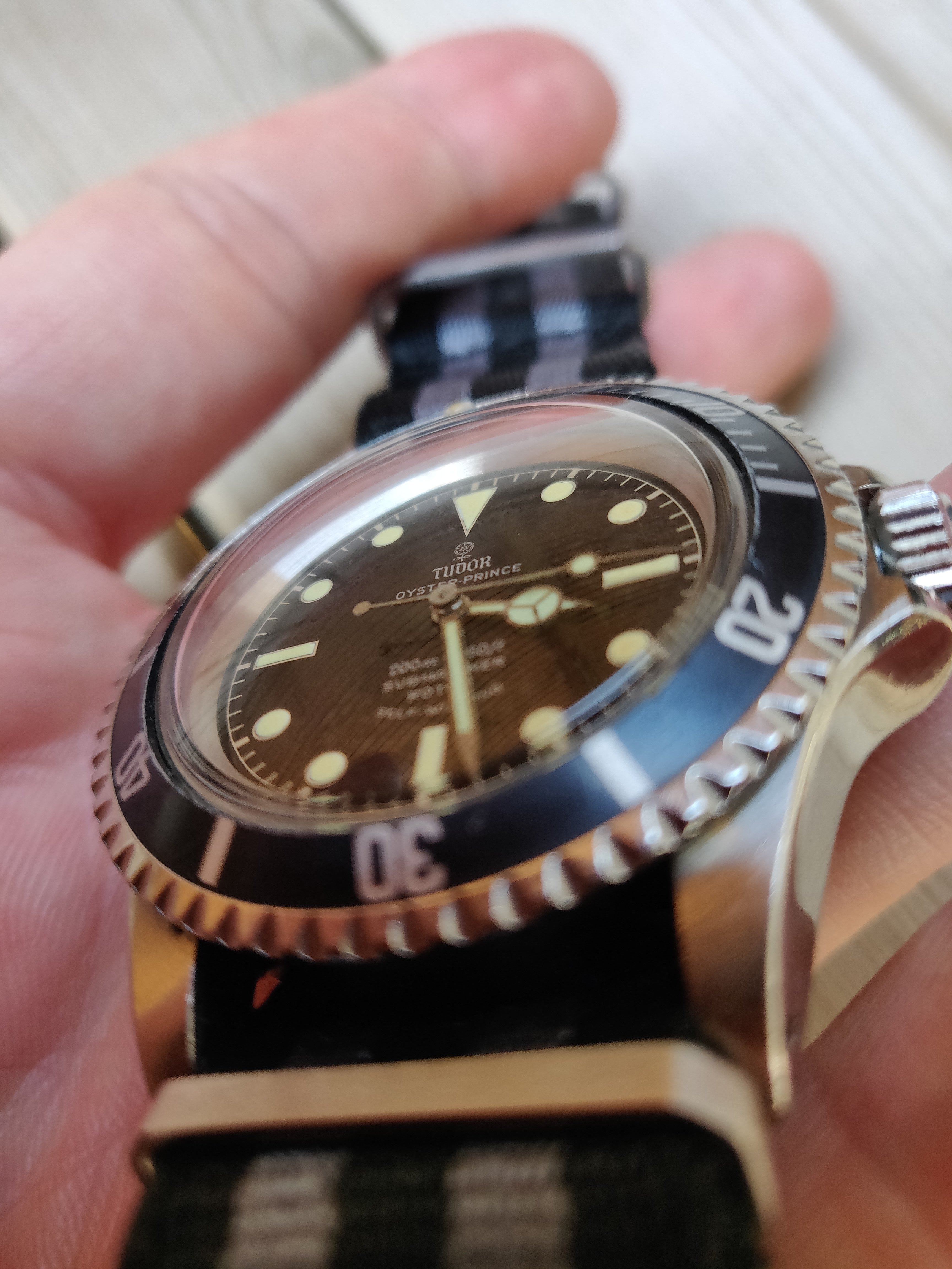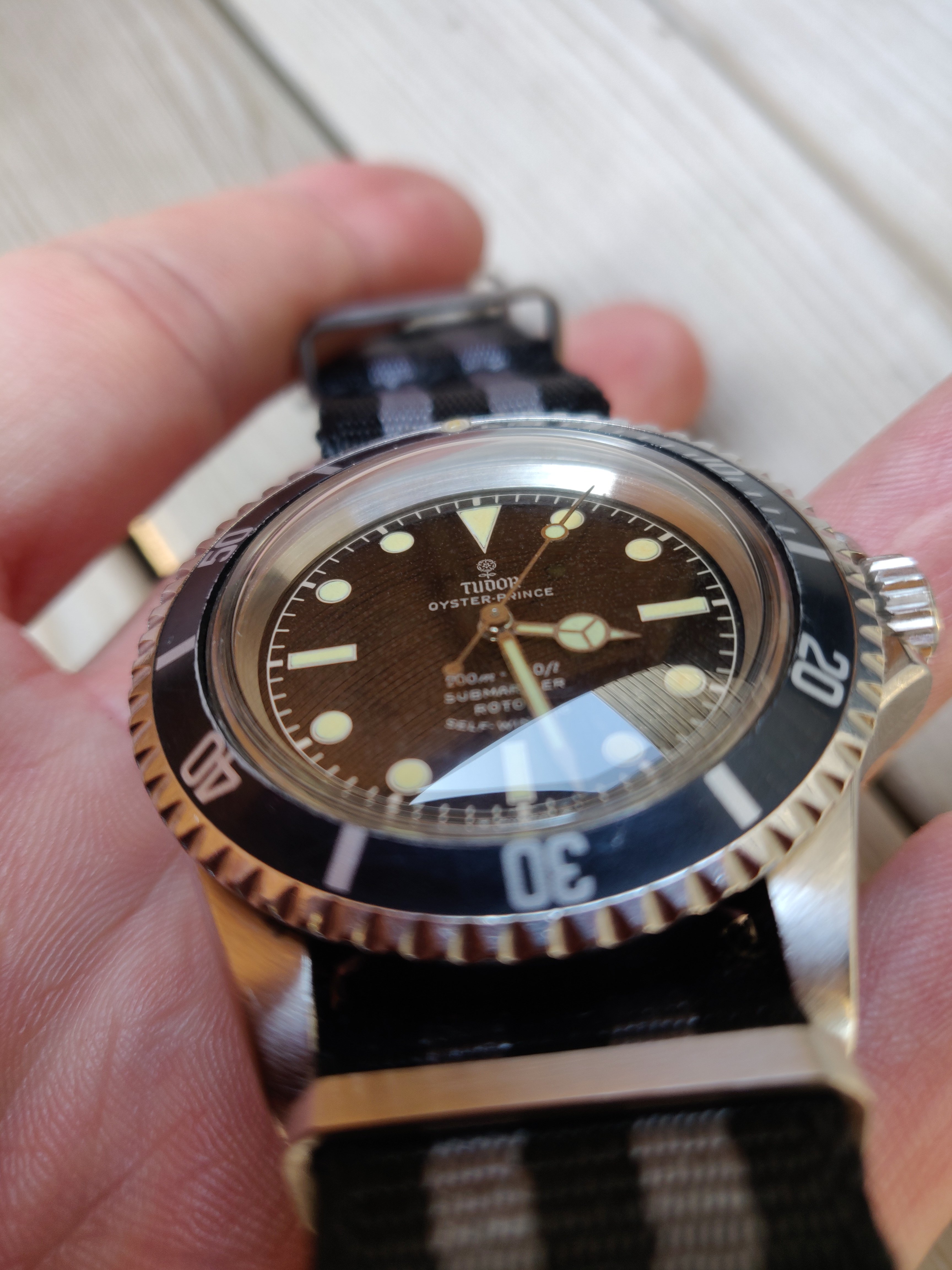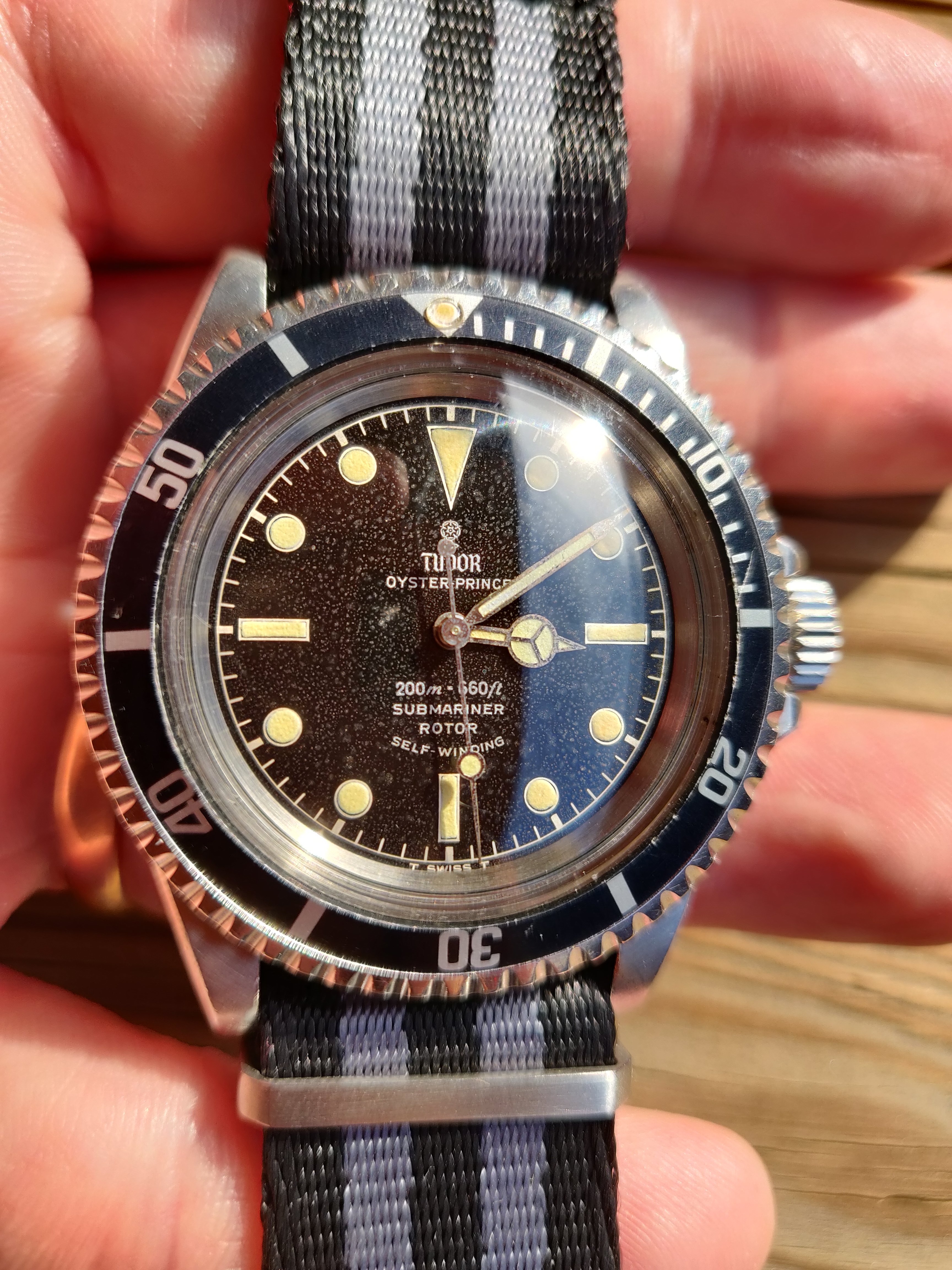 The bad/what you should know: Case has seen some life, so there are some lights scratches and dings on it. The insert has some minor scratches. The dial is not a "perfect" glossy anymore and shows a quite typical patination. Some have described it as "oil slick-patina", "star-patina" or just patina. Some like it , some don't.