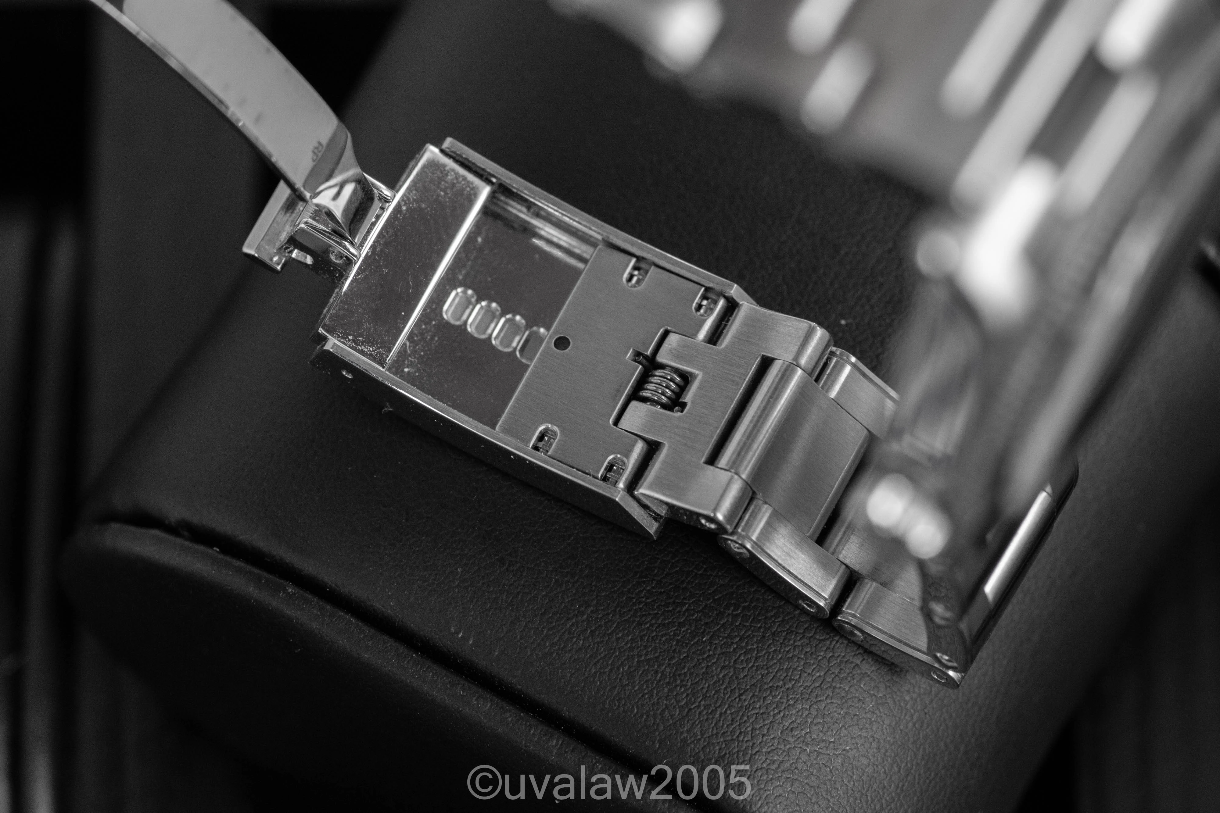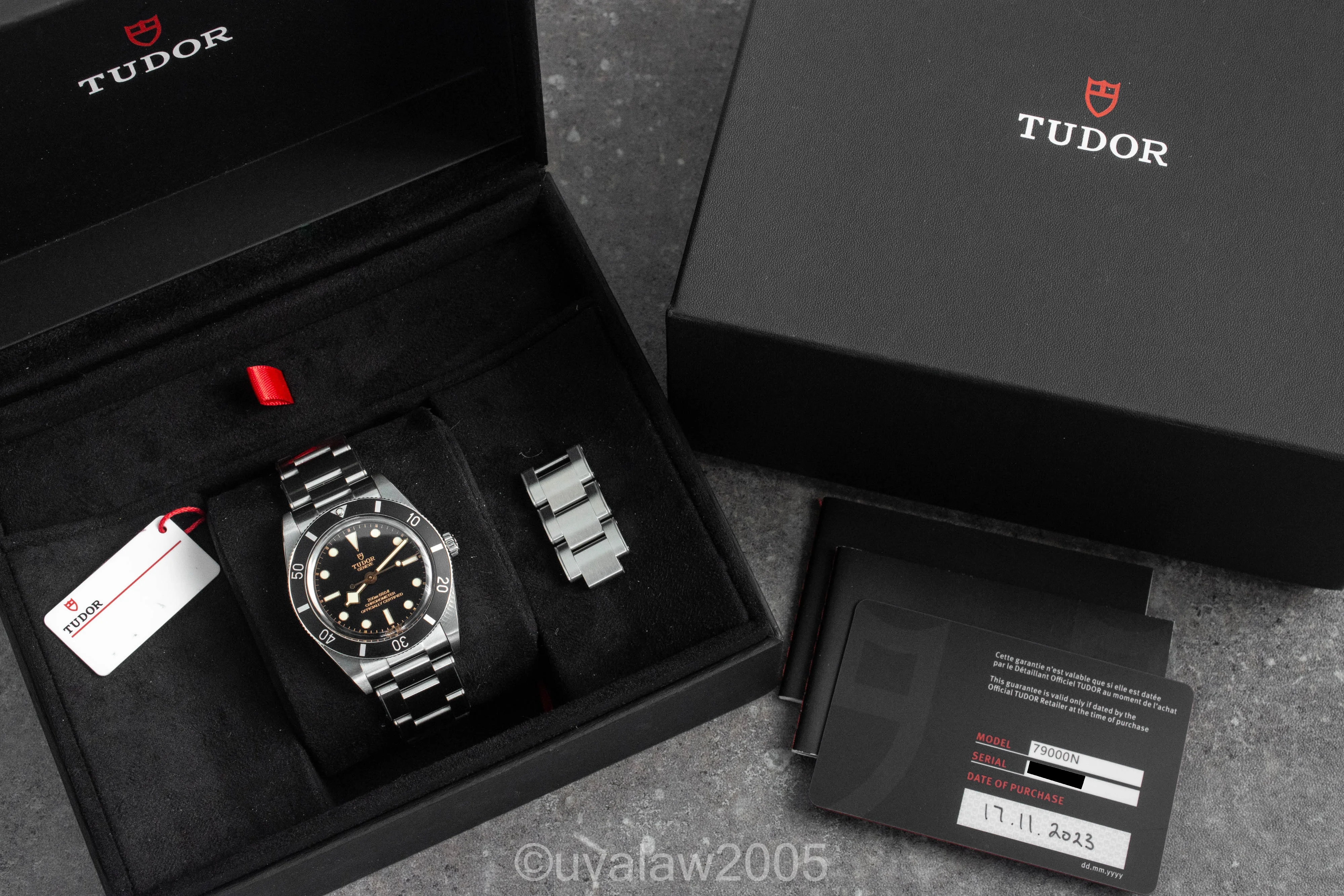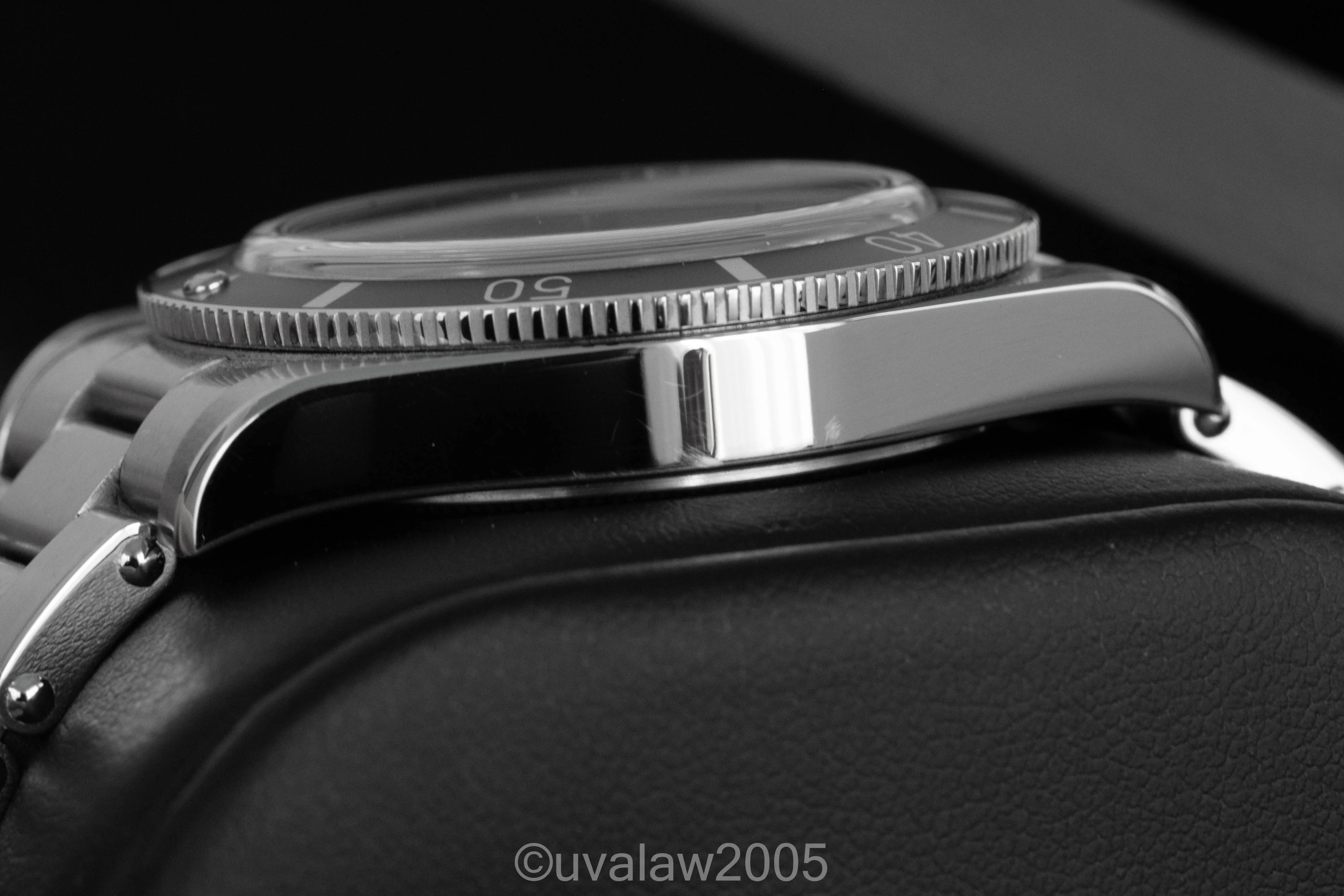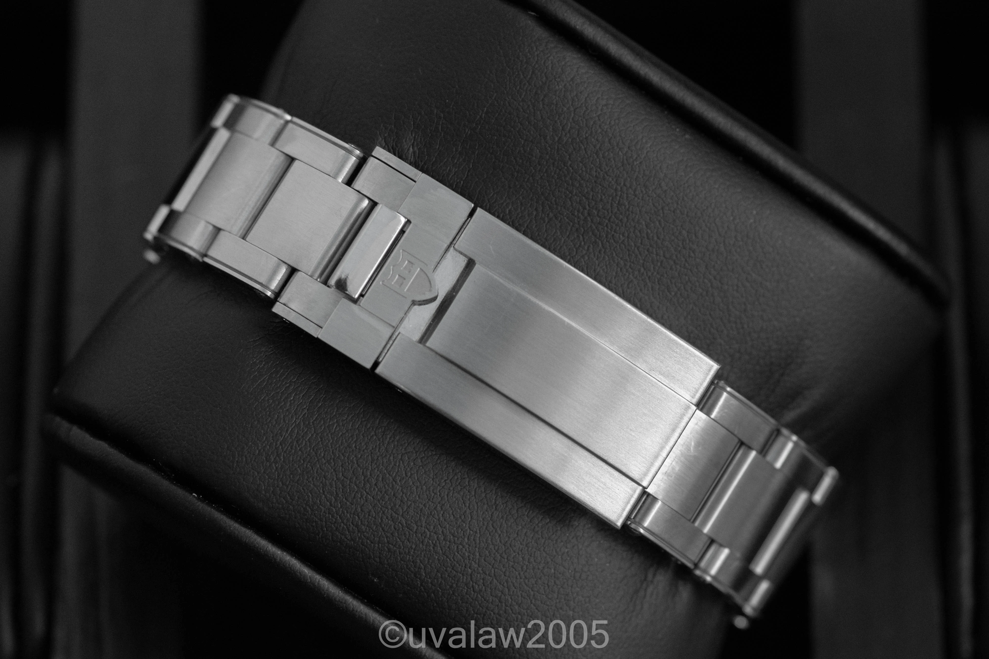 Comes with inner/outer box, sleeve, manual, hang tag, all links, and warranty card dated November 2023; warranty runs through November 2028. There is surface wear to the highly polished areas and links and a few strap change marks. Lots of high resolution photos below for your review.