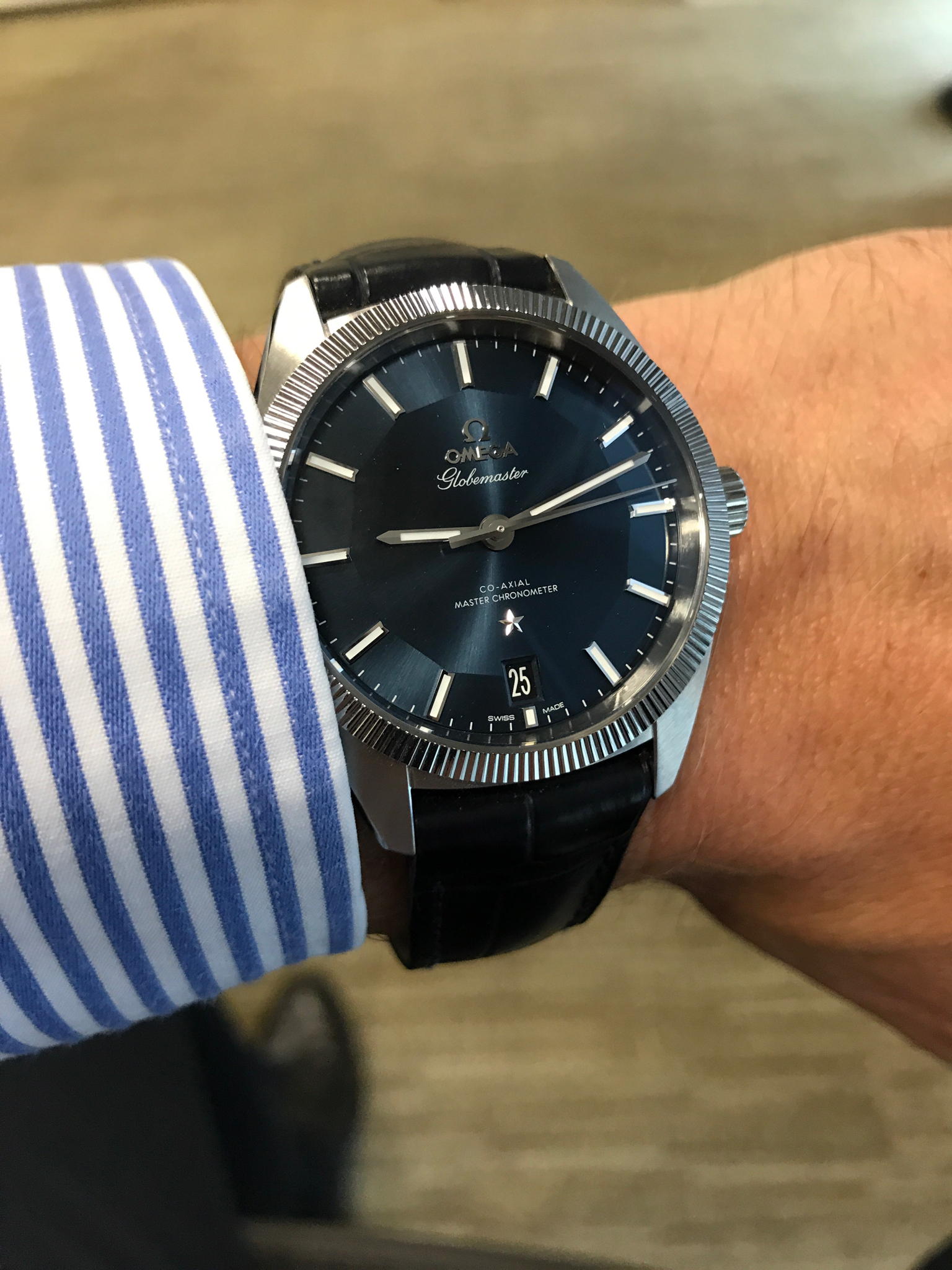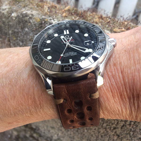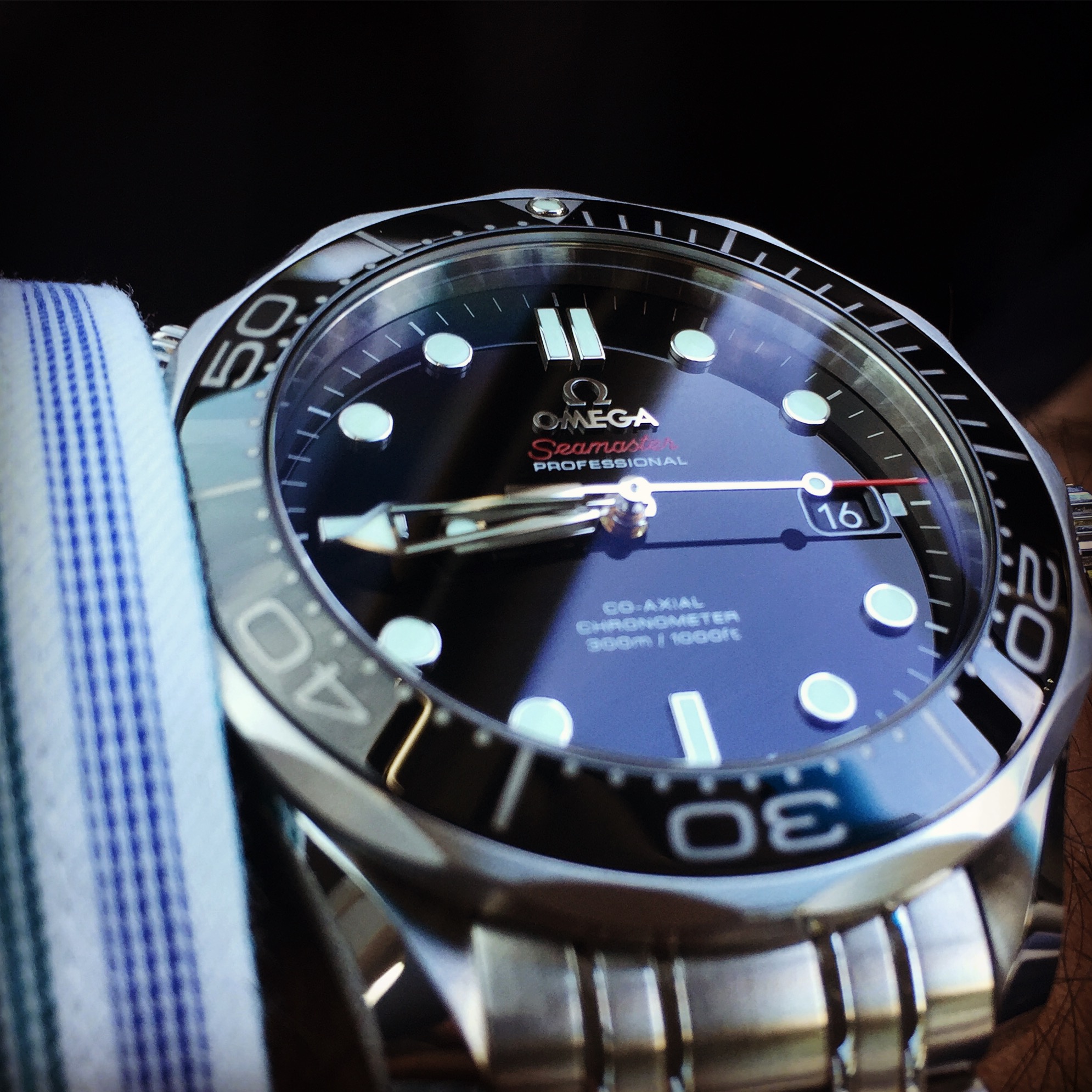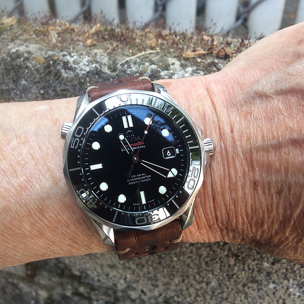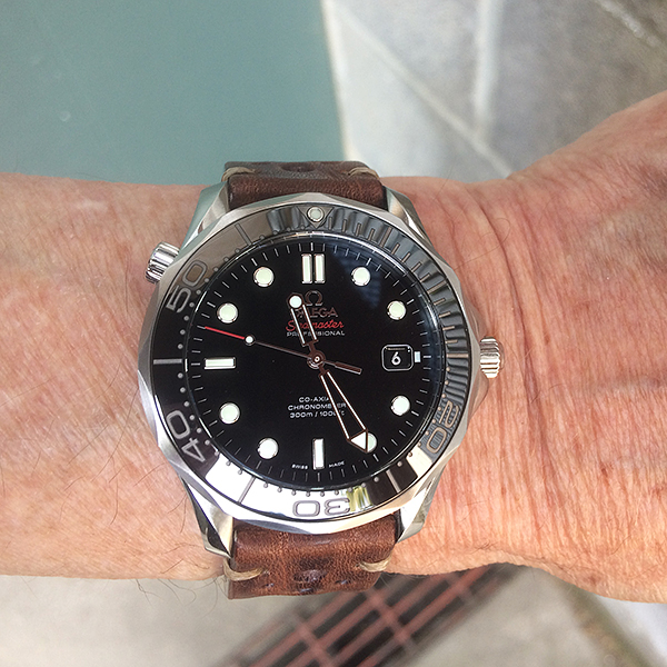 I've got skinny 6.5" wrists and my only other Omega is a 2500 Aqua Terra shown in my avatar. I was concerned that the SMP would be to big for my wrists, but to my delight, it wears beautifully. I put on a dark brown leather rally strap and holy crap! This thing is beautiful.