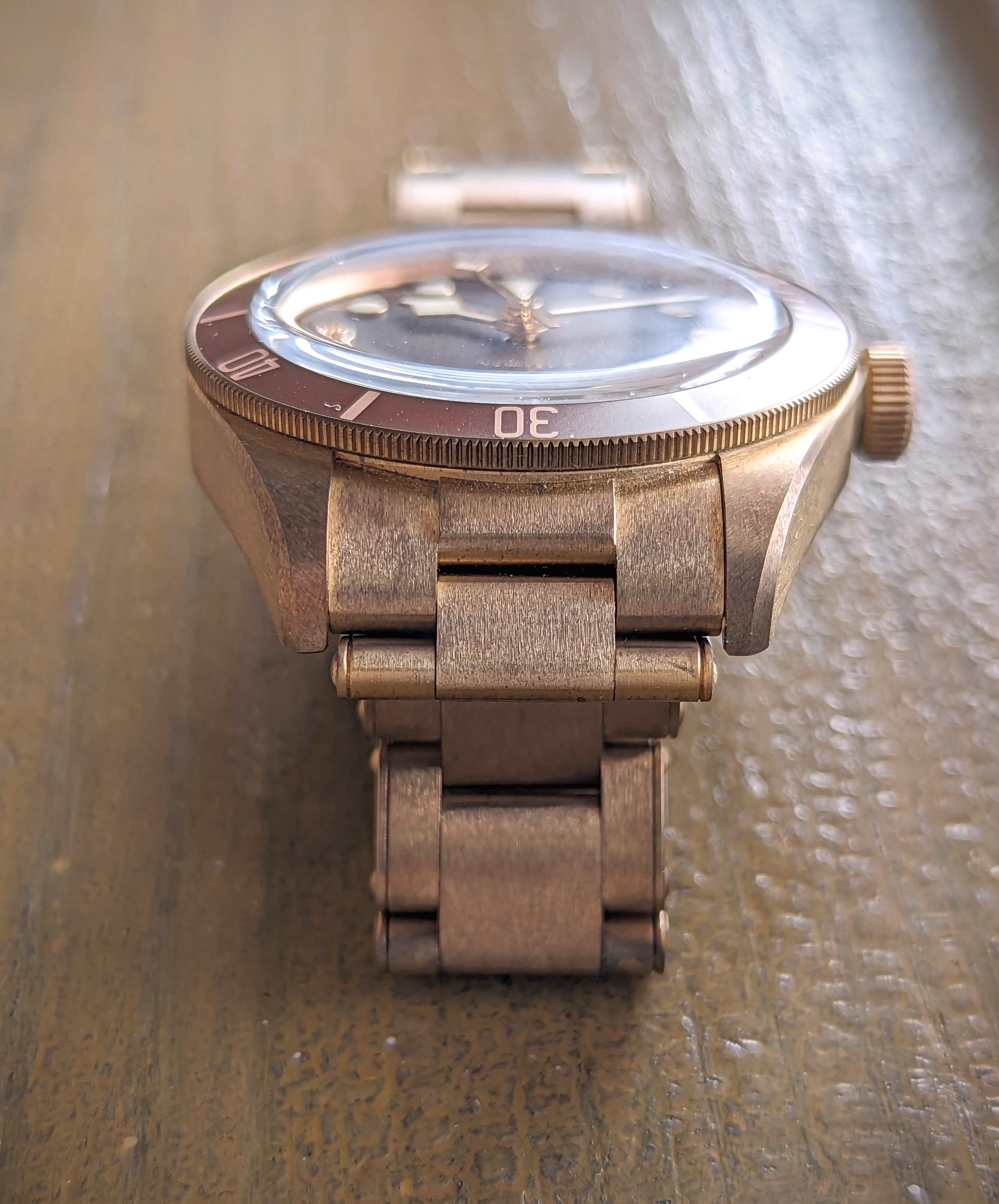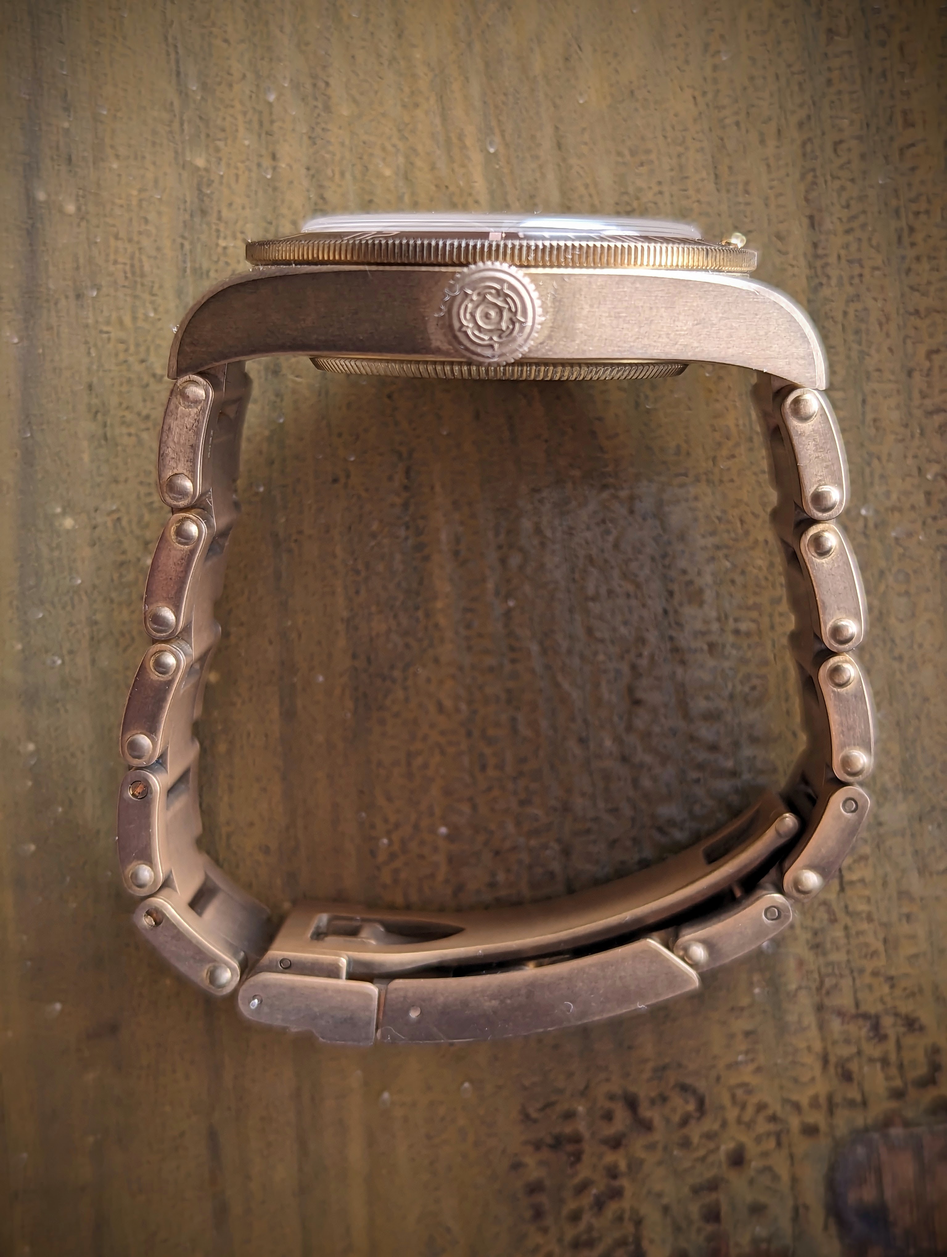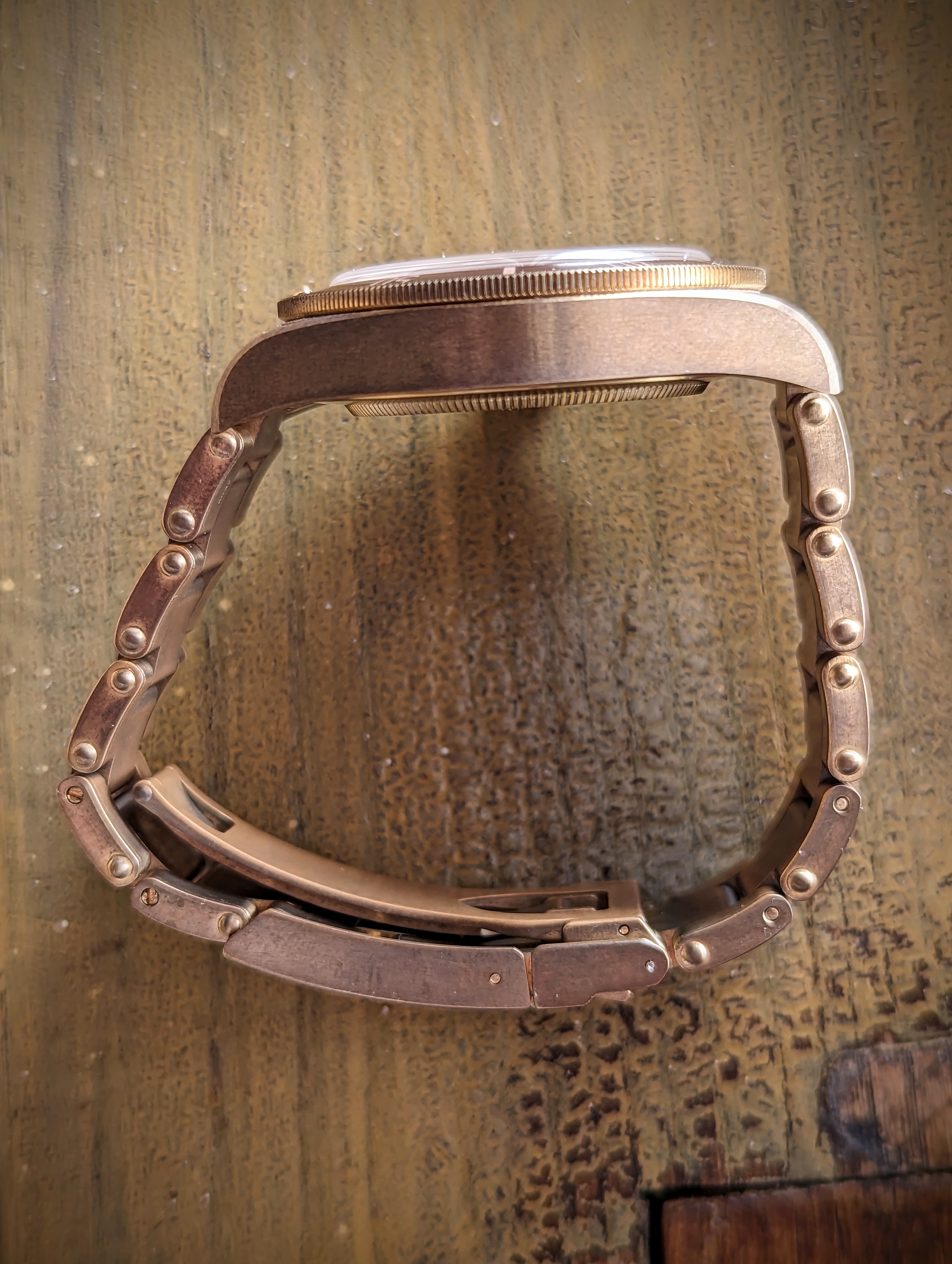 The watch is running well, and as you all know, due to the bronze alloy, the case and bracelet have developed some patina over time. The watch has been worn sparingly and is in very good condition without signs of scratches or dents.