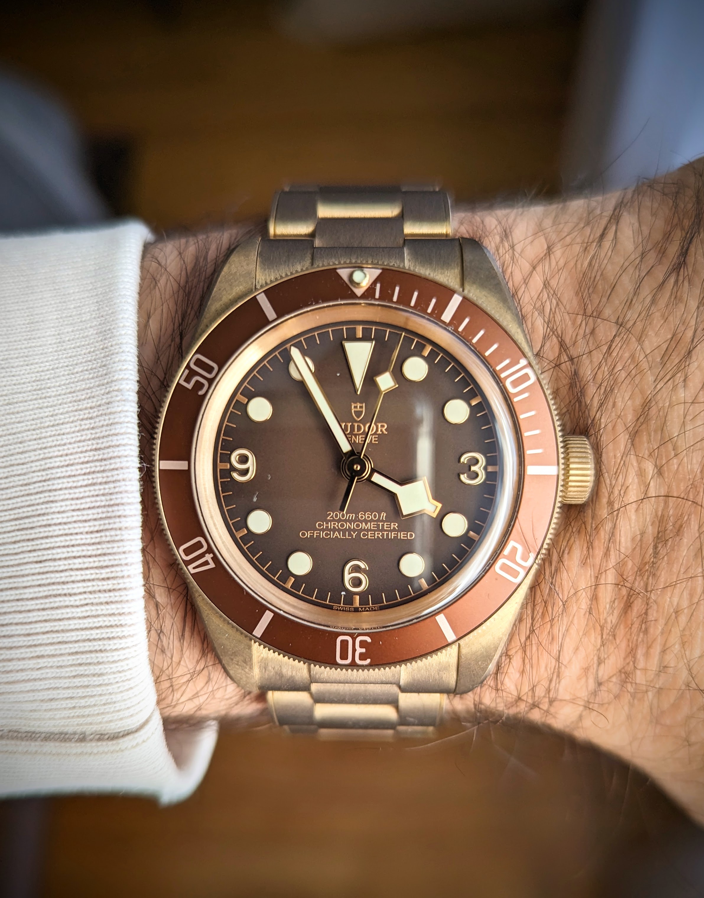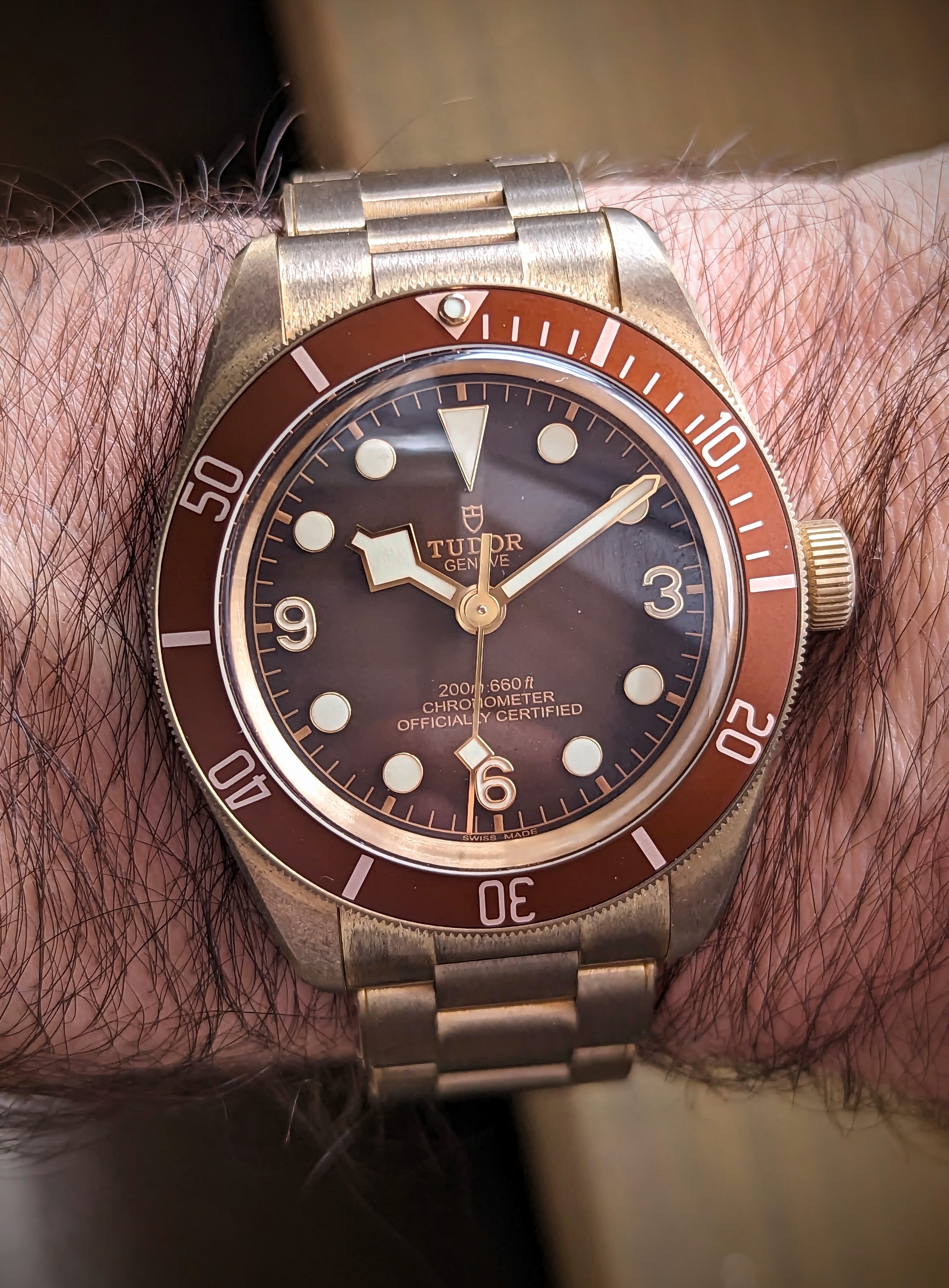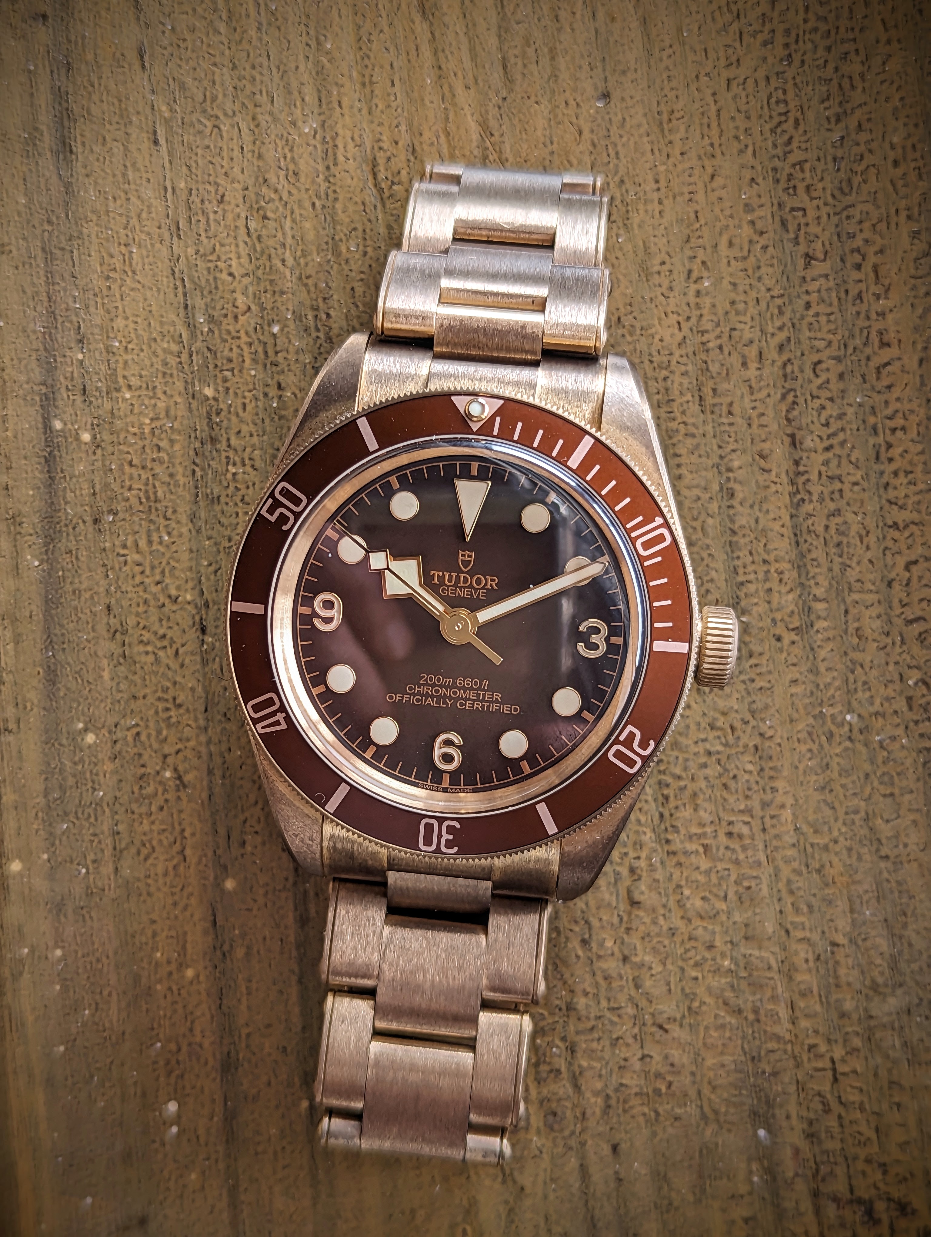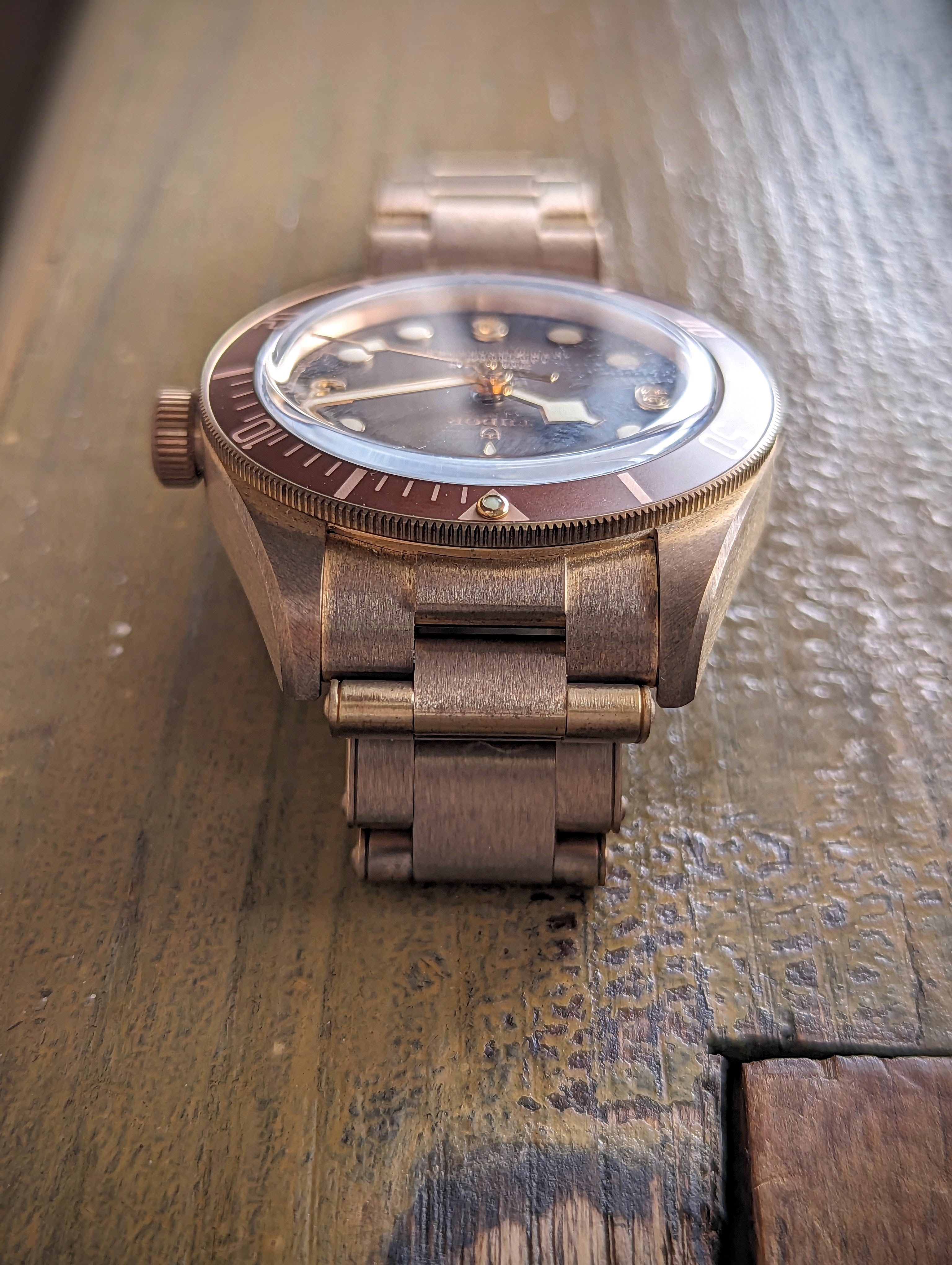 The watch is running well, and as you all know, due to the bronze alloy, the case and bracelet have developed some patina over time. The watch has been worn sparingly and is in very good condition without signs of scratches or dents.
