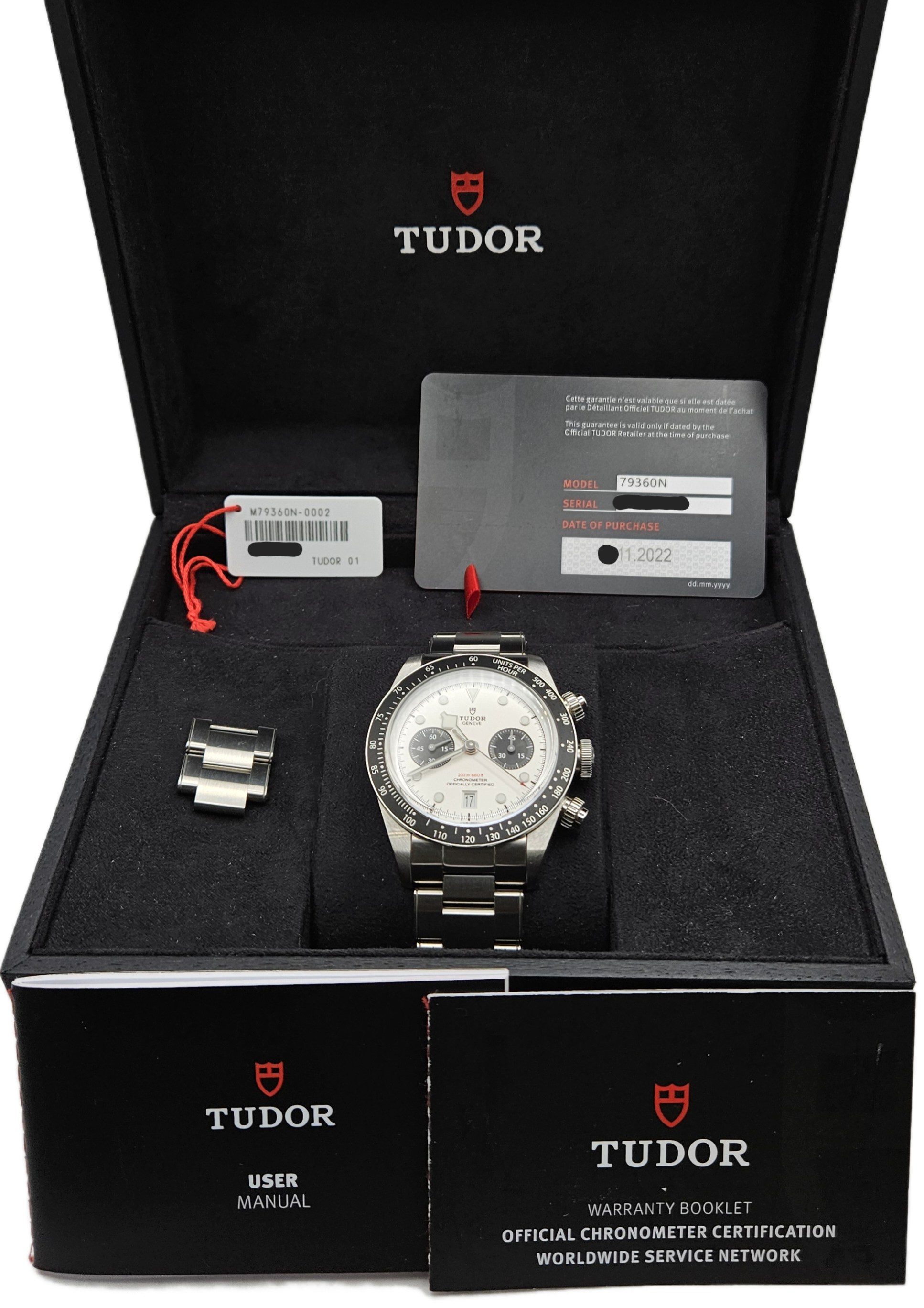 Box, Card, and Accessories: Outer black cardboard box (not pictured) + inner presentation box, warranty card dated NOV 2022, serialized white tag, user manual and warranty booklet, the remaining links to complete the full length bracelet