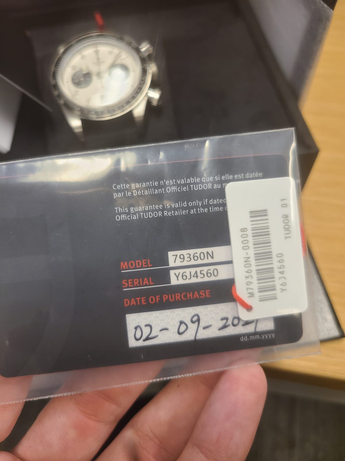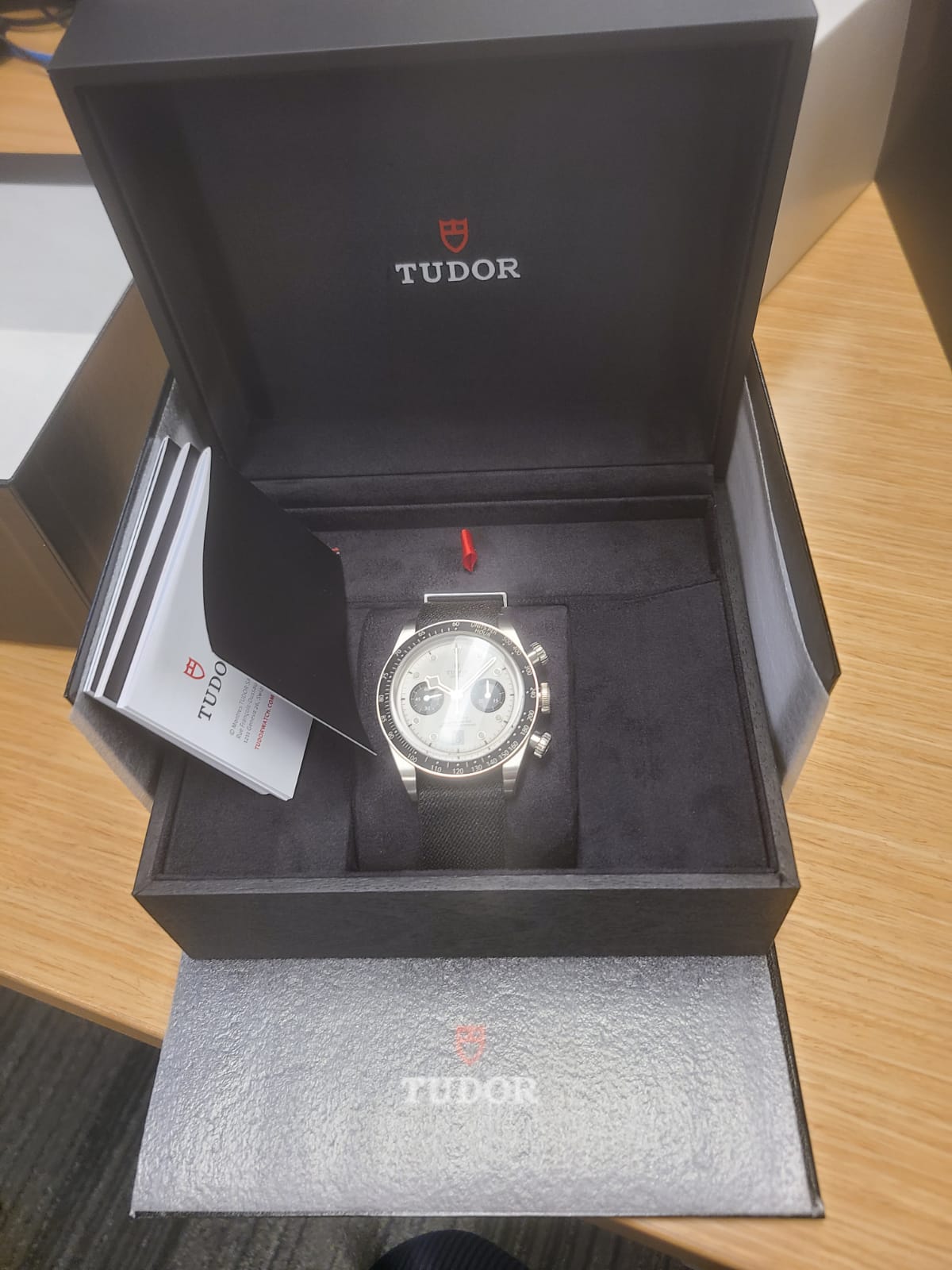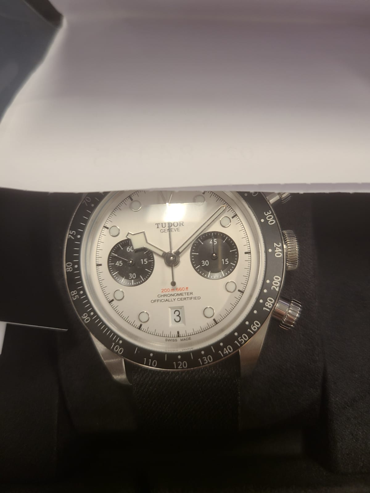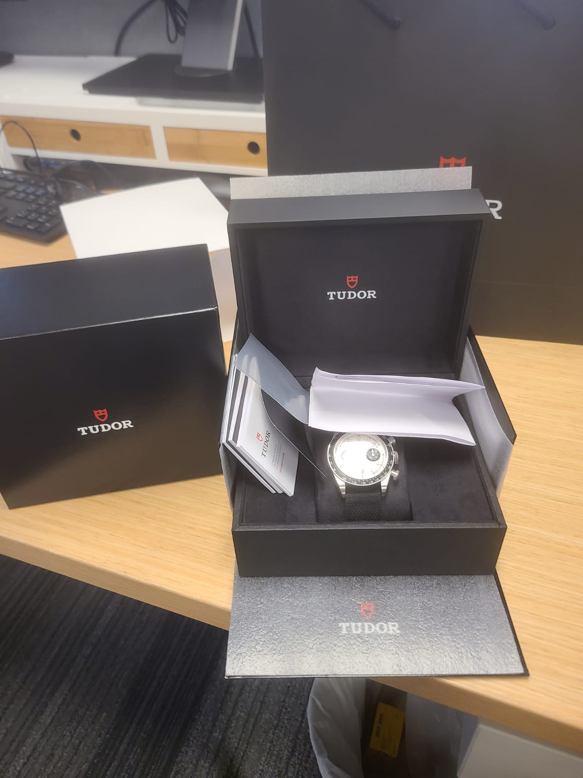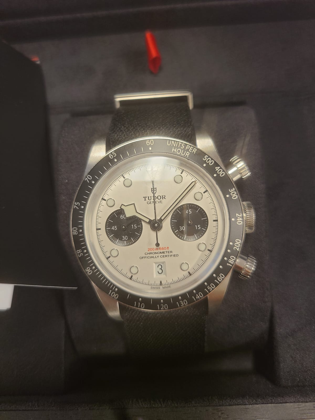 I am selling this Panda Black Bay Tudor Chronograph on behalf of a colleague. They bought it yesterday for their boss who decided he didn't like it and now needs to sell it. Looking to get what they paid for it - $5500 USD. It is brand new never worn. The card is dated to yesterday. It is sold on a nato so not with the bracelet. It comes with everything - box, card, etc.