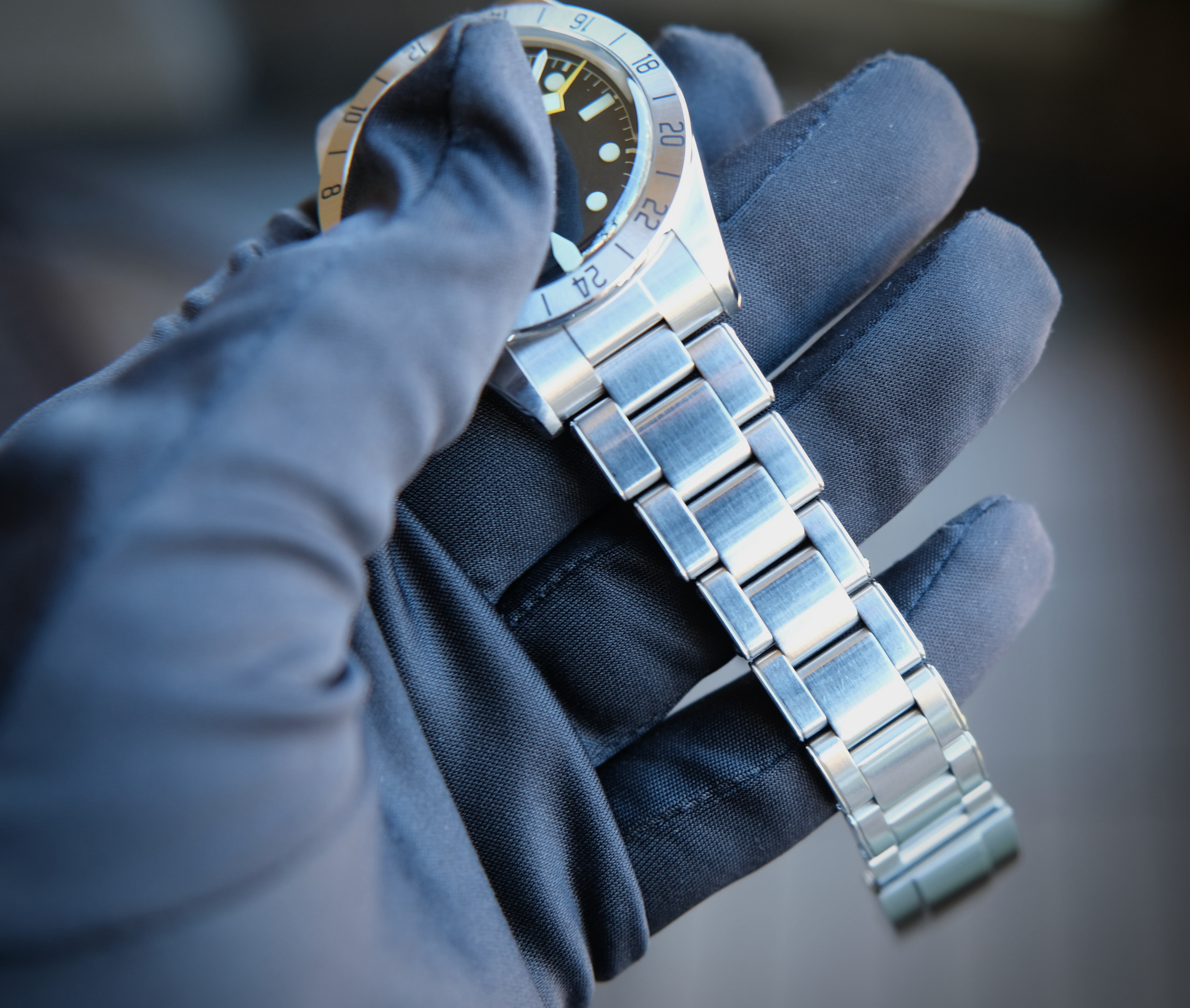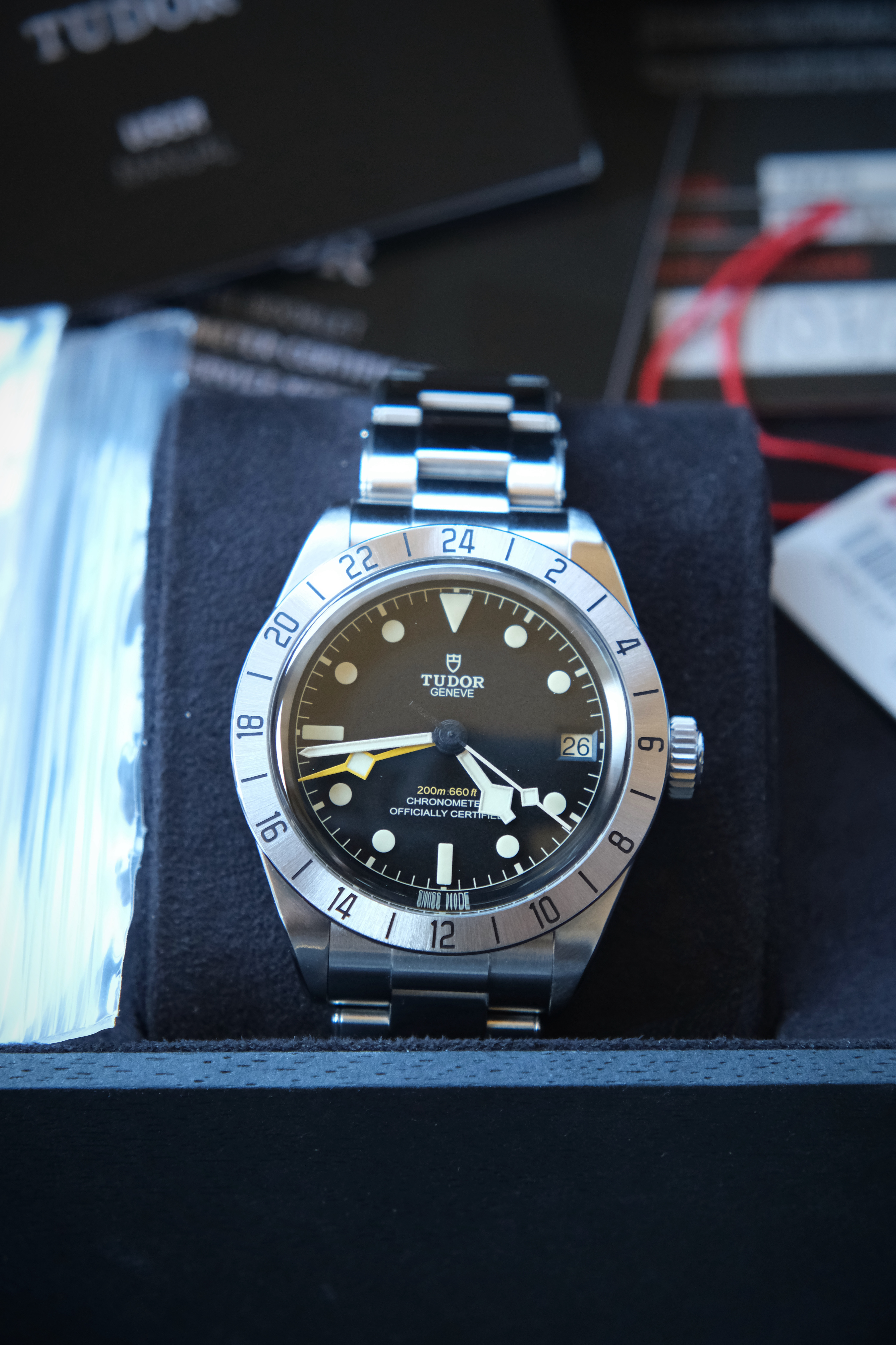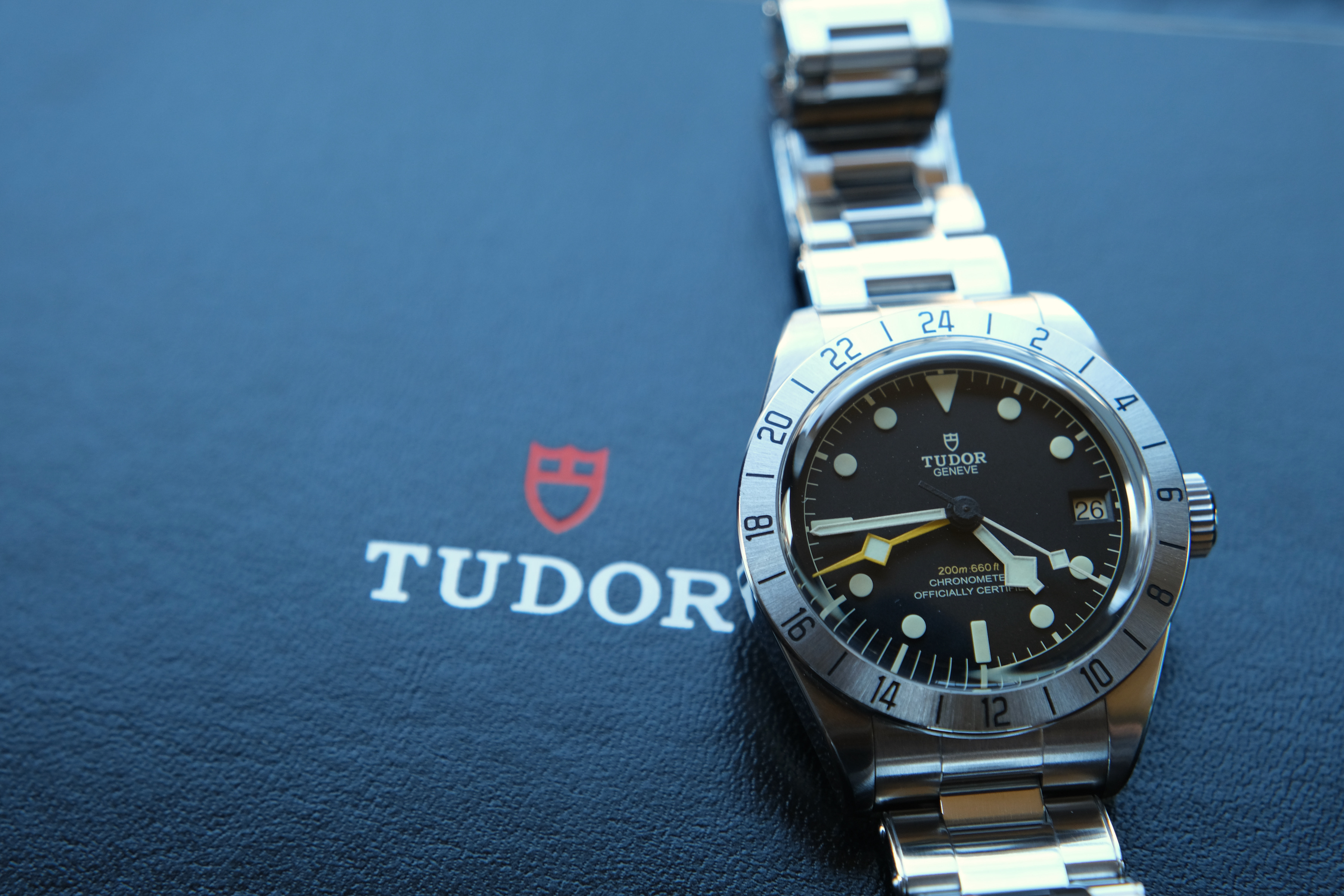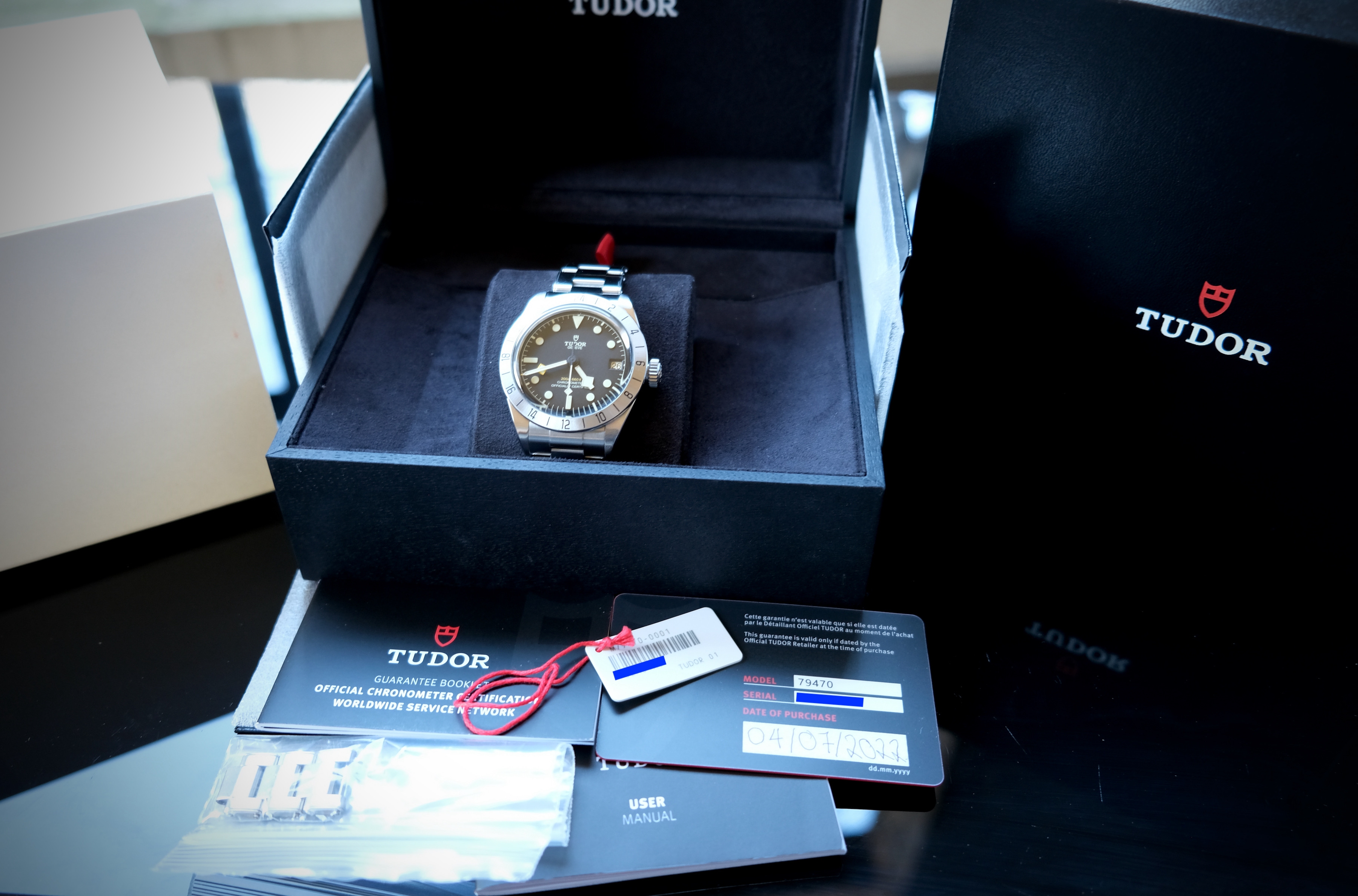 Up for sale is my Tudor Black Bay Pro, which was purchased from an authorized dealer on July 4, 2022. The watch comes full set with inner and outer boxes, hang tag, removed bracelet links (the bracelet is currently sized for my 7 inch wrist), instruction manual, warranty booklet, and warranty card. There are a superficial marks on the polished surfaces, which are exaggerated in appearance in the photos below and could be buffed out with a Cape Cod cloth. One of the bracelet screws also has some marks on it (also pictured below). Overall, the watch is in excellent condition.