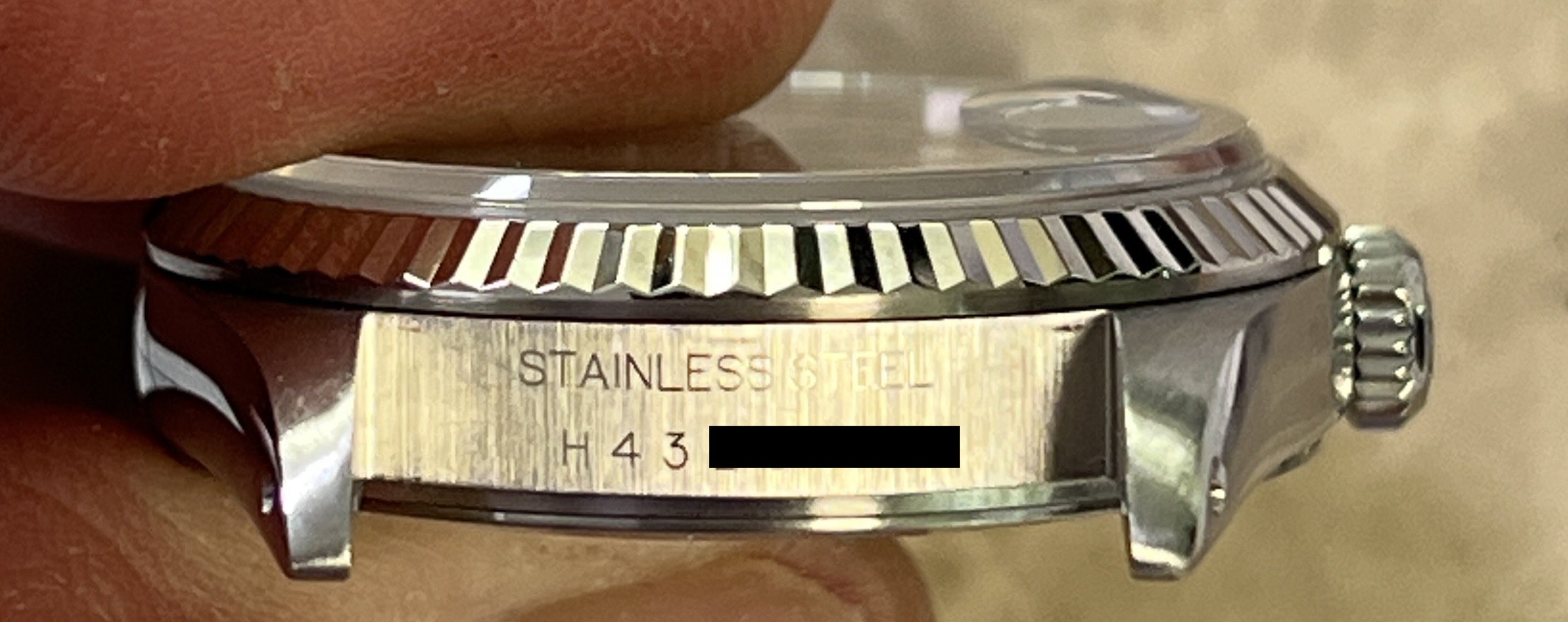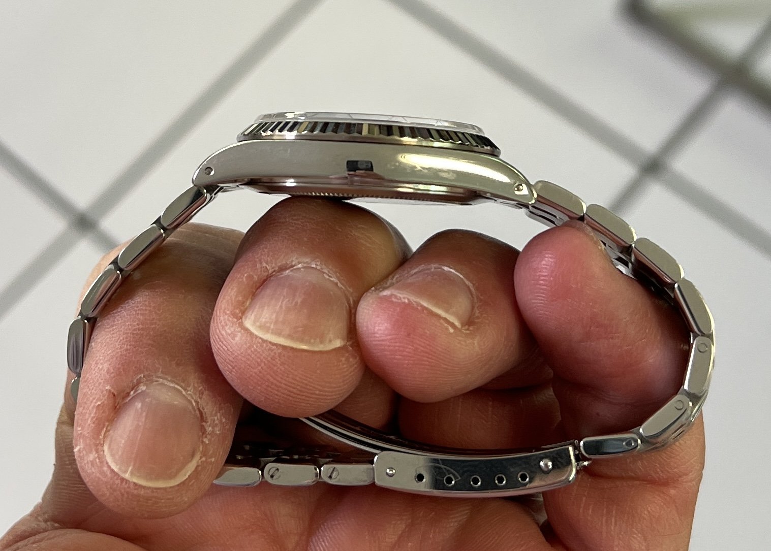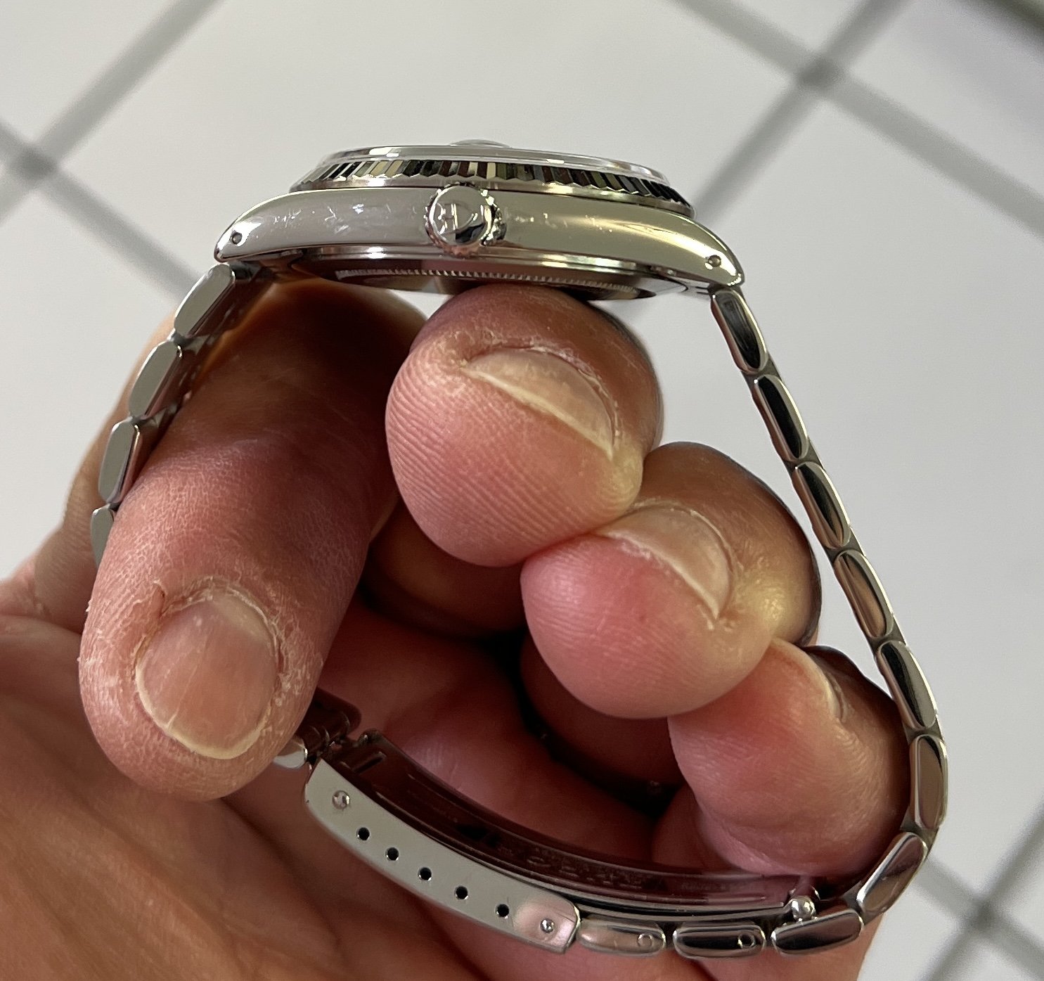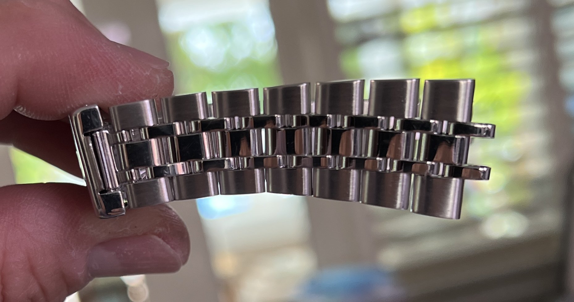 The stainless steel jubilee style bracelet length, including four links removed, is over 7 1/2 inches as shown below so will fit at least an 8 inch wrist size. The bracelet band has moderate stretch as shown on pictures. There are no visible marks on the sapphire crystal, the case has a couple of small marks / swirls as shown.