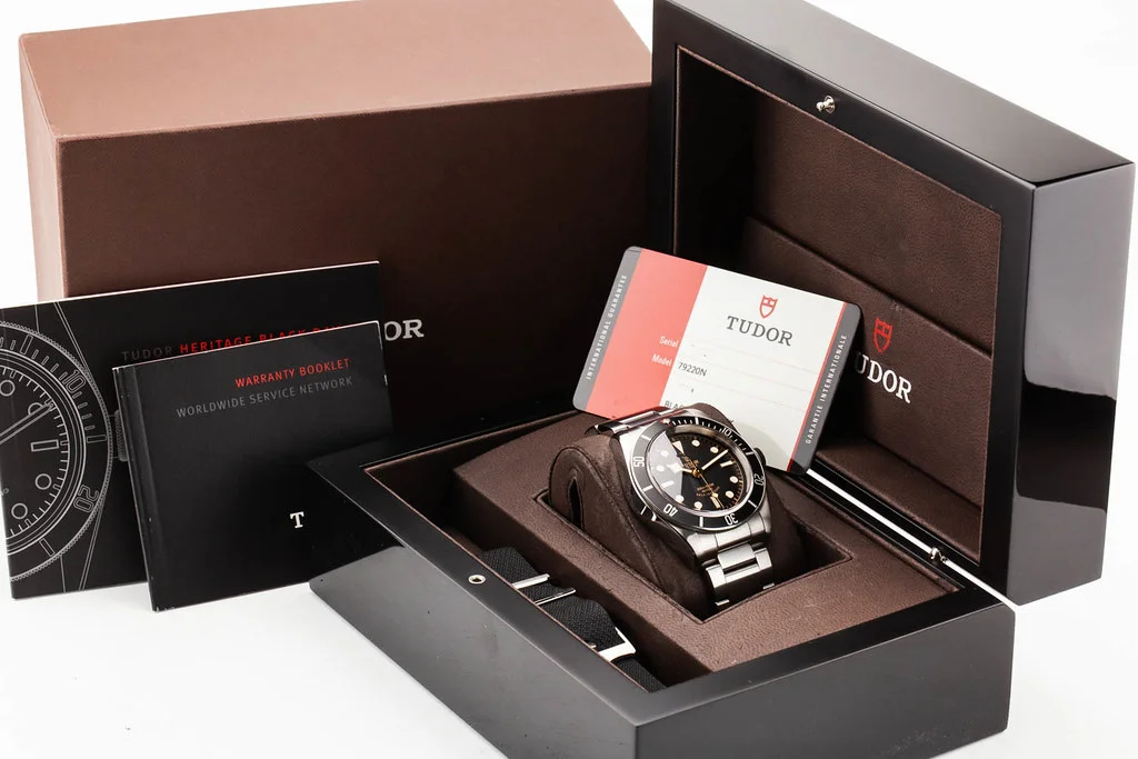 ·Up for sale is an excellent condition Tudor Heritage Black Bay 41mm on Bracelet, reference # 79220N. It comes with all boxes, papers, booklets, textile strap and Tudor Warranty Card dated February 2018.