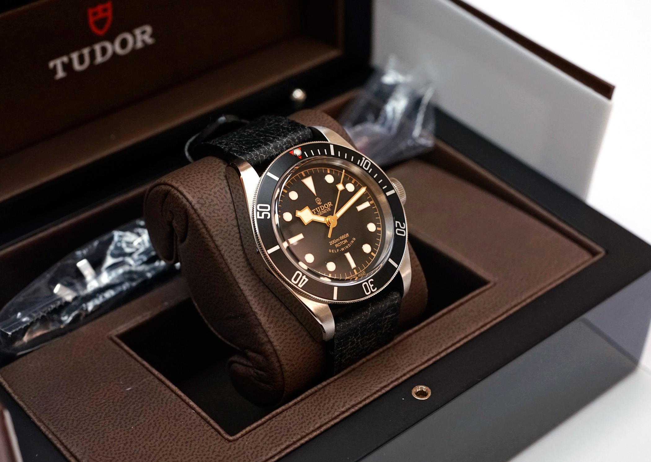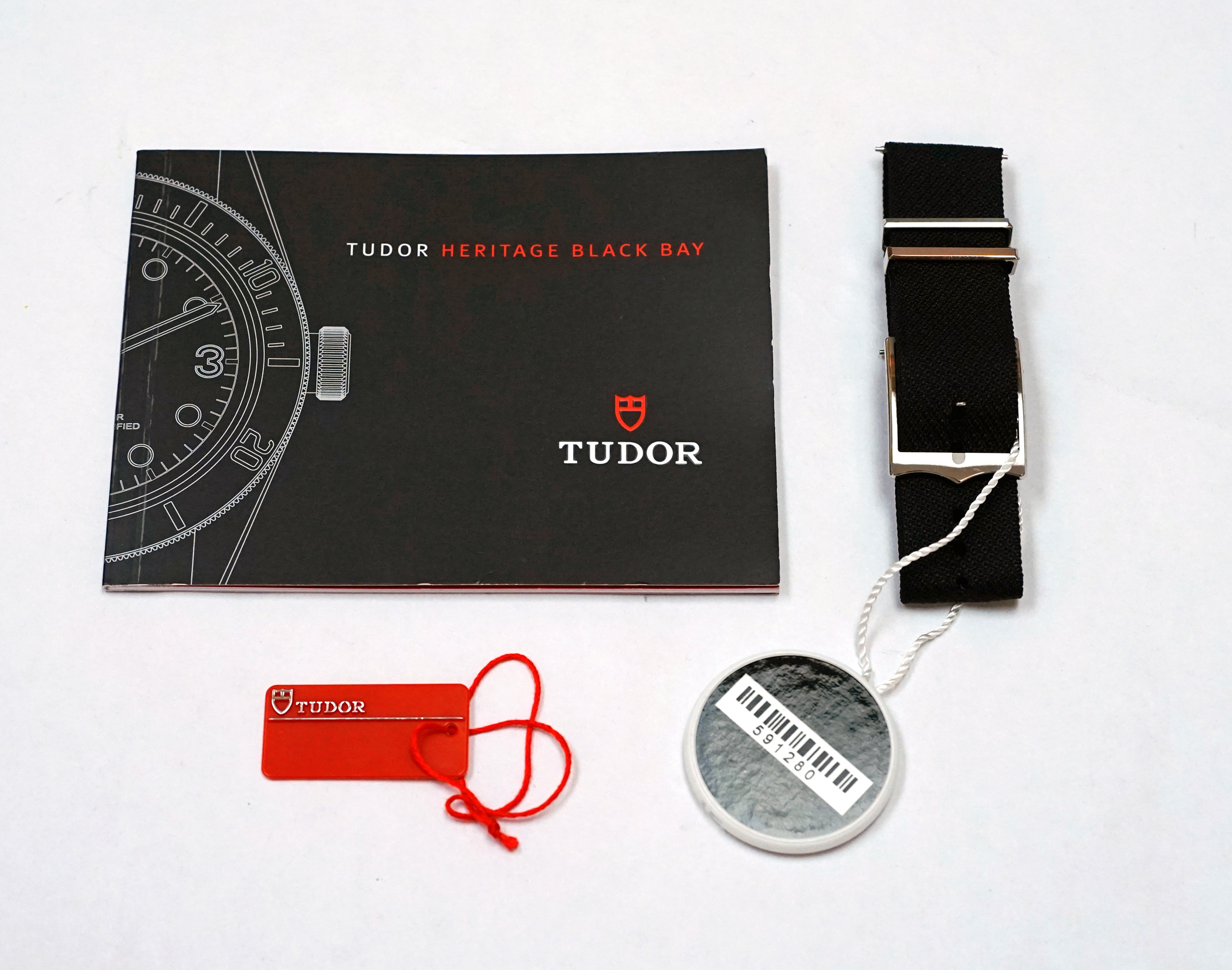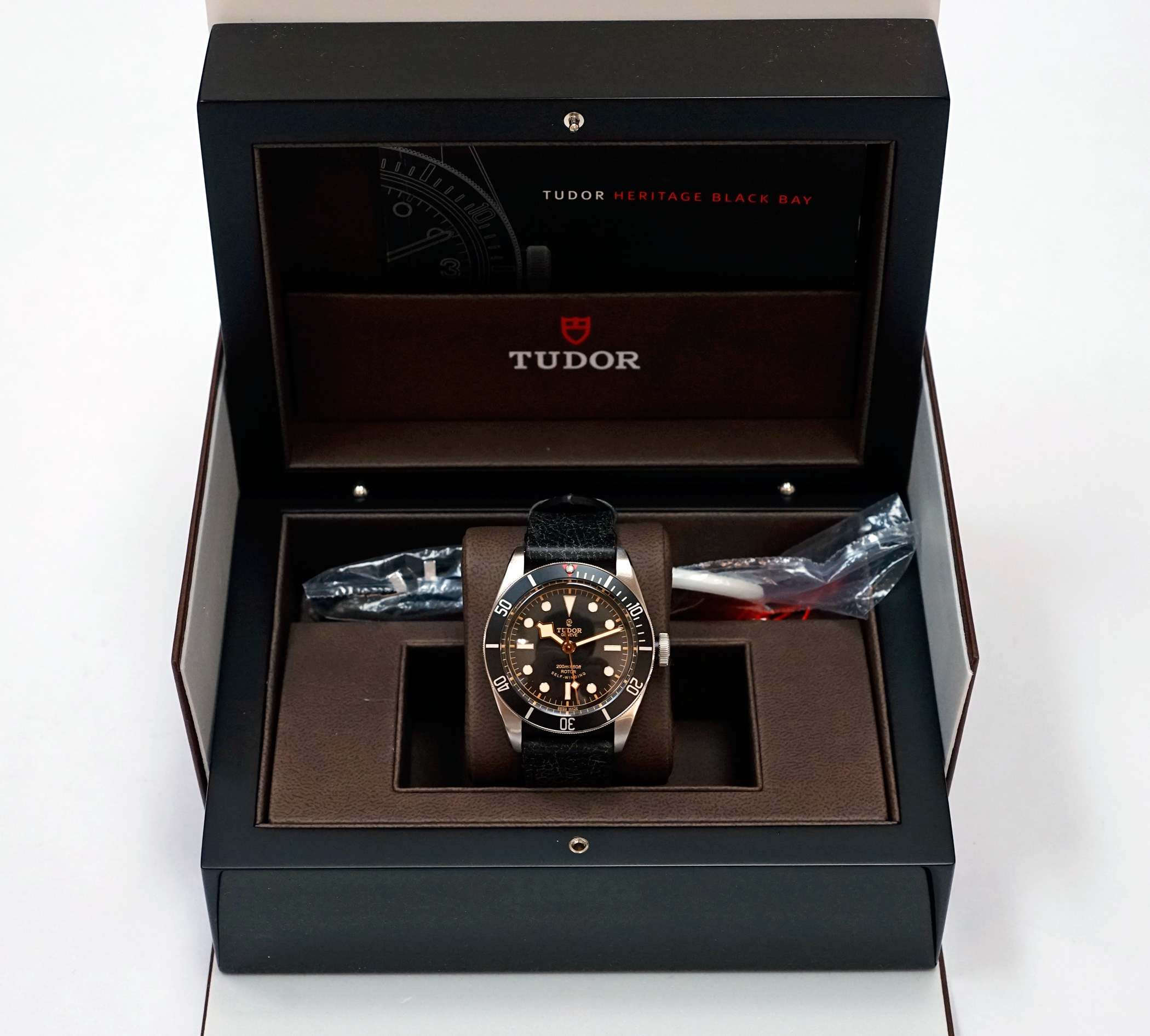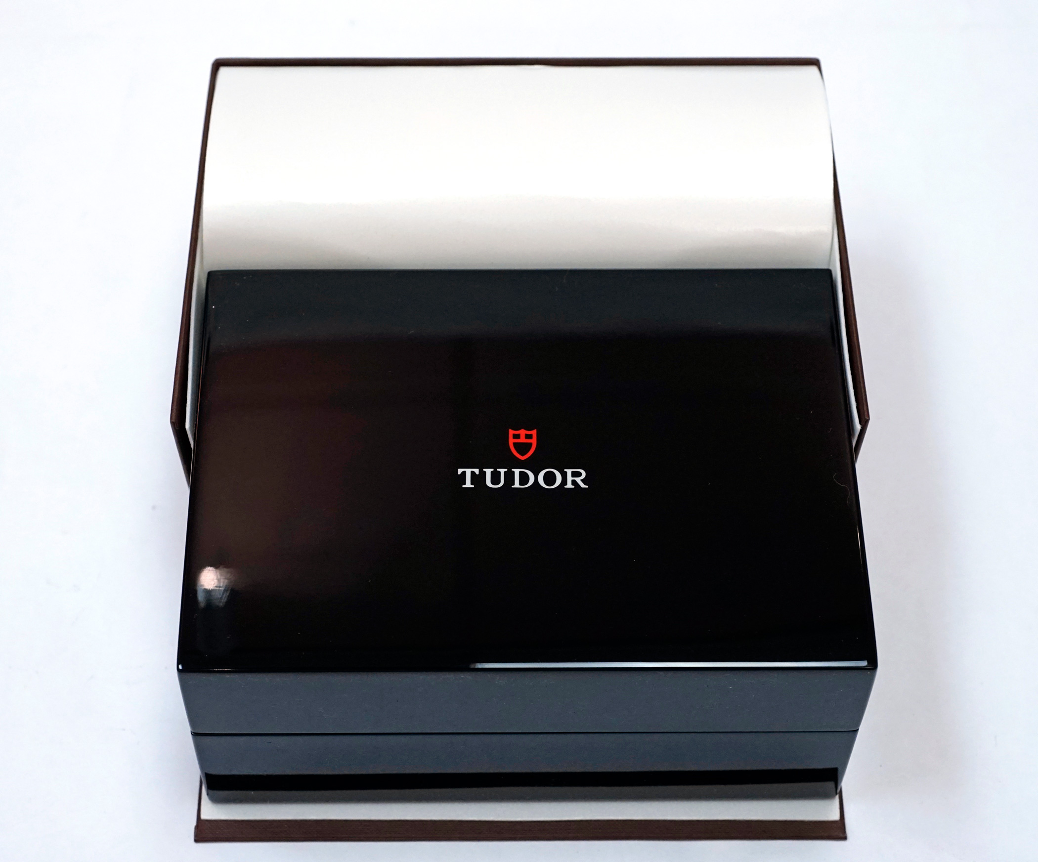 ·For Sale is a Tudor Heritage Black Bay Diver 79220N. This is the rare and out of production first generation Black model introduced after the "One Watch" auction, with the Rose emblem dial, round "ROTOR" text, and black bezel with red pip accent. Item is in excellent condition, TZ rating 92%. The case shows some small swirlies and marks, and there are strap change marks on the bottom of the lugs. Sapphire crystal and bezel are perfect. Currently running at less than +2s / day, and all functions are working properly. Strap and OEM Tudor deploy clasp are in excellent cosmetic and perfect operational condition. Item comes will all original boxes and packaging, including: