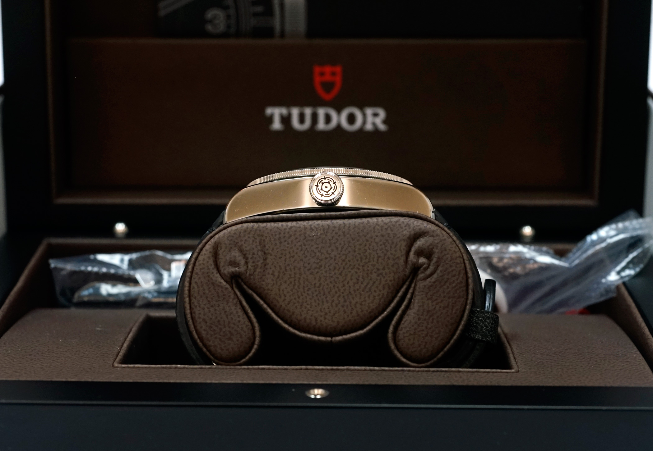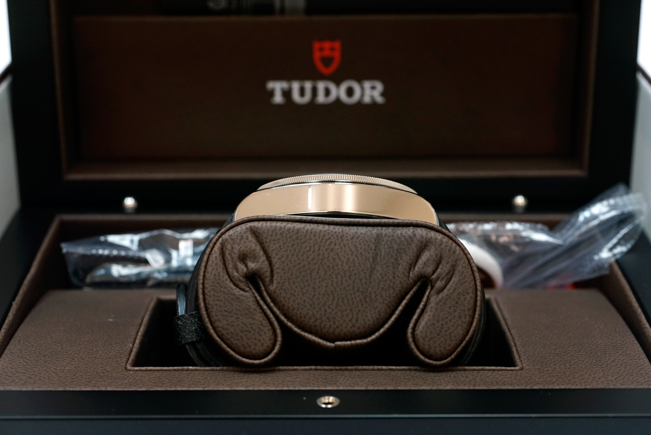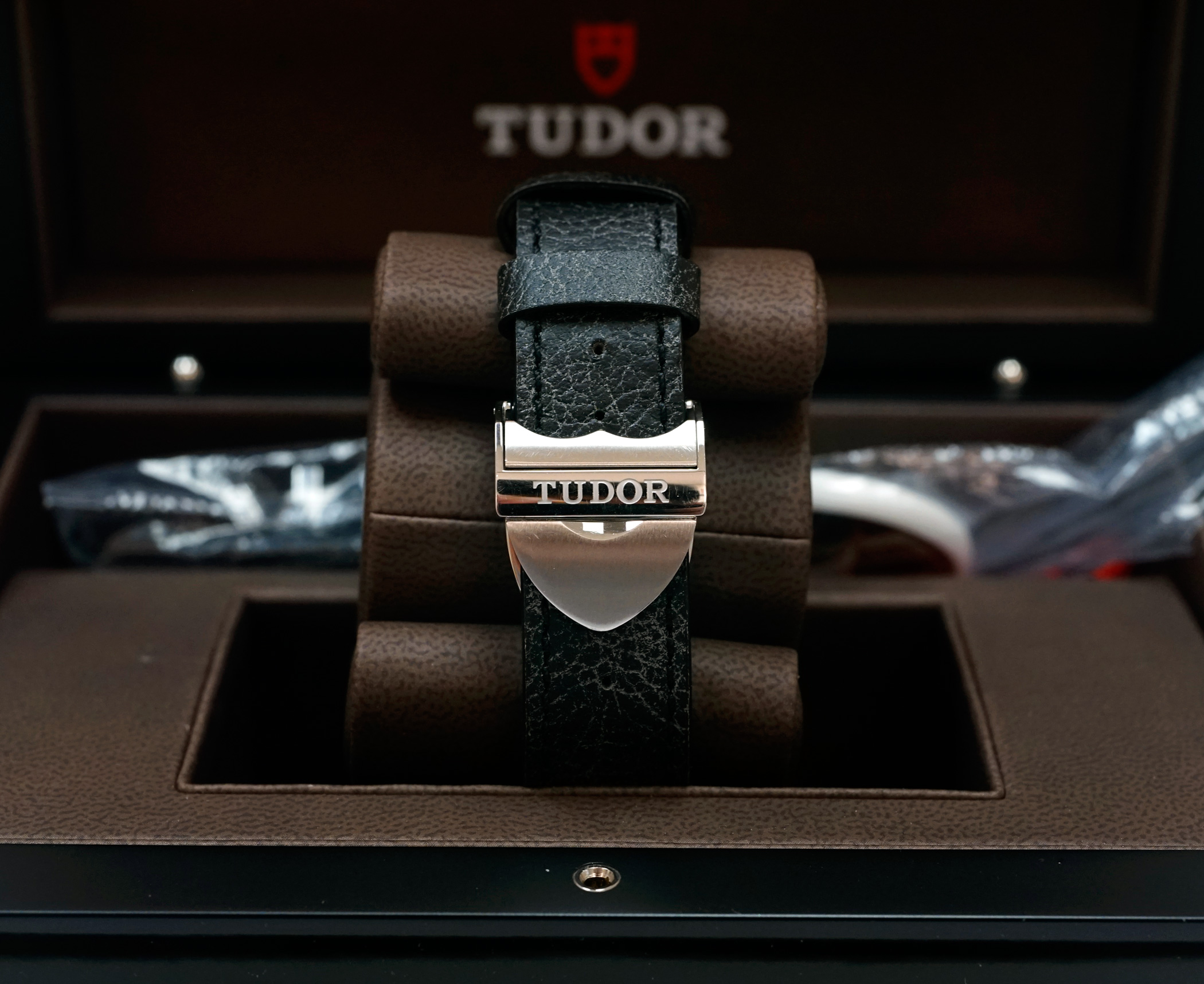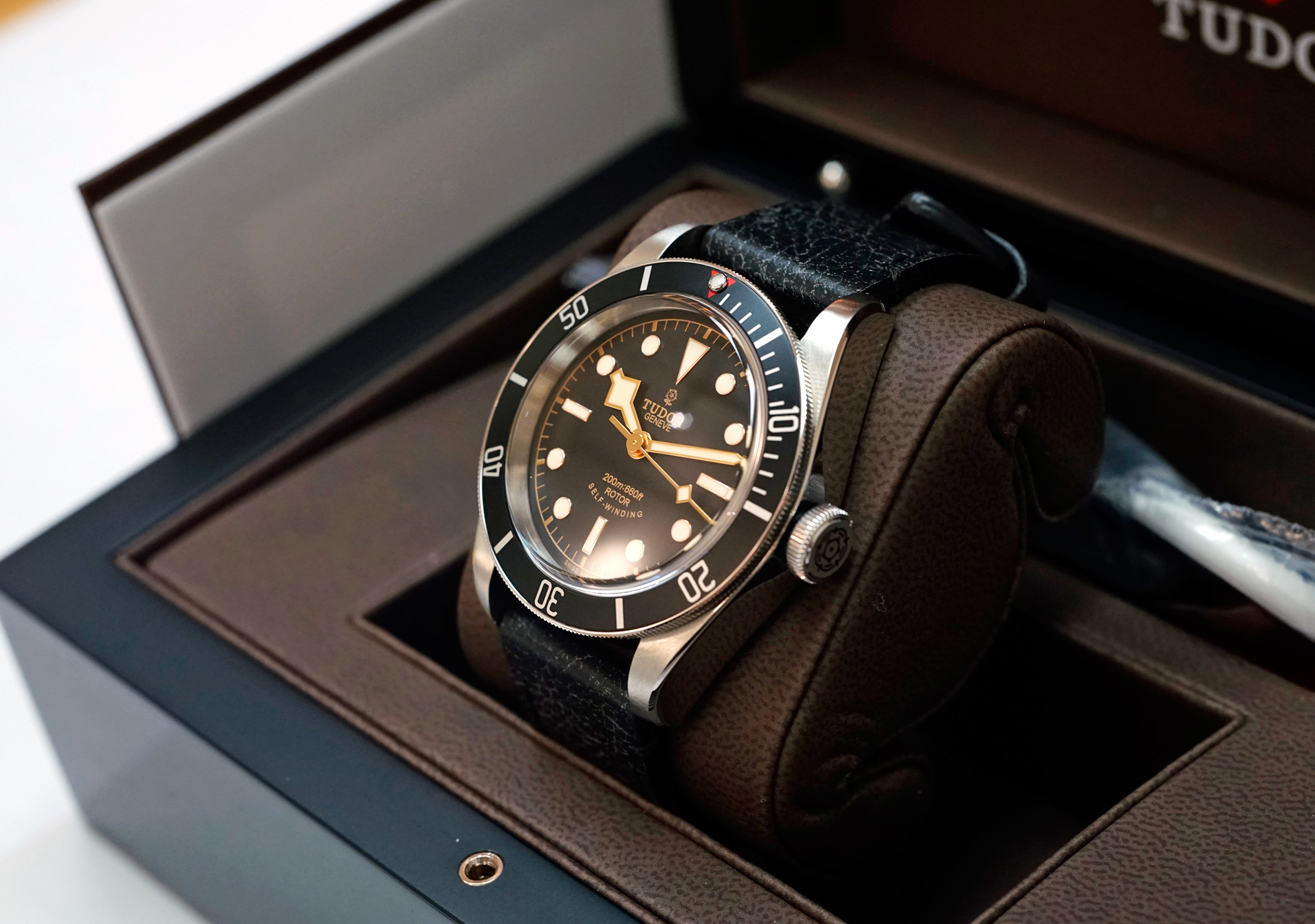 ·For Sale is a Tudor Heritage Black Bay Diver 79220N. This is the rare and out of production first generation Black model introduced after the "One Watch" auction, with the Rose emblem dial, round "ROTOR" text, and black bezel with red pip accent. Item is in excellent condition, TZ rating 92%. The case shows some small swirlies and marks, and there are strap change marks on the bottom of the lugs. Sapphire crystal and bezel are perfect. Currently running at less than +2s / day, and all functions are working properly. Strap and OEM Tudor deploy clasp are in excellent cosmetic and perfect operational condition. Item comes will all original boxes and packaging, including: