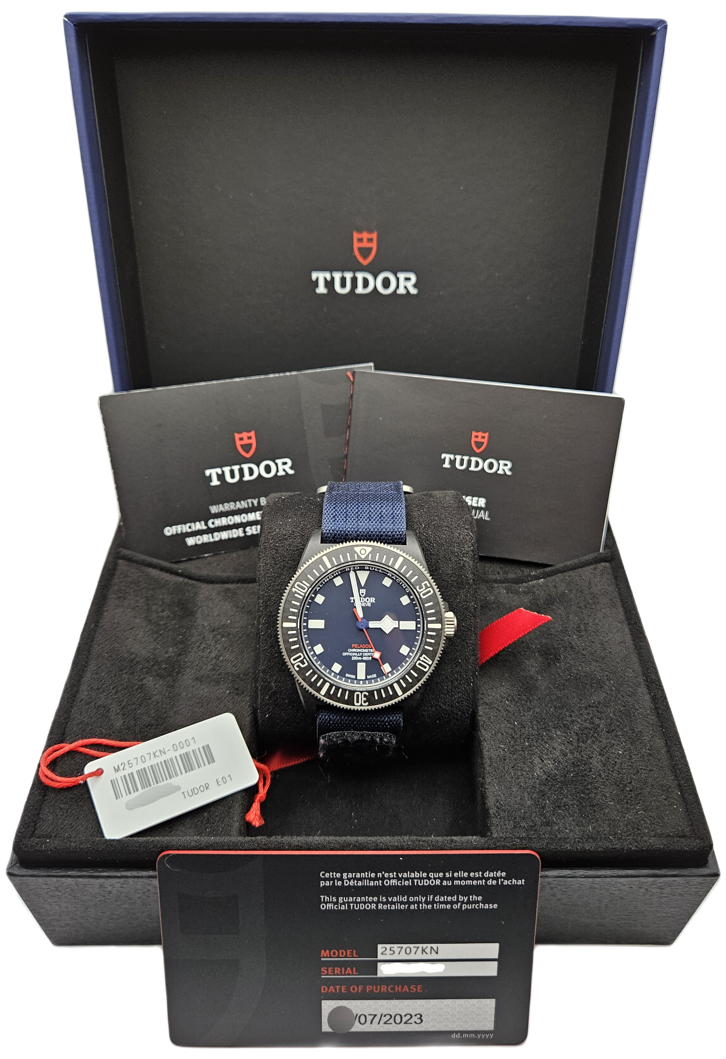 Box, Card, and Accessories: 2023 dated warranty card, white hang tag, owner’s manual, warranty info booklet, special edition Tudor x Red Bull Racing inner box, black cardboard outer box (not pictured), and white outer sleeve for the box.
