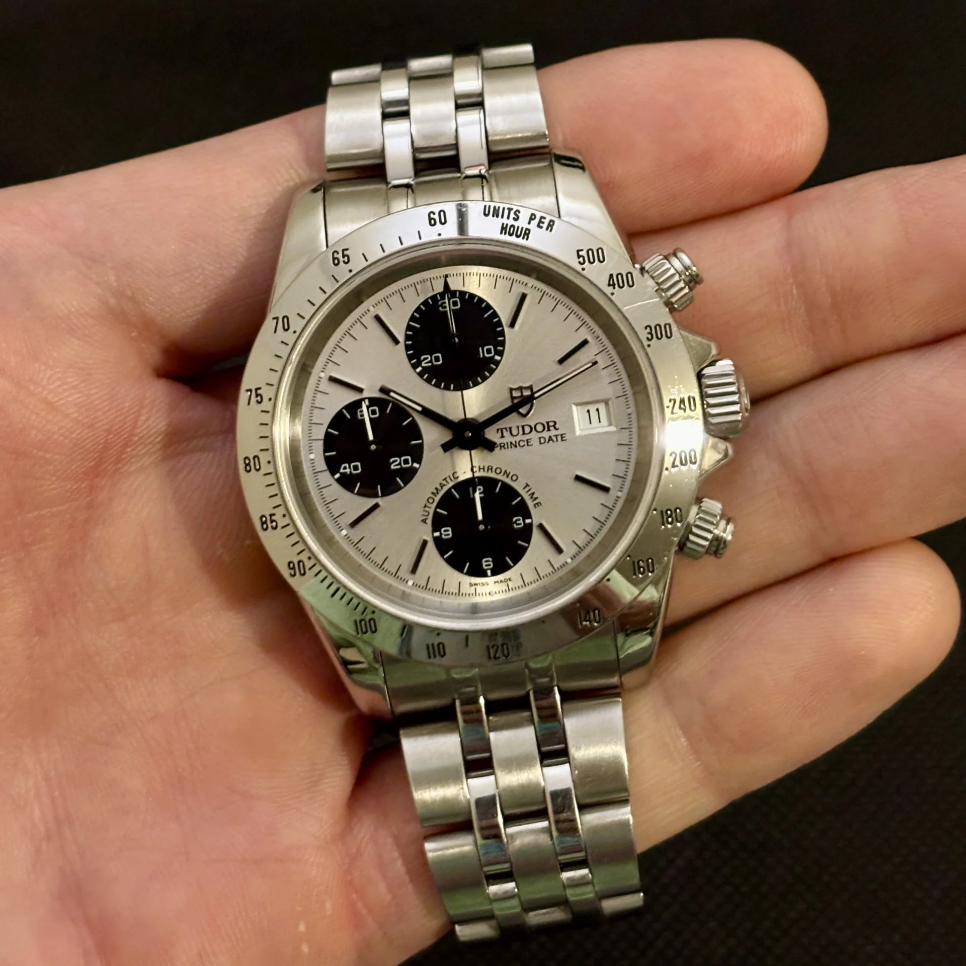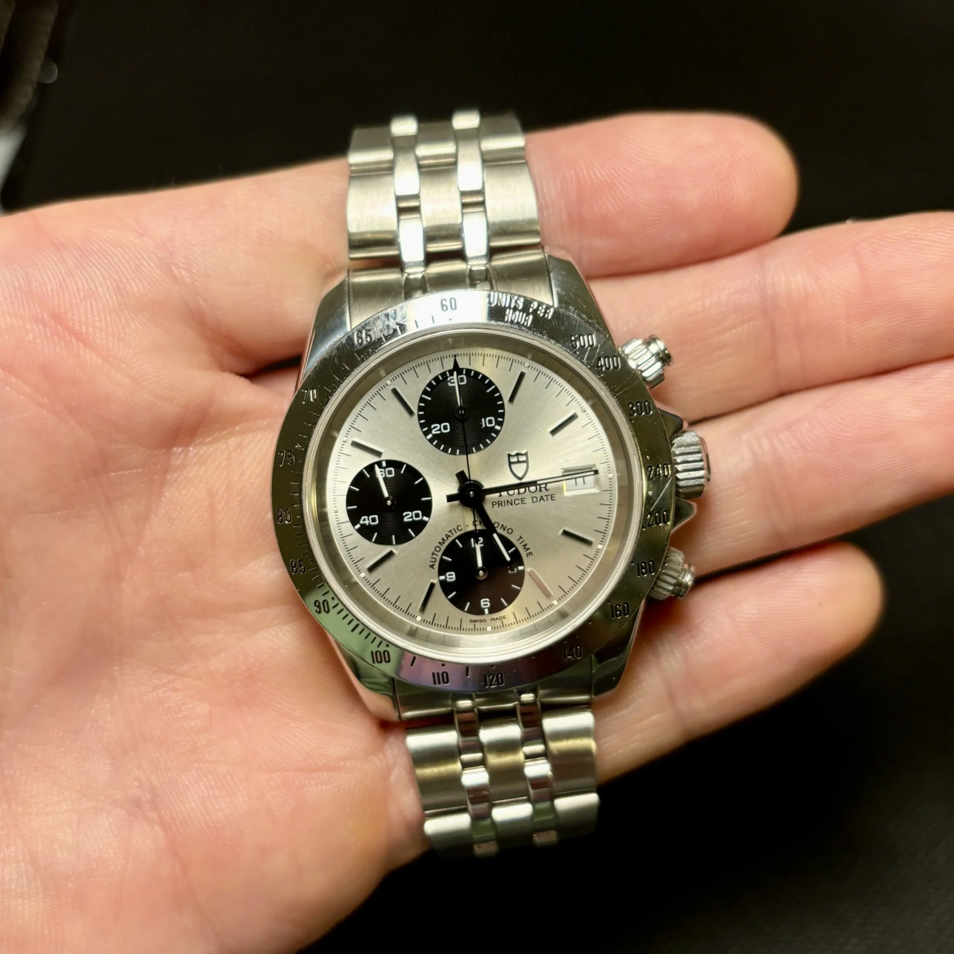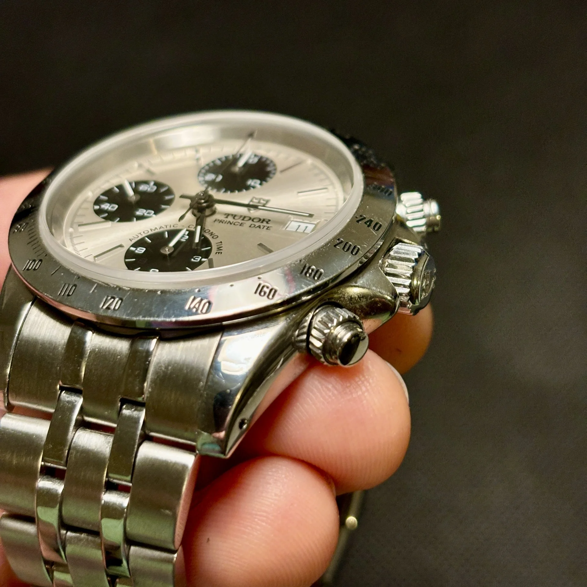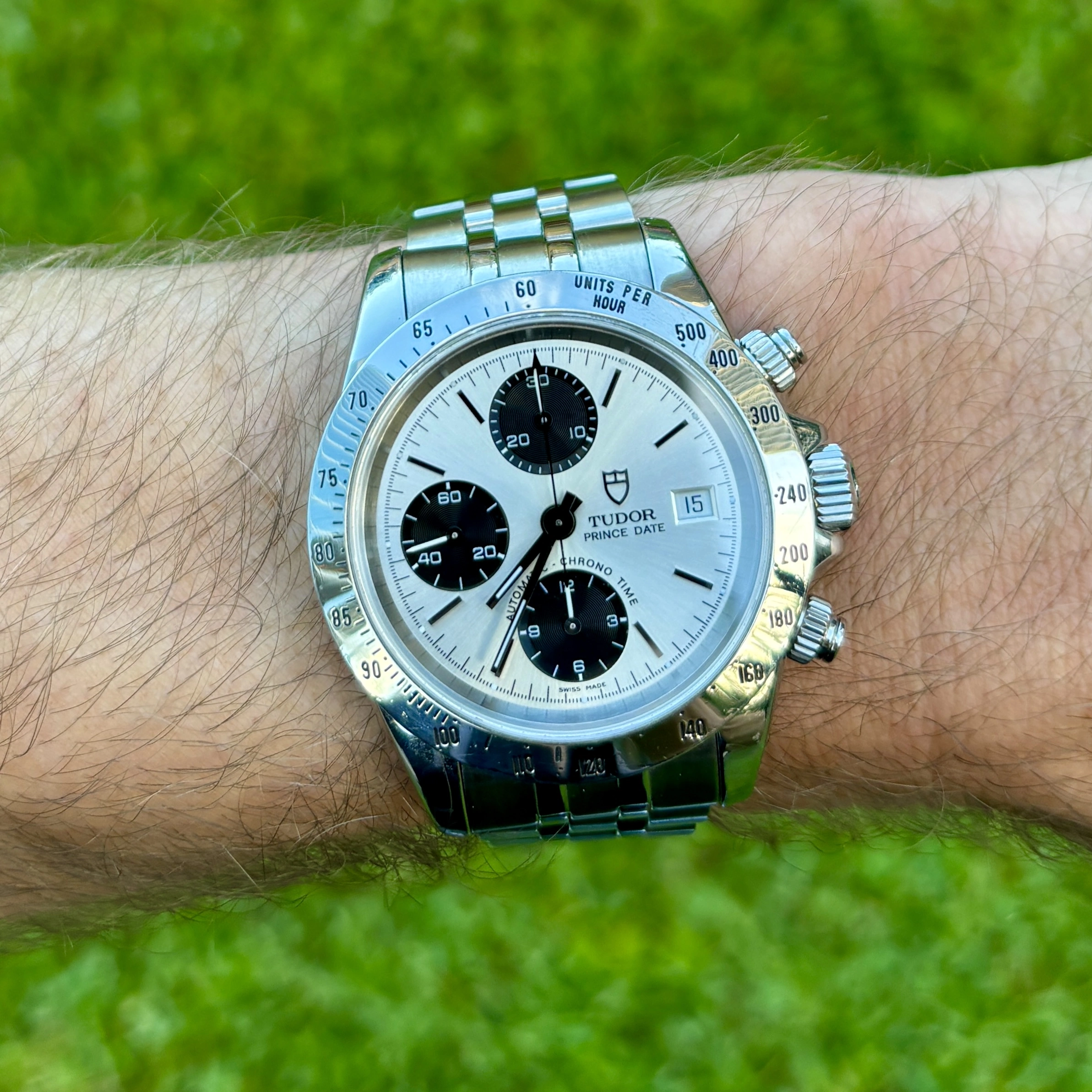 ·Up for sale is my Tudor Prince Date Chronograph from 2002. This is the non-Tiger version with silver panda dial, stick indices, steel tachymeter bezel, and polished lugs. To me, this is the best and most desirable configuration and the size is perfect. This is a watch-only sale and only selling to put funds towards a grail. Watch had a service in 2020 (no documentation) and all functions are working as expected - Chronograph resets exactly to twelve, subdials reset to zero, date sets without any issues. Screw-down pushers and crown feel great. Watch is running approximately -18spd.