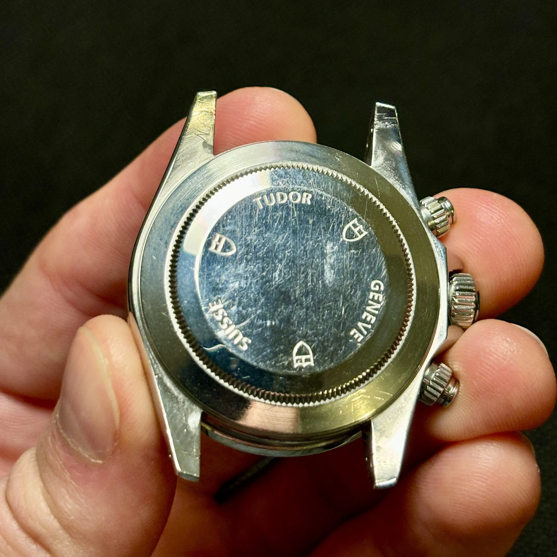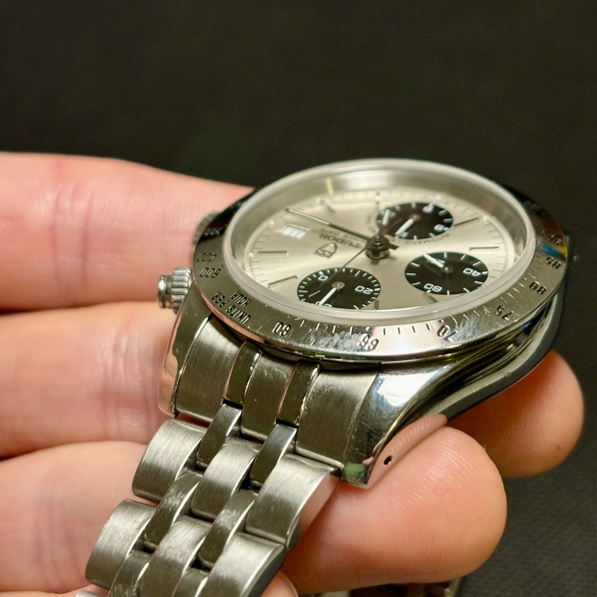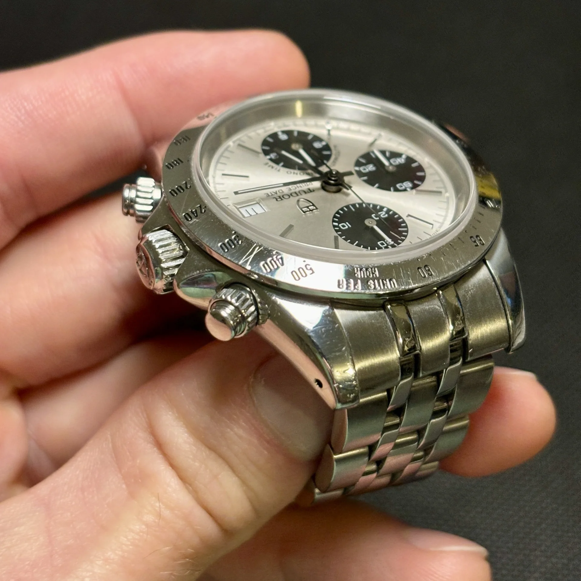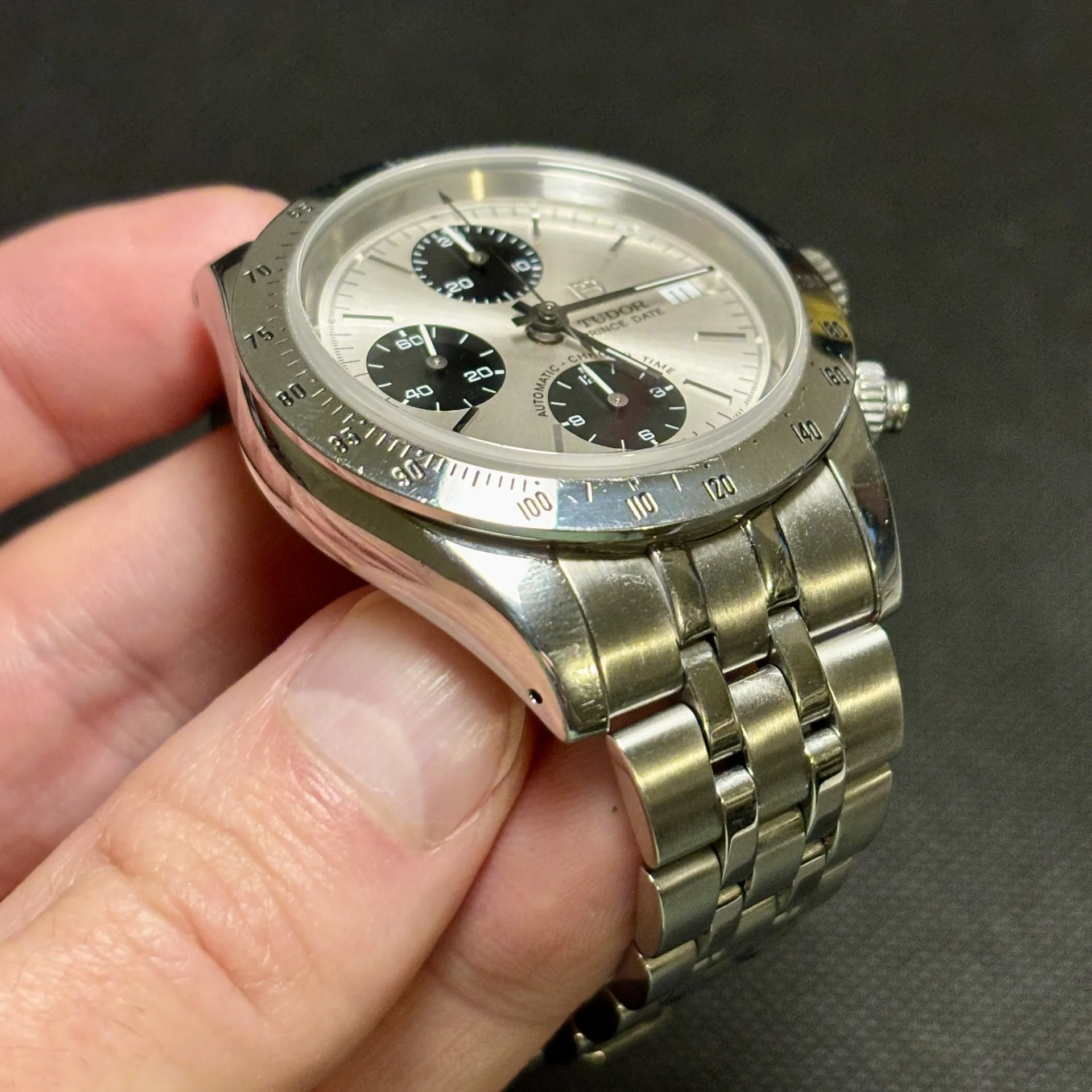 ·Up for sale is my Tudor Prince Date Chronograph from 2002. This is the non-Tiger version with silver panda dial, stick indices, steel tachymeter bezel, and polished lugs. To me, this is the best and most desirable configuration and the size is perfect. This is a watch-only sale and only selling to put funds towards a grail. Watch had a service in 2020 (no documentation) and all functions are working as expected - Chronograph resets exactly to twelve, subdials reset to zero, date sets without any issues. Screw-down pushers and crown feel great. Watch is running approximately -18spd.