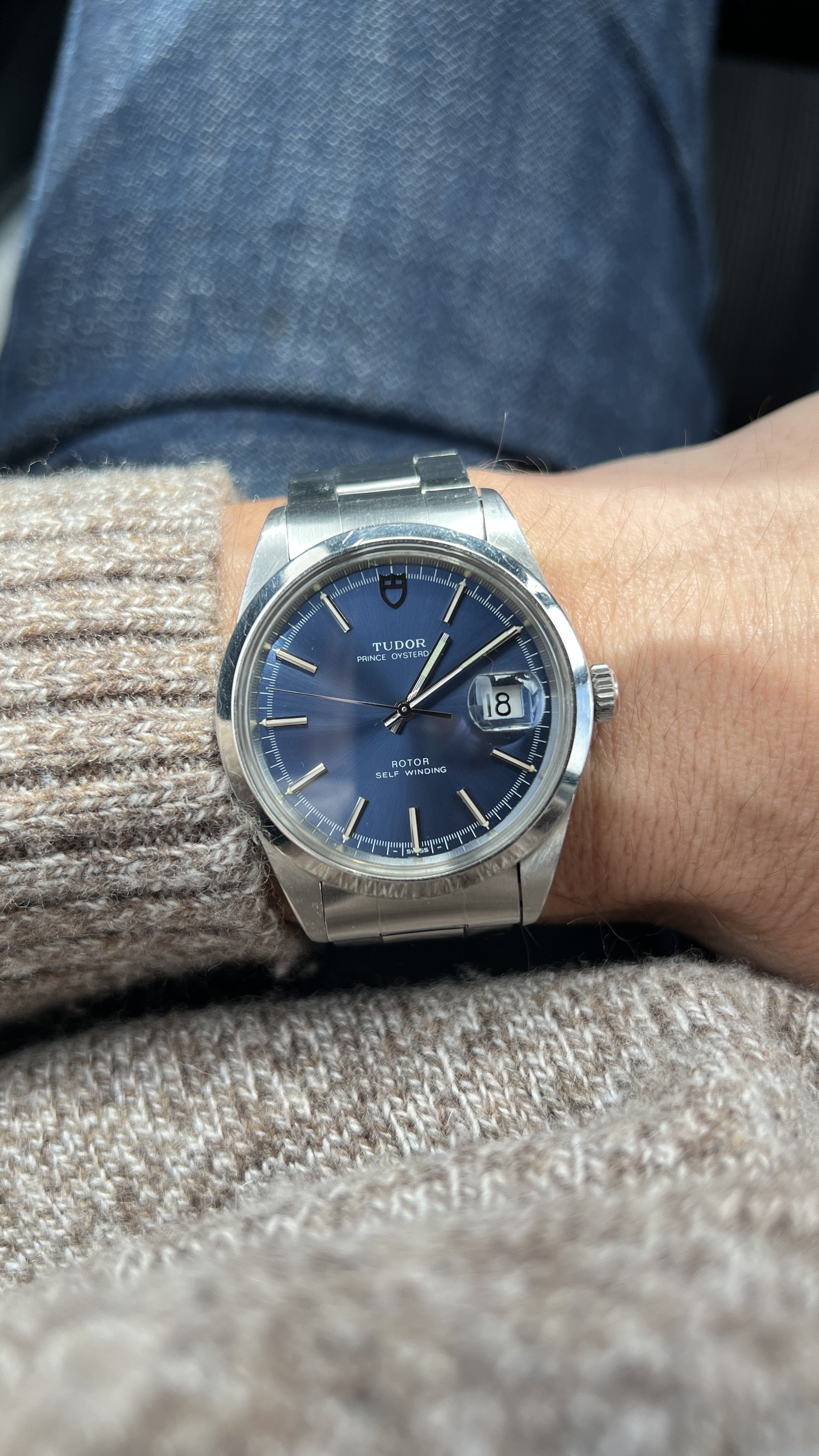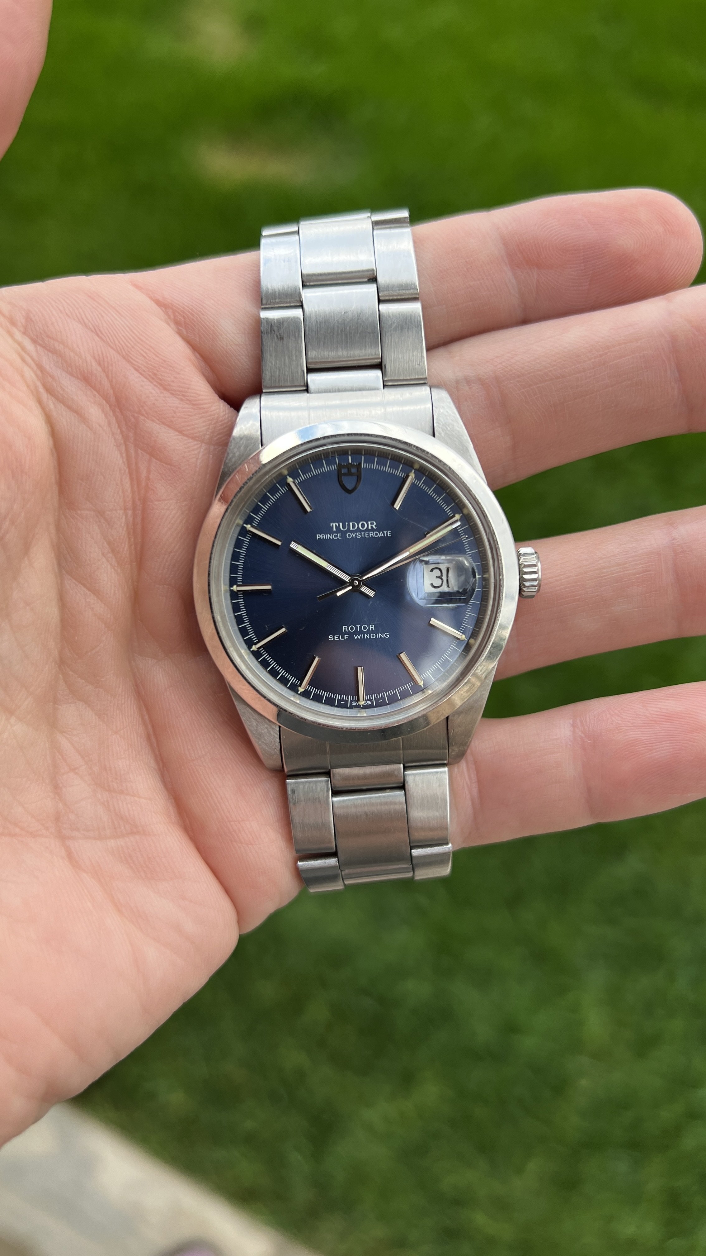 Have you ever wanted a vintage Datejust but just found them too small? Well, this is your watch! A 38mm smooth bezel “jumbo” oysterdate with stunning starburst blue dial that goes from a deep saturated matte blue in the shade to a radiant sparkling ocean blue in direct light.