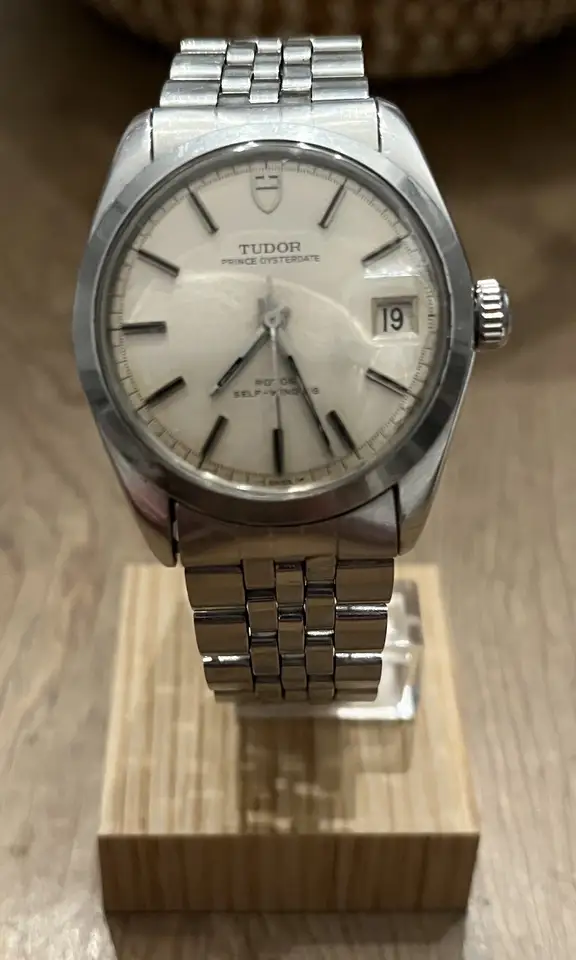 ·Tudor Prince Oysterdate 7106/0 ca.1968 serial number 656XXX with very nice silver dial, date window at 3 o’clock and original Tudor 5-row jubilee bracelet with correct 597 end links. Watch retains its original case, dial, hands, ETA cal.2772 automatic movement with hacking feature, acrylic crystal, Rolex signed screw down crown and case back. Watch is in excellent condition, having not been over polished with crisp case and lug lines, and runs flawlessly with an excellent power reserve. Bracelet will fit up to a 7.25” wrist comfortably, making this a perfect grab and go timepiece.