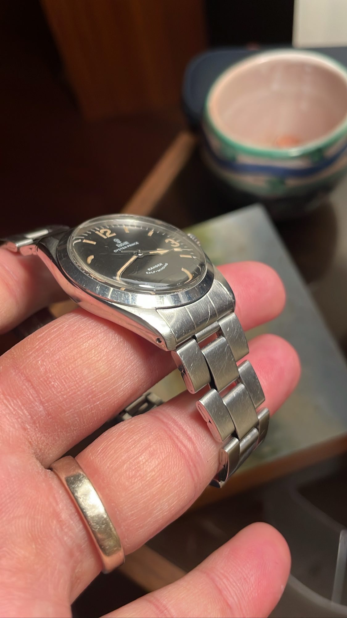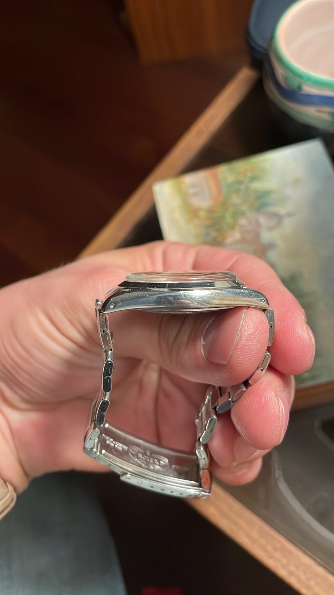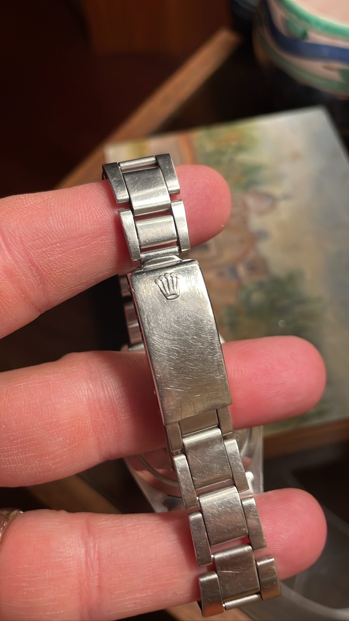 Case: 34mm stainless steel oyster case with very thick and even lugs. This one avoided the wheel and has light scratching and signs of a good life throughout.