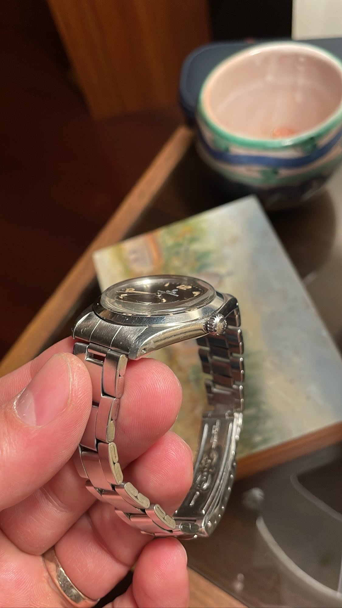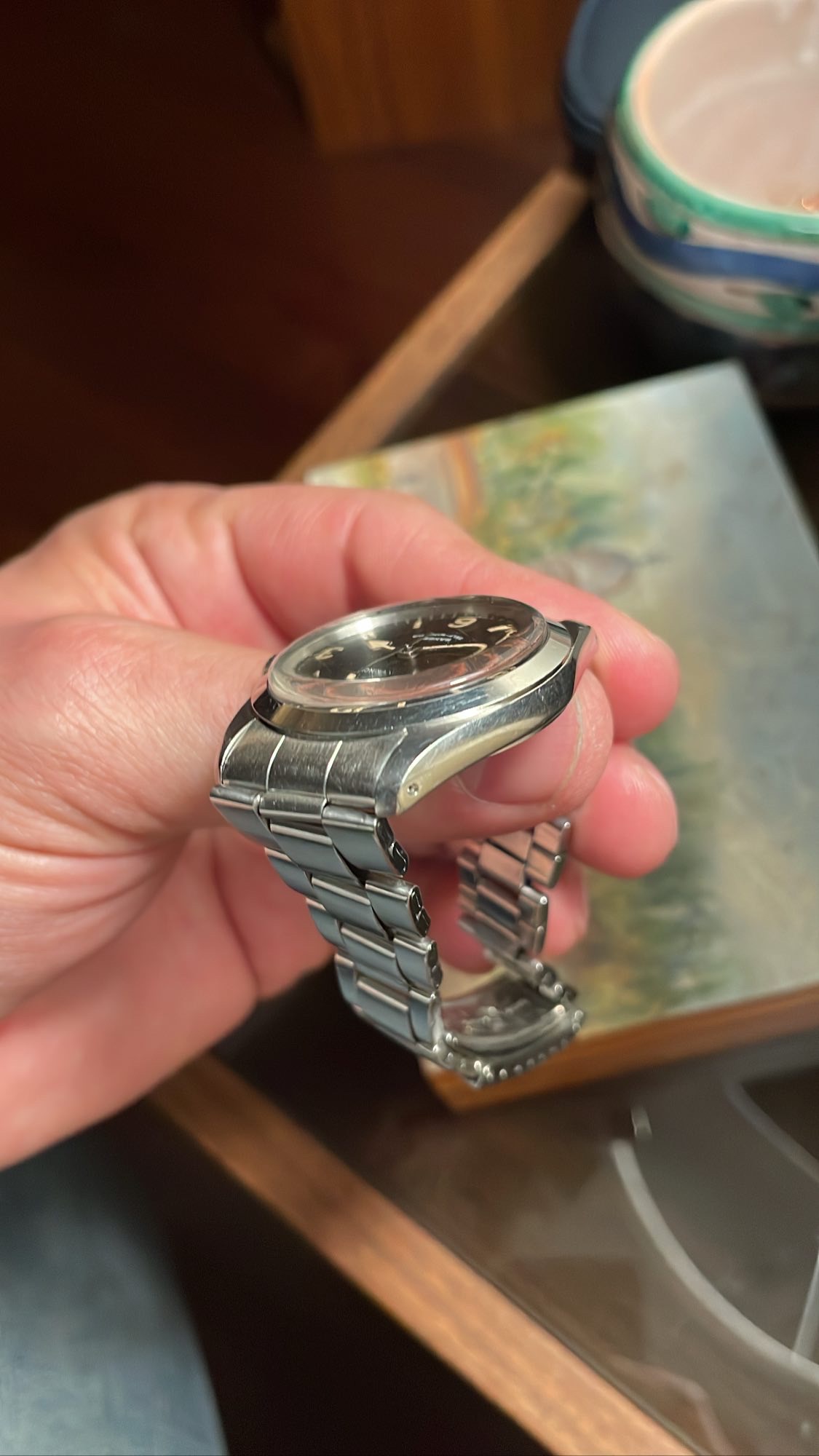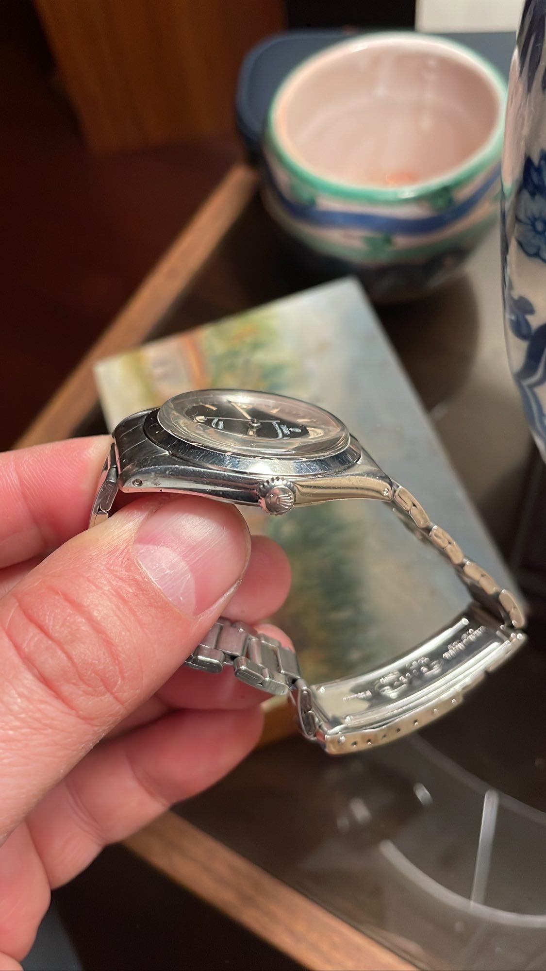 Case: 34mm stainless steel oyster case with very thick and even lugs. This one avoided the wheel and has light scratching and signs of a good life throughout.