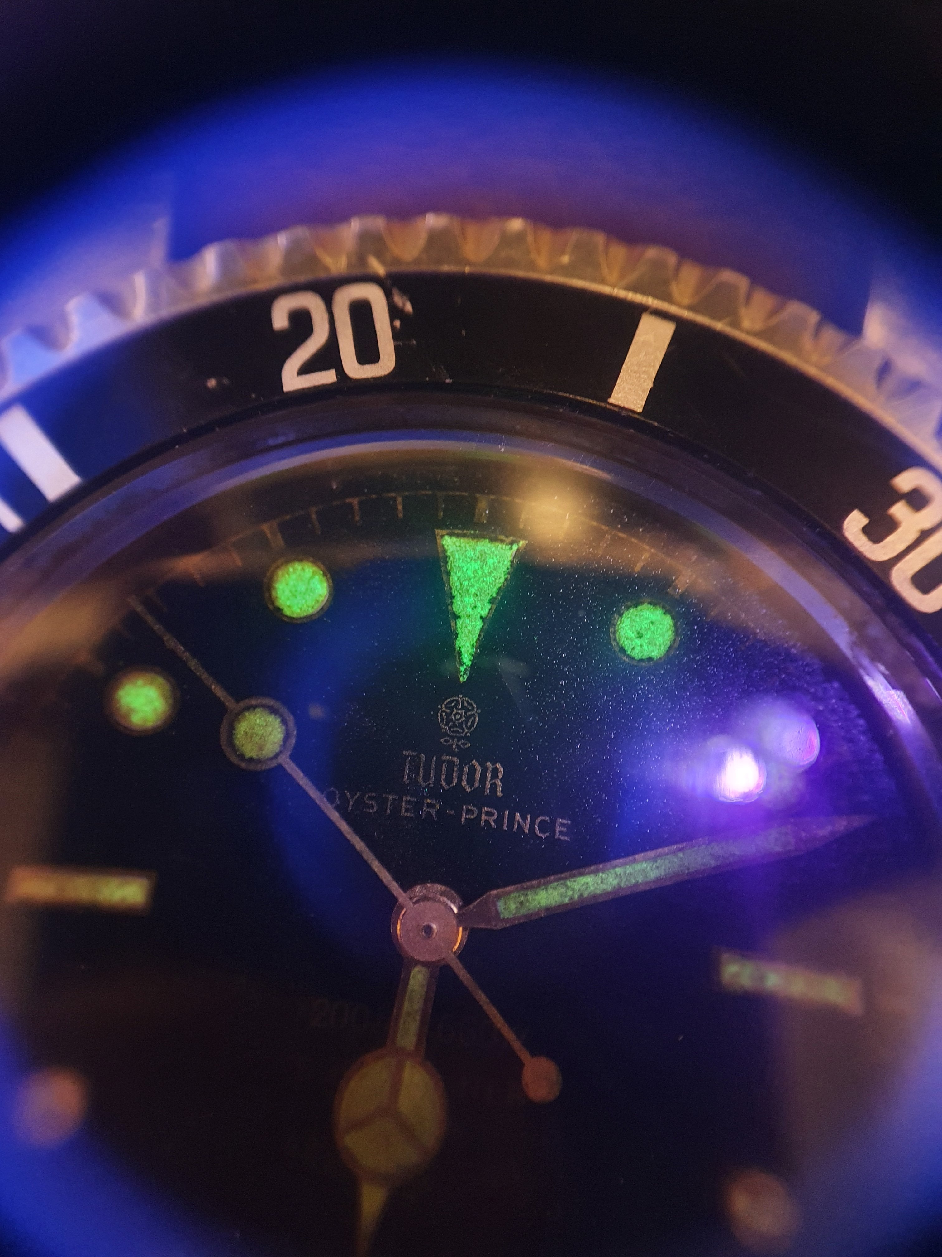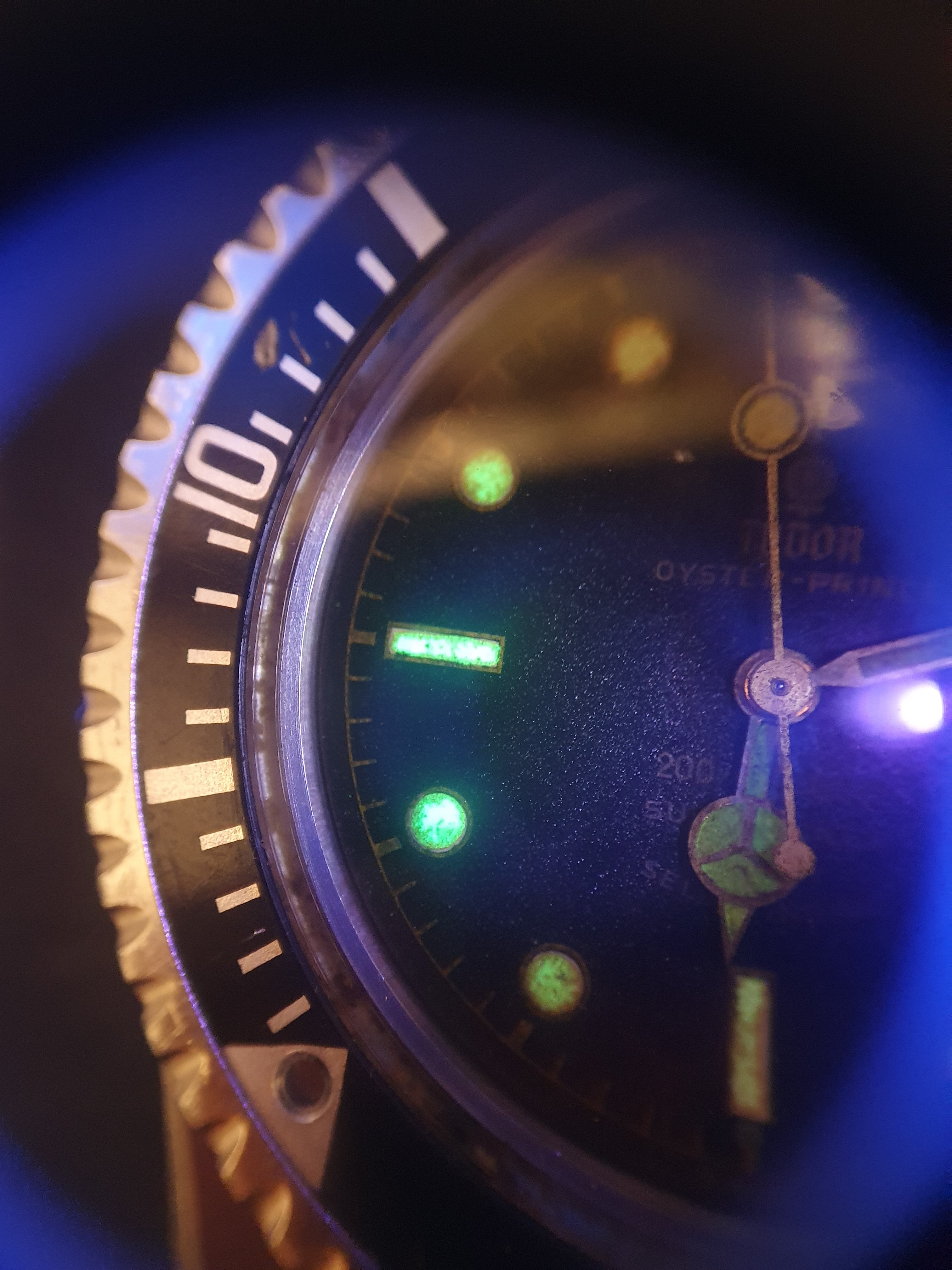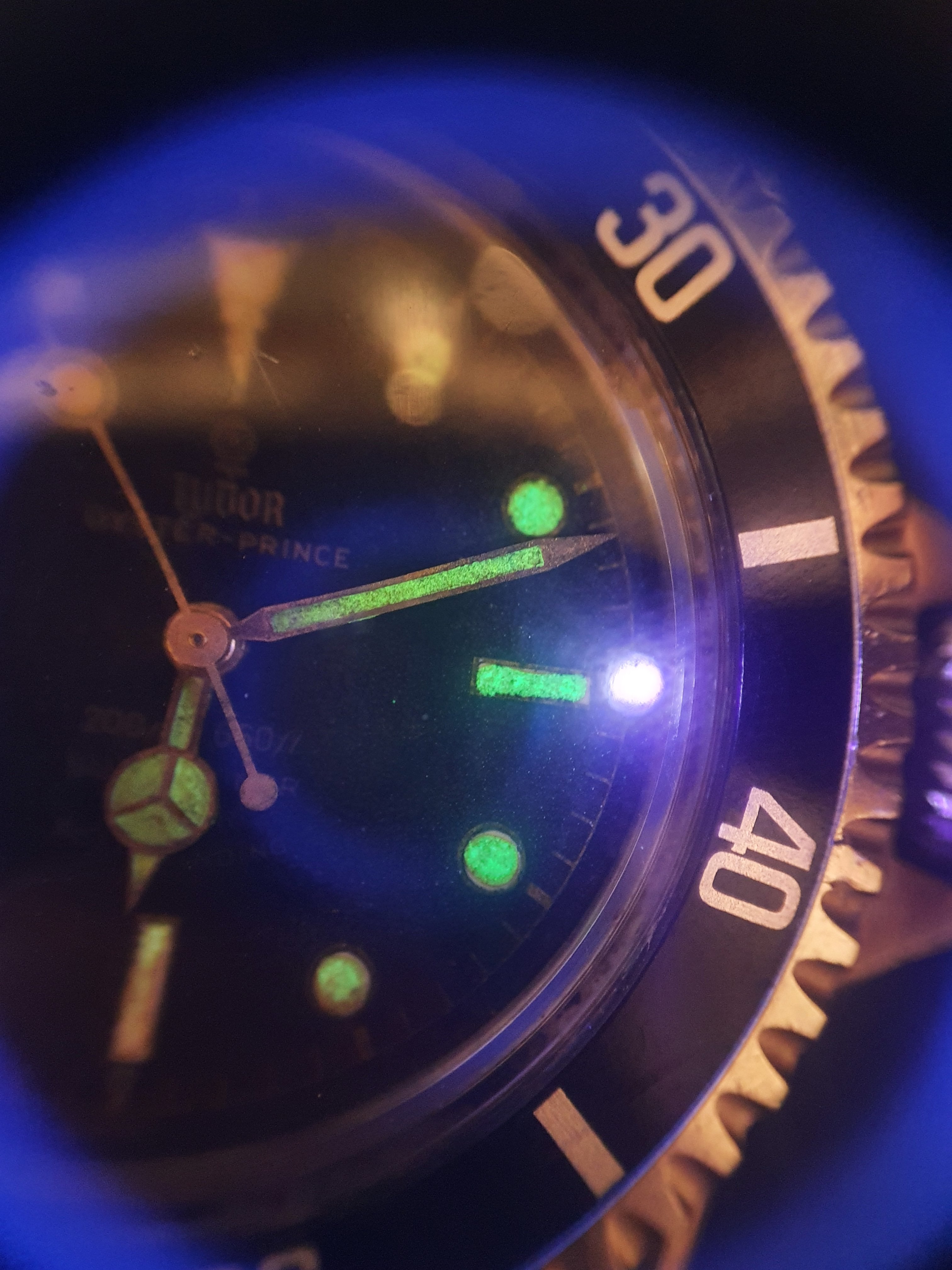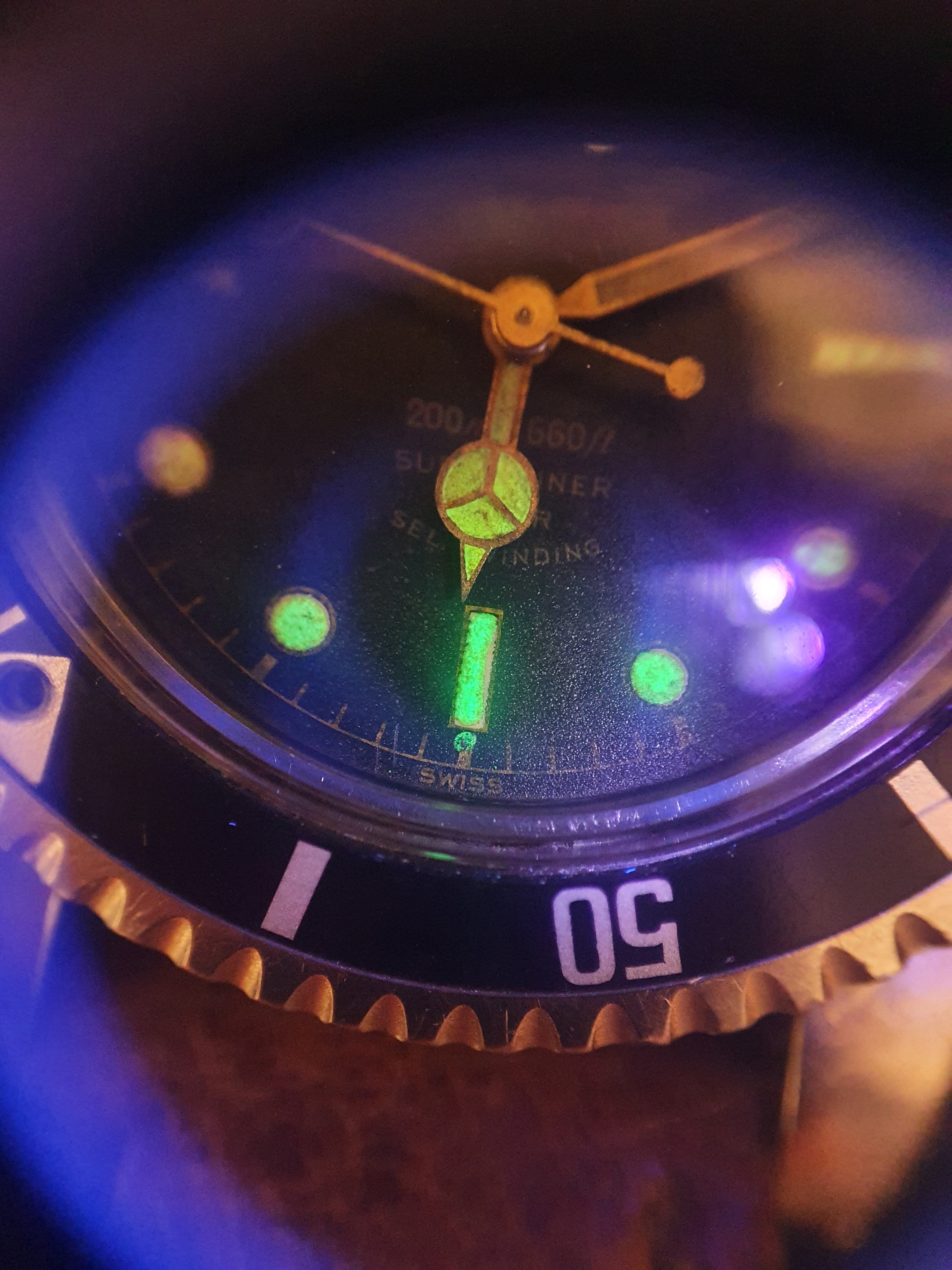 The lume has turned a warm sandy hue with a small amount of discolouration and the original gilt hands have been colour matched to the original lollipop hand. Lume glows brightly when exposed to UV then falls off rapidly, except for hour and minute hands which have been colour matched and glow for a longer period.