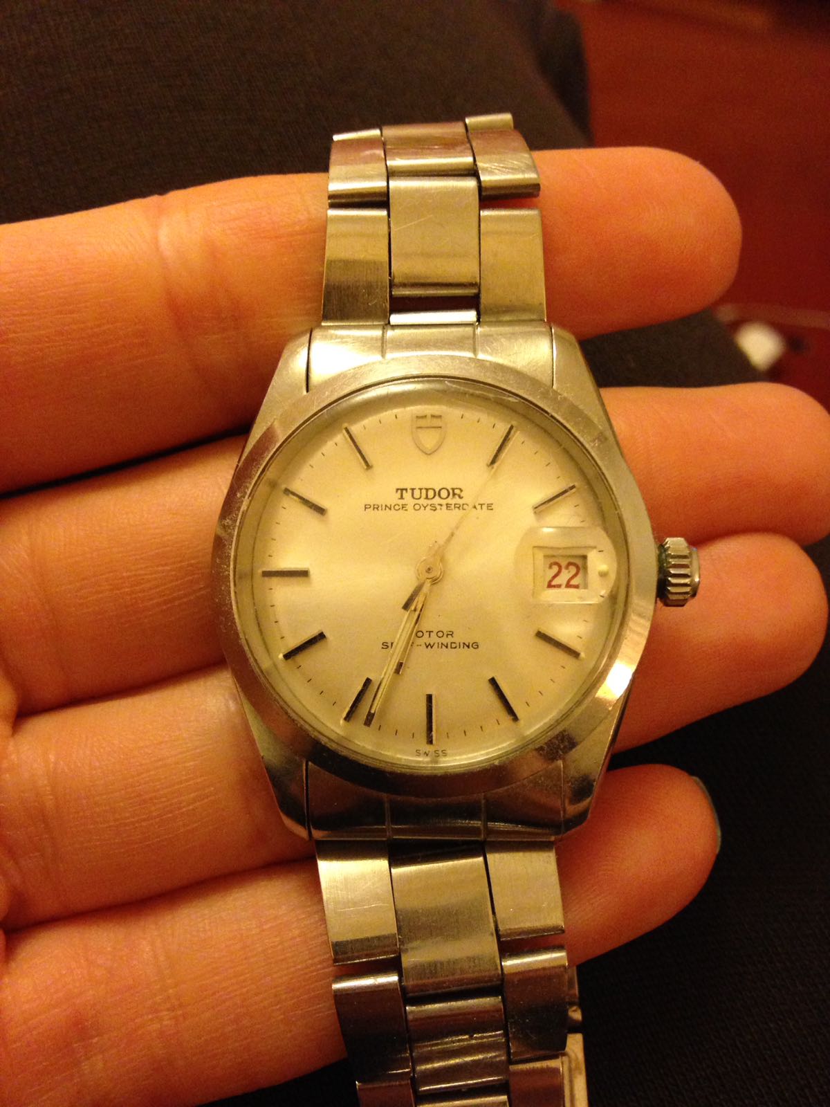It's probably from the late 60s, Swiss only shield non luminous dial and probably roulette date wheel, 34mm case (I'm guessing). It's in nice shape, with rivet bracelet (prob a 7205). These aren't worth terribly much though, possibly in the 800-1000 range, slightly less than an Oyster Perpetual Date 1500. The bracelet alone may be about 200-300 or so, though there's a bit of stretch.