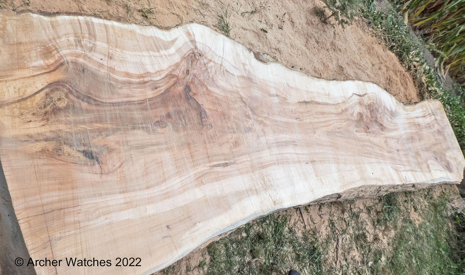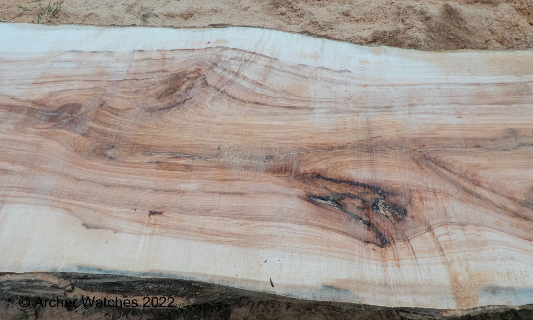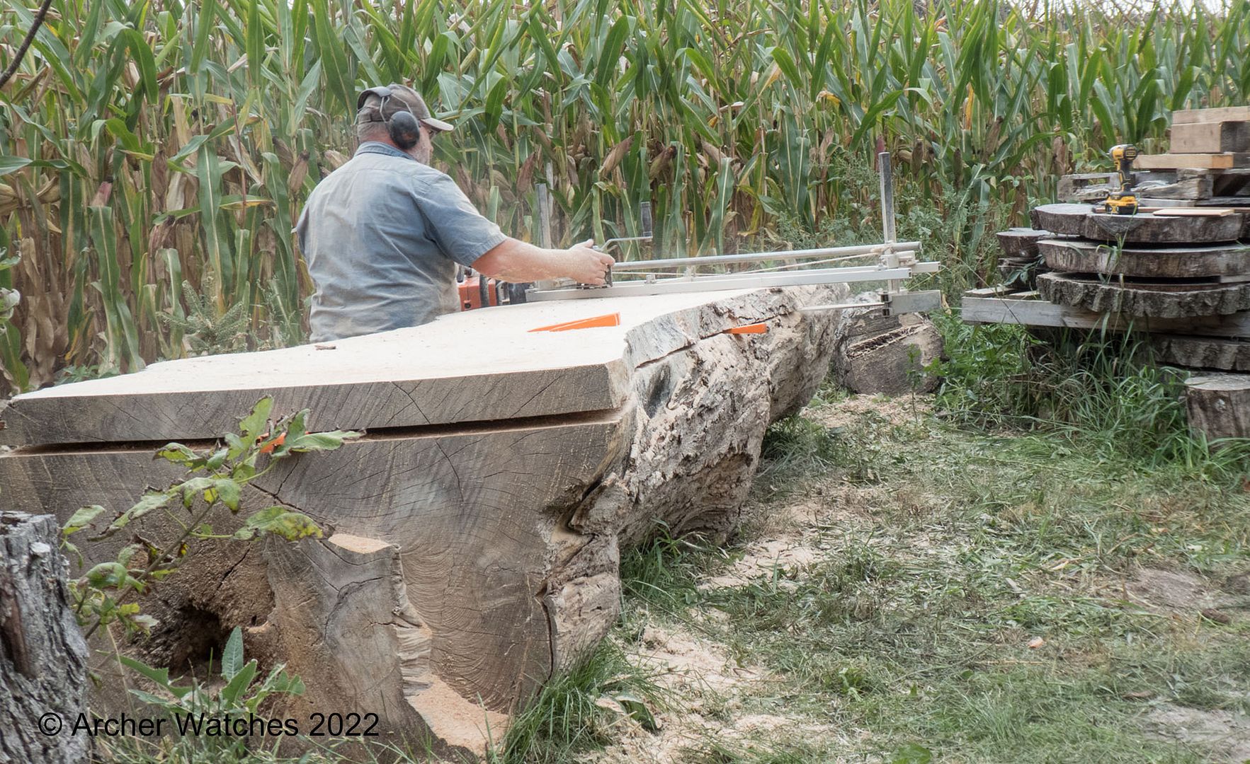 Our trunk was too large for the sawmill they have that uses a bandsaw, so to saw this up they used a chainsaw sawmill. This is an attachment to a chainsaw fitted with a longer bar, that allows you to cut slabs from a piece of wood like this. It works very well, but the loss of wood is greater with this method because the chainsaw is thicker than the bandsaw is (more wood lost to chips), and this is more labour intensive. Here are some photos I took during the process: