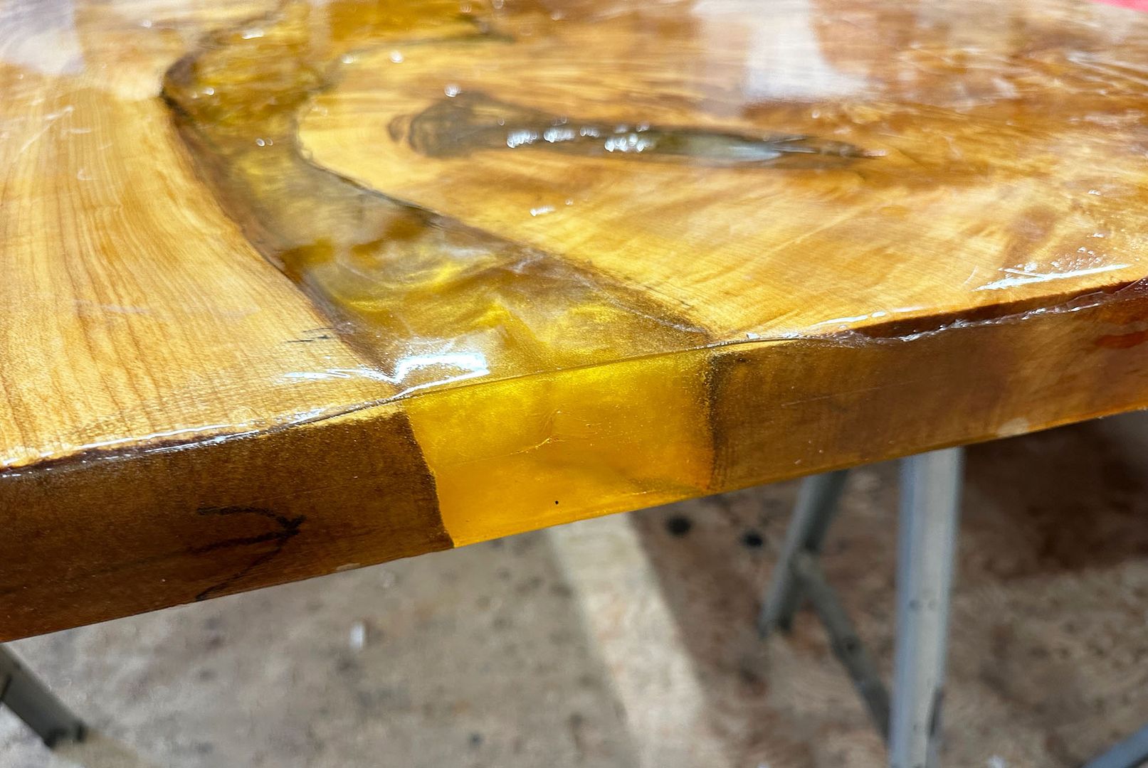 I'll show a few details before I post an overall photo...this is the final epoxy - it's gone from being more orange, to being more yellow, to now being quite amber - exactly what we were shooting for. It will change a bit in different lighting I expect, which is great. I am holding a pen under the area in question and you can see the shadow of it, just to give you an idea of the transparency: