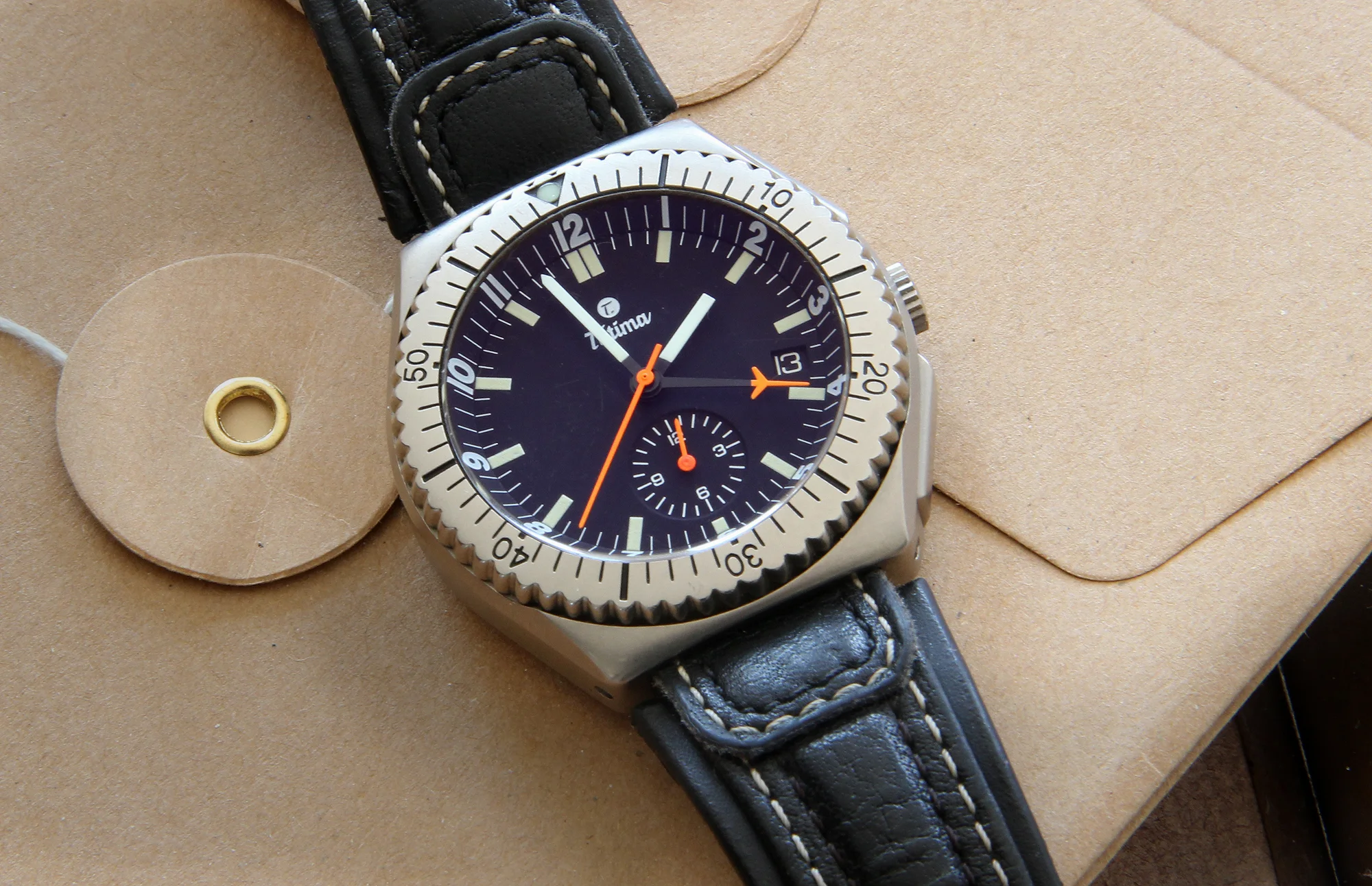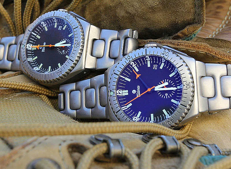 But I still had a serious itch to scratch. Remember the Military Chronograph? Well, I wanted another one of these too, but this time a slightly different model. First, I wanted one made out of titanium. But that was not all. Tutima had also made a "mission timer" variant for the ZUZ, the German border guards commandos. Apart from being good at their job, these guys must be some serious horology freaks, because they had previously had another watch made for them. It was by Sinn, and it is the legendary EZM1. So that Tutima, known under the name "Commando II" actually replaced the Sinn EZM1 on these dudes' wrists. It turns out that the military version and its civilian variant have some differences. The former has a rotating bezel borrowed from the TL pilot chronograph version while the latter doesn't. What they share is a much simplified dial with both running seconds and 24 hour registers jettisoned, and a much more discreet date window. That dial has a very eye-pleasing symmetry in my opinion, and I remember being absolutely mesmerized when I first saw a picture of one. So that's the one I wanted now.