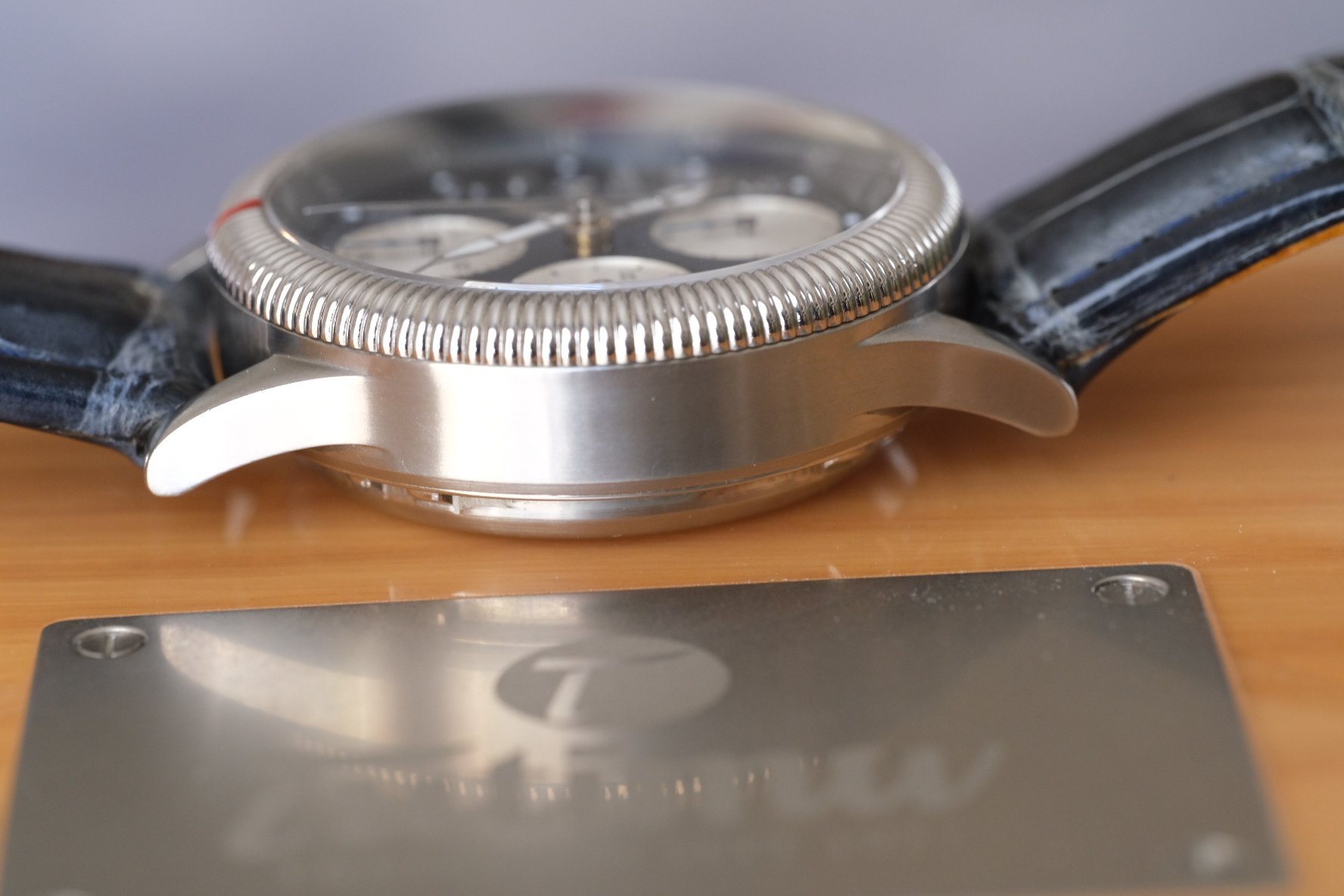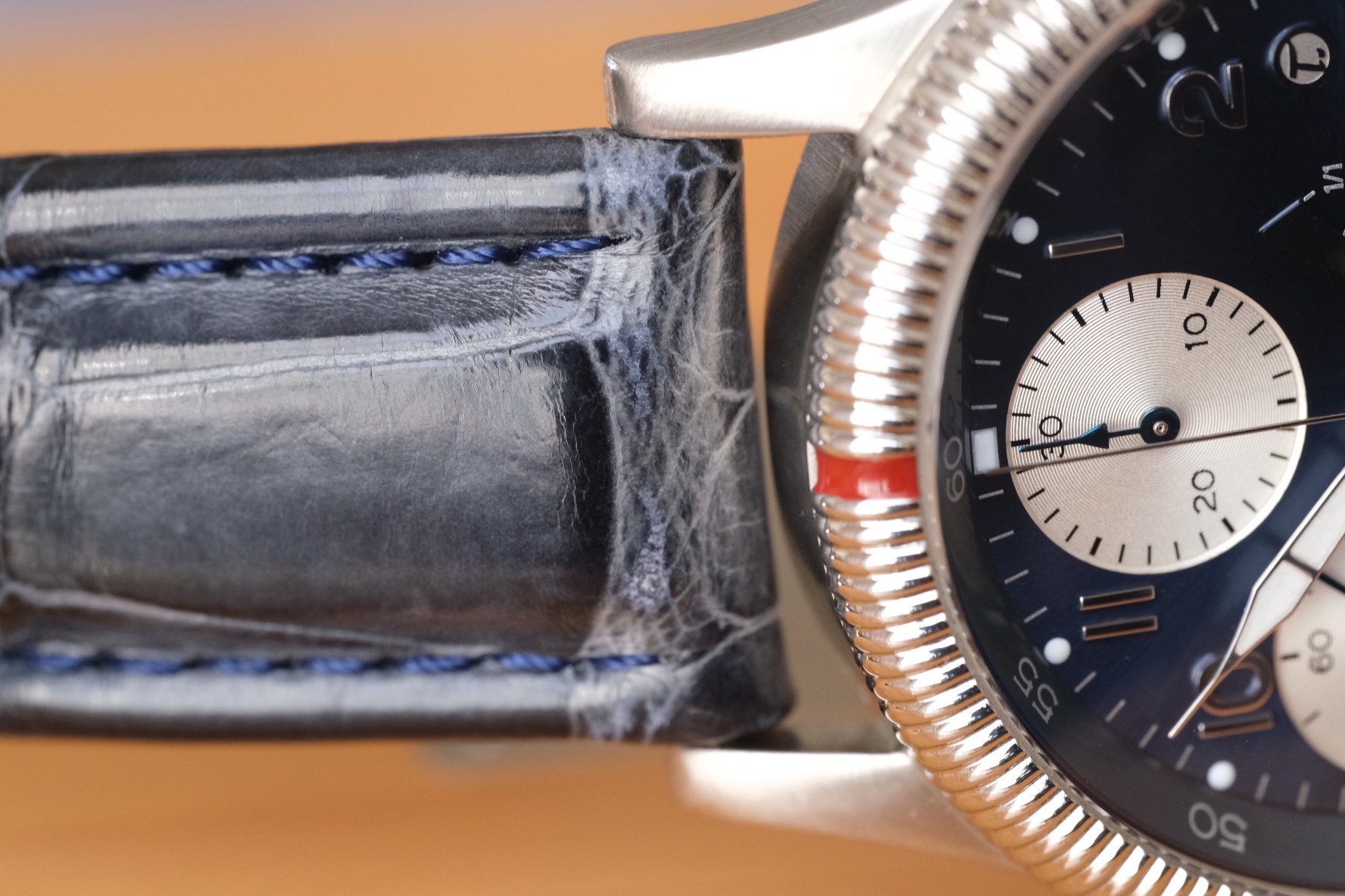 DIAL: Just awesome, the lesser seen metallic blue dial goes from dark royal to a bright blue depending on how the light hits it. Dial has a very clean chronograph layout, with the addition of a power reserve indicator, and of course those amazing throwback hands! All looks pristine and seen under an equally pristine sapphire crystal.