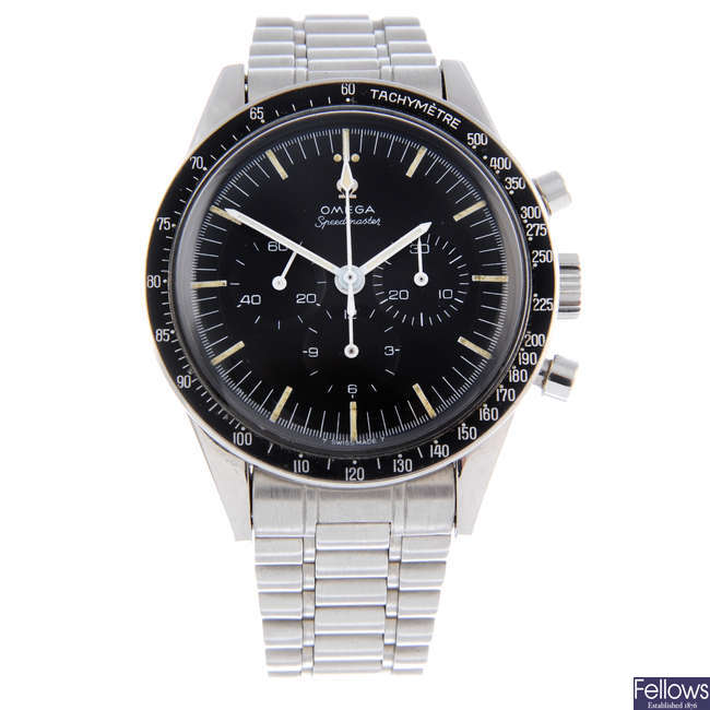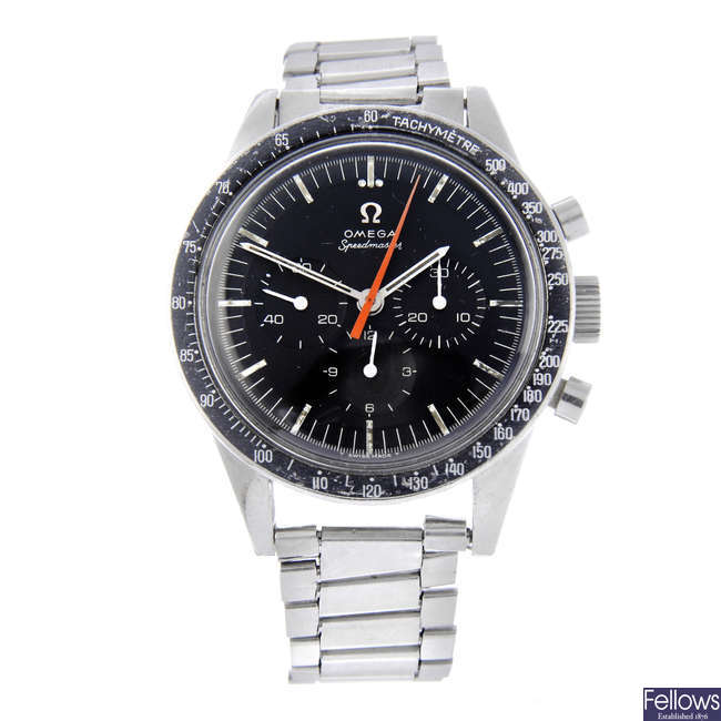 "OMEGA - a gentleman's Speedmaster 'Ed White' chronograph bracelet watch. Stainless steel case with tachymeter bezel. Reference ST105.003-65. Signed manual wind calibre 321, numbered 24957072. Black dial with luminous baton hour markers, subsidiary recorder dials to three, six and nine. Fitted to a signed stainless steel bracelet with folding clasp, reference 1035. 40mm."