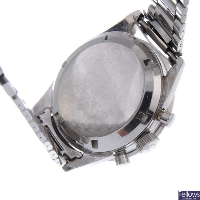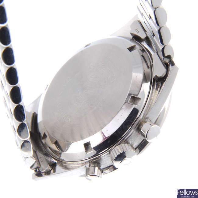 "OMEGA - a gentleman's Speedmaster "Ed White" chronograph bracelet watch. Stainless steel case with tachymeter bezel. Reference ST 105 003-65. Signed manual wind calibre 321. Black dial with luminous hour markers, subsidiary recorder dials to three, six and nine. Fitted to a signed stainless steel bracelet with folding clasp. 40mm. Service papers."