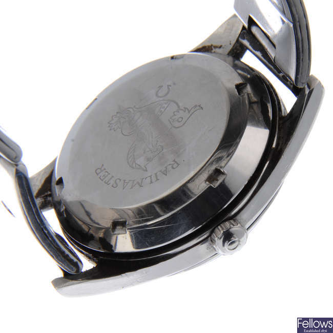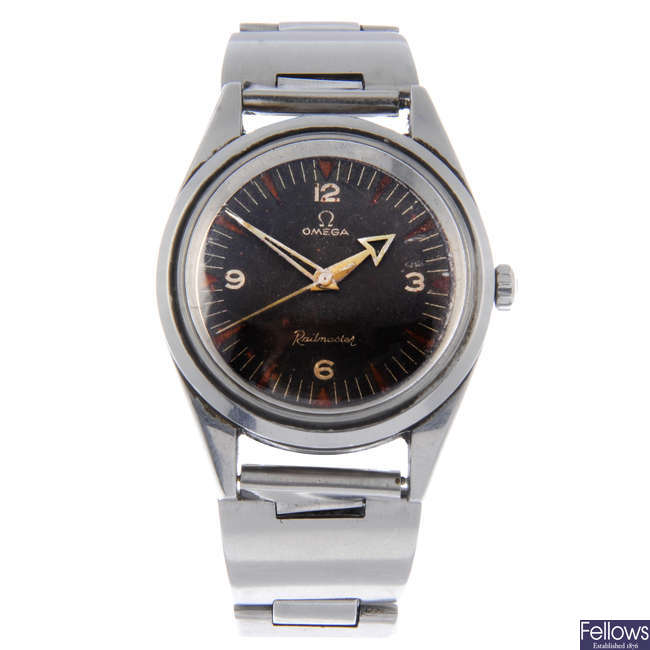 "OMEGA - a gentleman's Railmaster bracelet watch. Stainless steel case. Numbered 2914-2. Signed manual wind calibre 284, numbered 16279502. Black dial with arrowhead hour markers, quarterly Arabic numerals. Fitted to an unsigned stainless steel bracelet with folding clasp. 38mm."