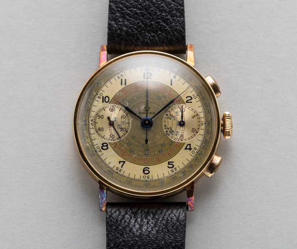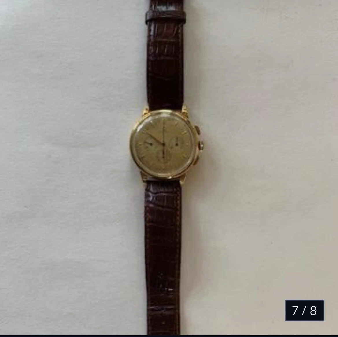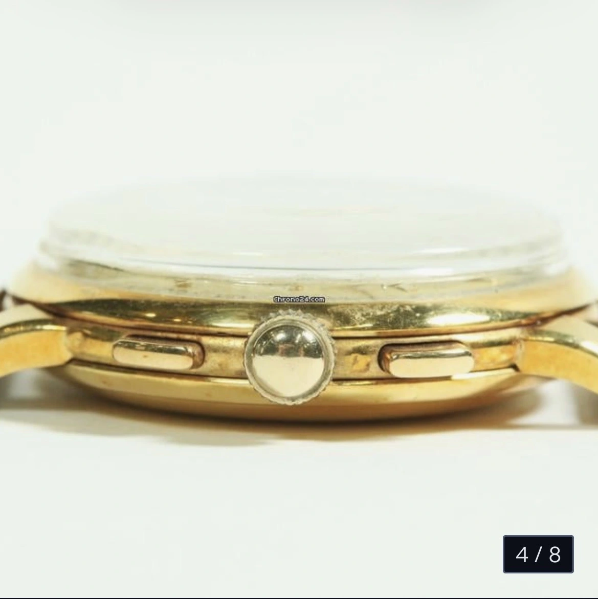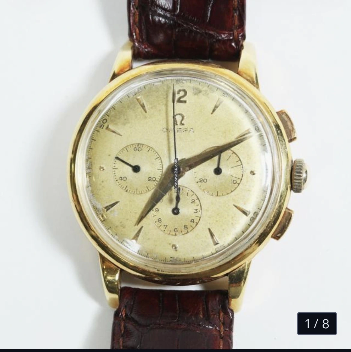 Watch 1. 1947 chronograph. Ref 2466. Cal. 321. 18ct yellow gold. Dealer quoting case is 38mm. Condition quote: good. No box. No papers. £4477. Claiming crown was replaced by Omega, but no logo? Seems odd? Also, there are no images of the movement, but quoting Cal. 321. My thoughts, there is wear and the glass looks in poor condition? Also, from my earlier 1st post here, I was very usefully informed 50% of the watch value is in the face. Thoughts on this one please? Doesn’t look too great to me?