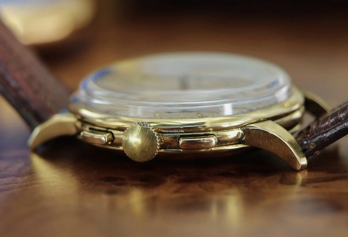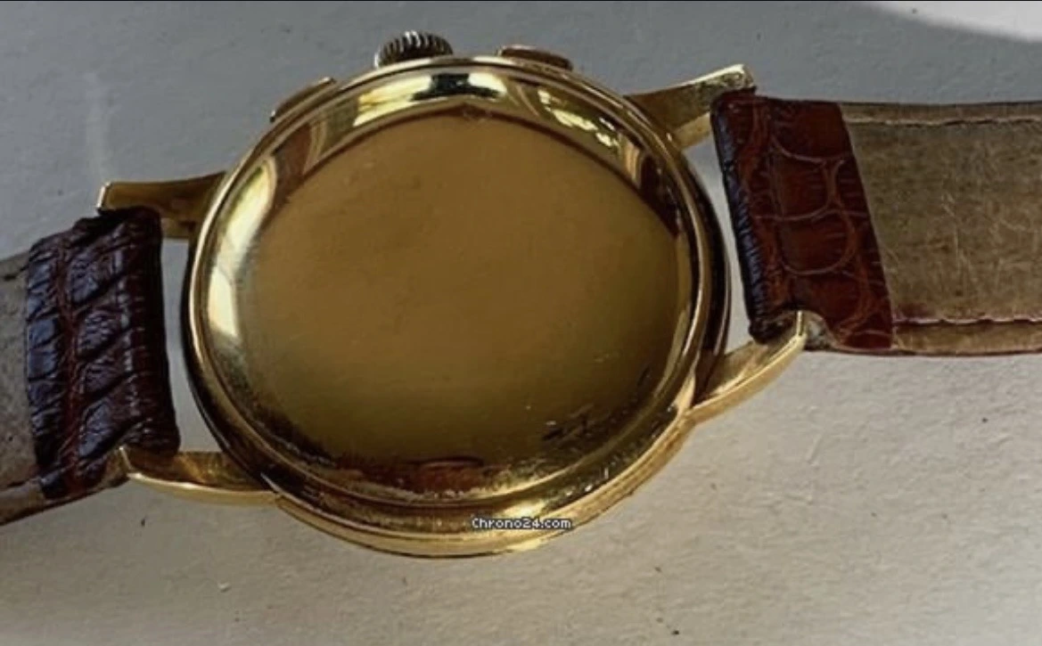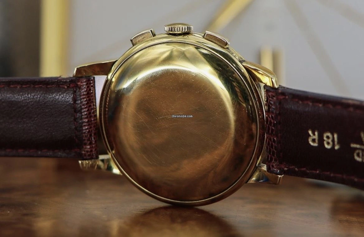 Watch 2. 1950’s chronograph. Ref 2466. 18ct yellow gold. Case size, 38mm. Cal. 321. Condition quote: very good. No box. No papers. £6282. To my inexperienced eye, this timepiece looks in better condition than watch 1 and this is obviously reflected in the price?