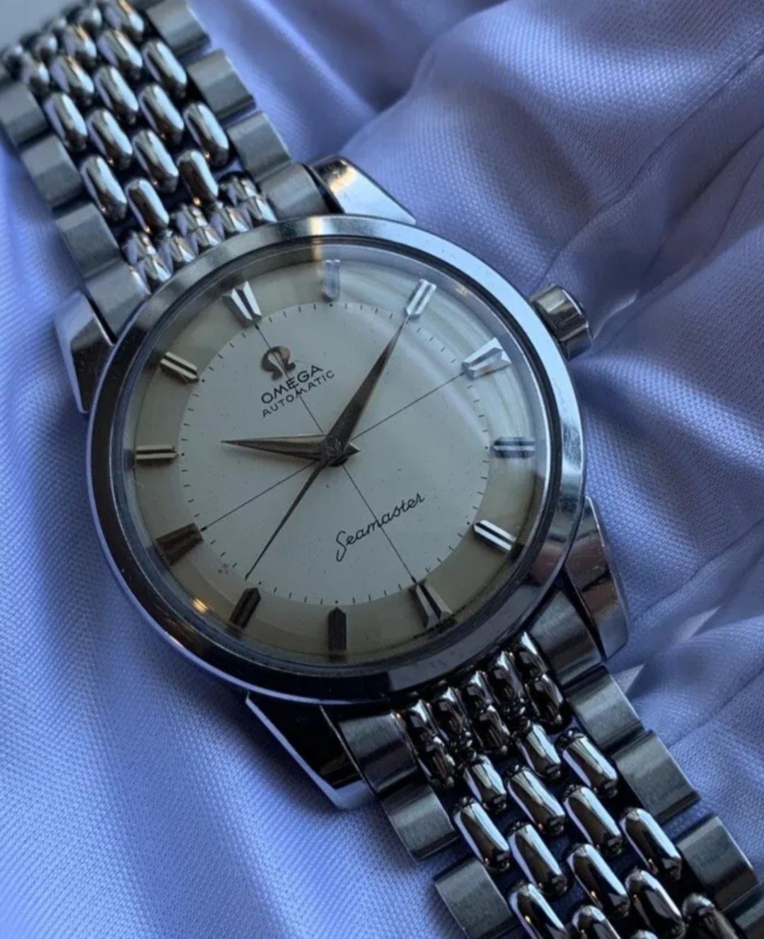 The first advertised as a Seamaster 2846 with no date calibre 501 20 jewel, year 1950-59. All original condition, non luminous original hands, original crown and crystal(with logo). Original 1502 bracelet. Watch we are informed was serviced in 2022.