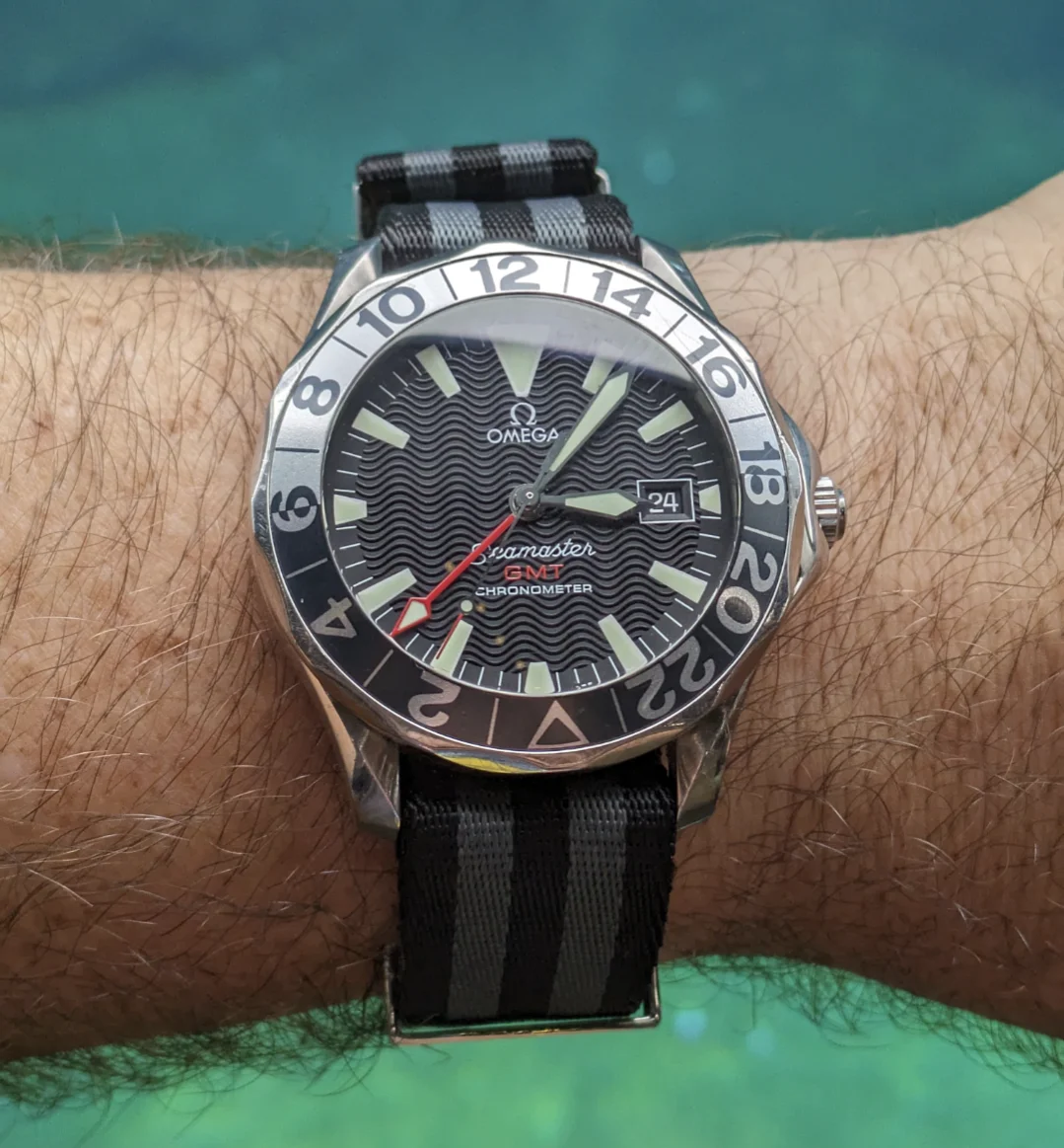 On my Omega GMT, there's a different font for the brand (Omega), the line (Seamaster), and the complication (GMT), and then they also added chronometer just in case I forgot I was looking at a watch, but I think that's the same font as GMT, with different kerning. Plus, I guess the bezel is a different font. I assume the idea is that different fonts will help distinguish the various bits of info and the clarify the hierarchy of the info, but it does start to seem a bit mad the more you look at it.
