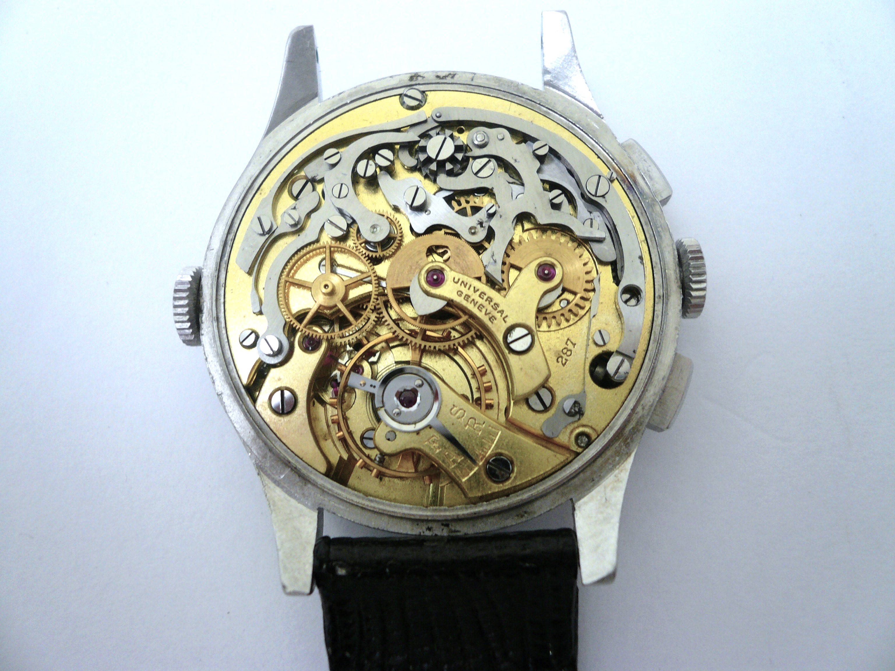 It measures almost 38mm, with square pushers, snap back case and caliber 287 movement