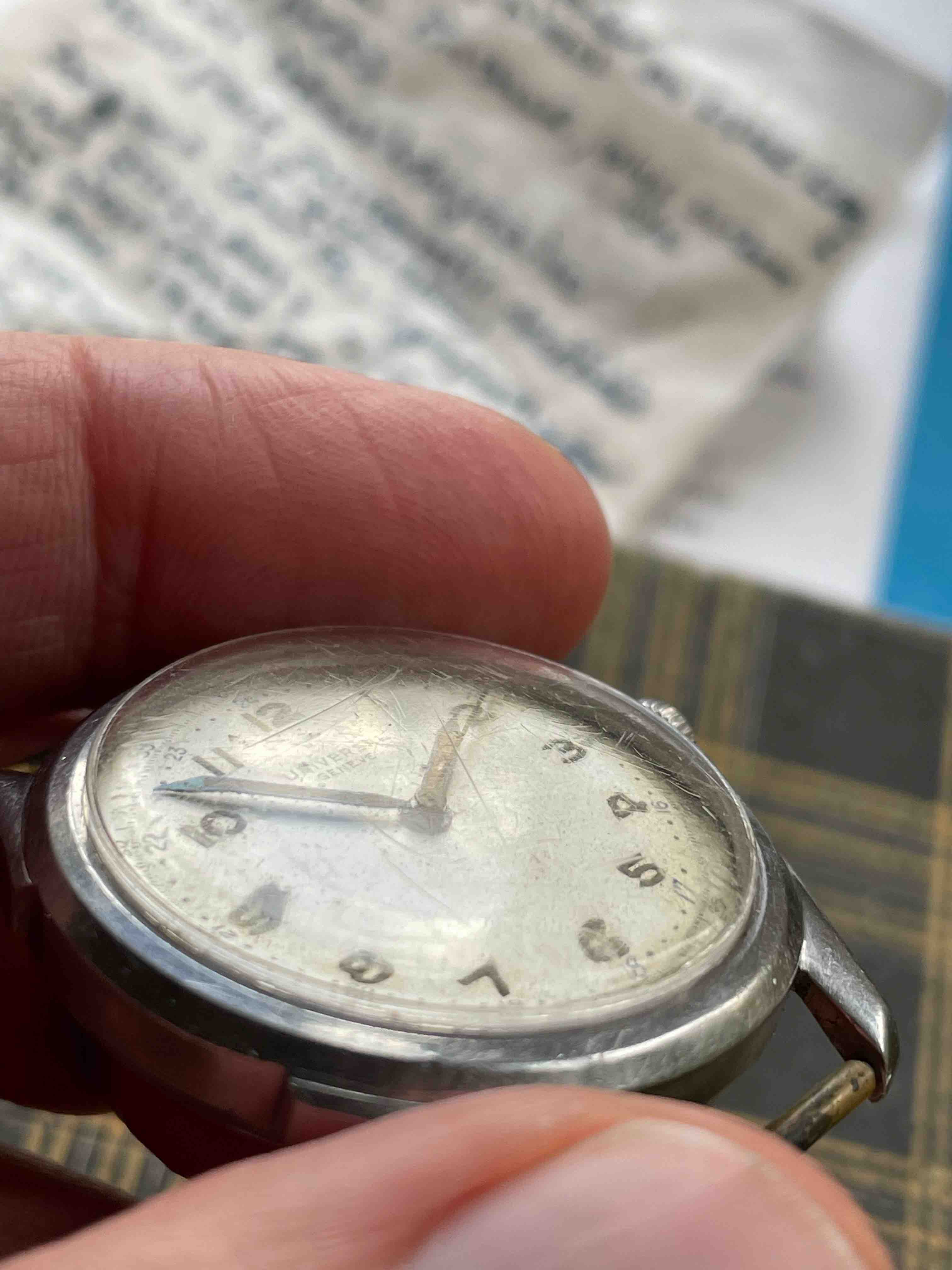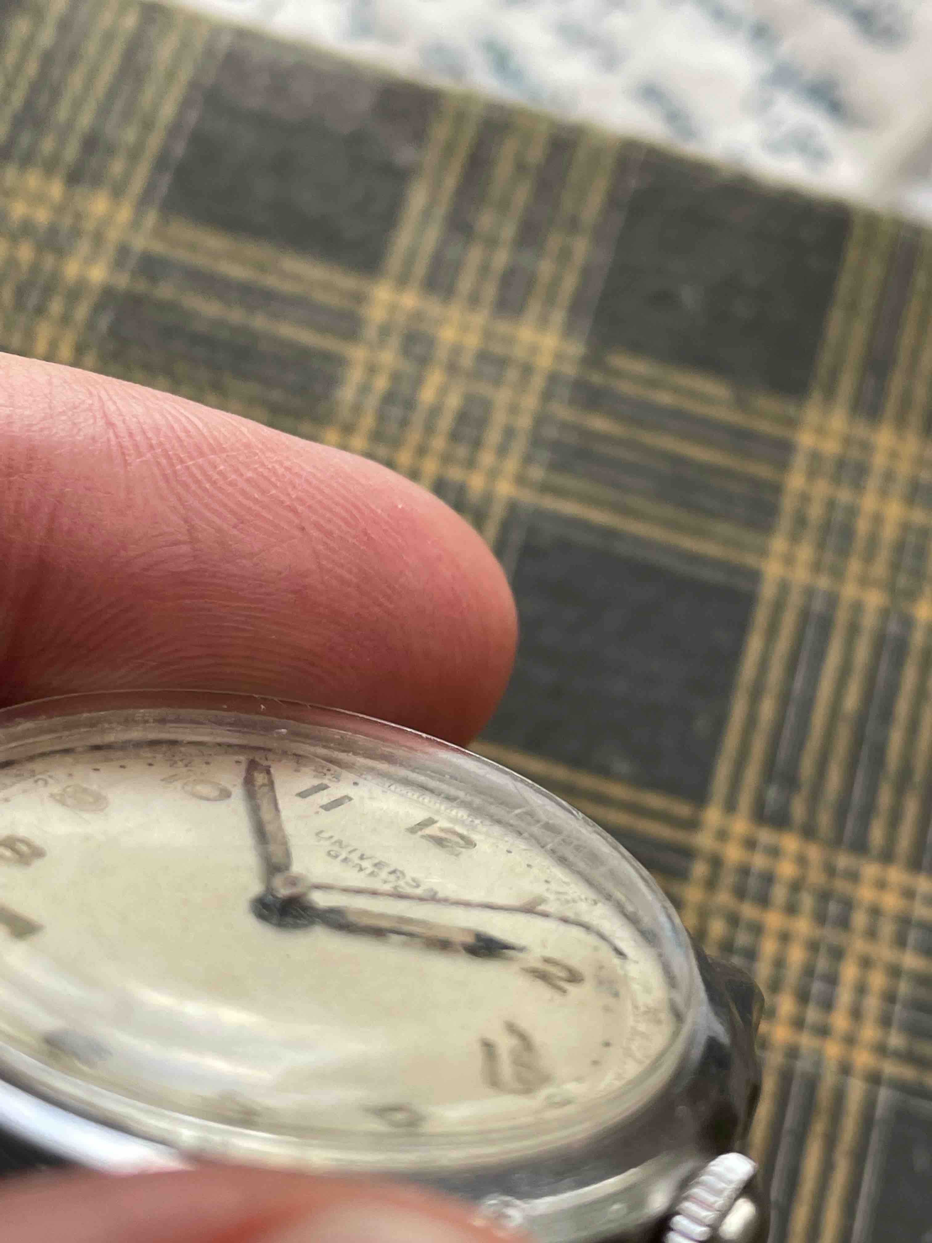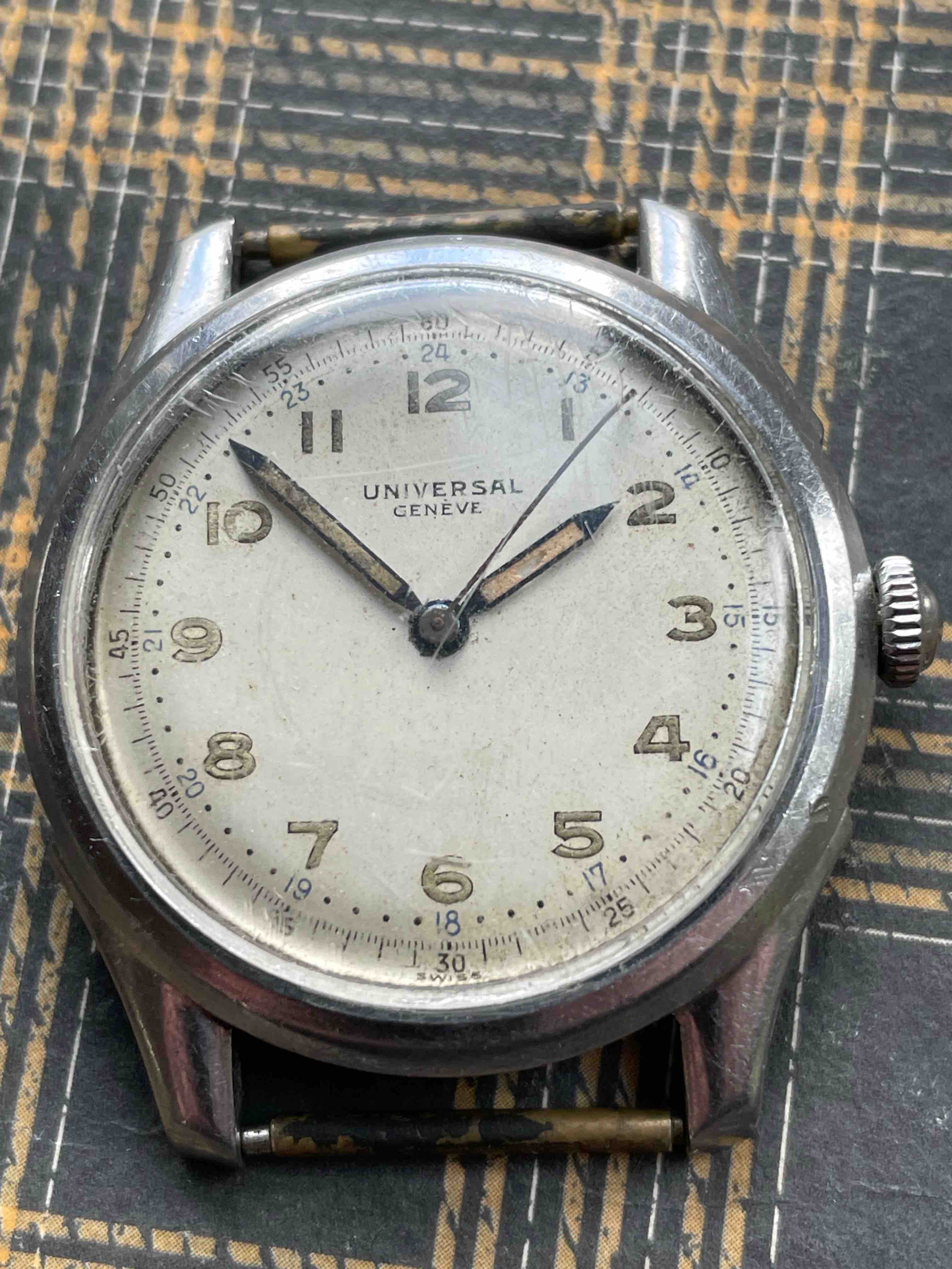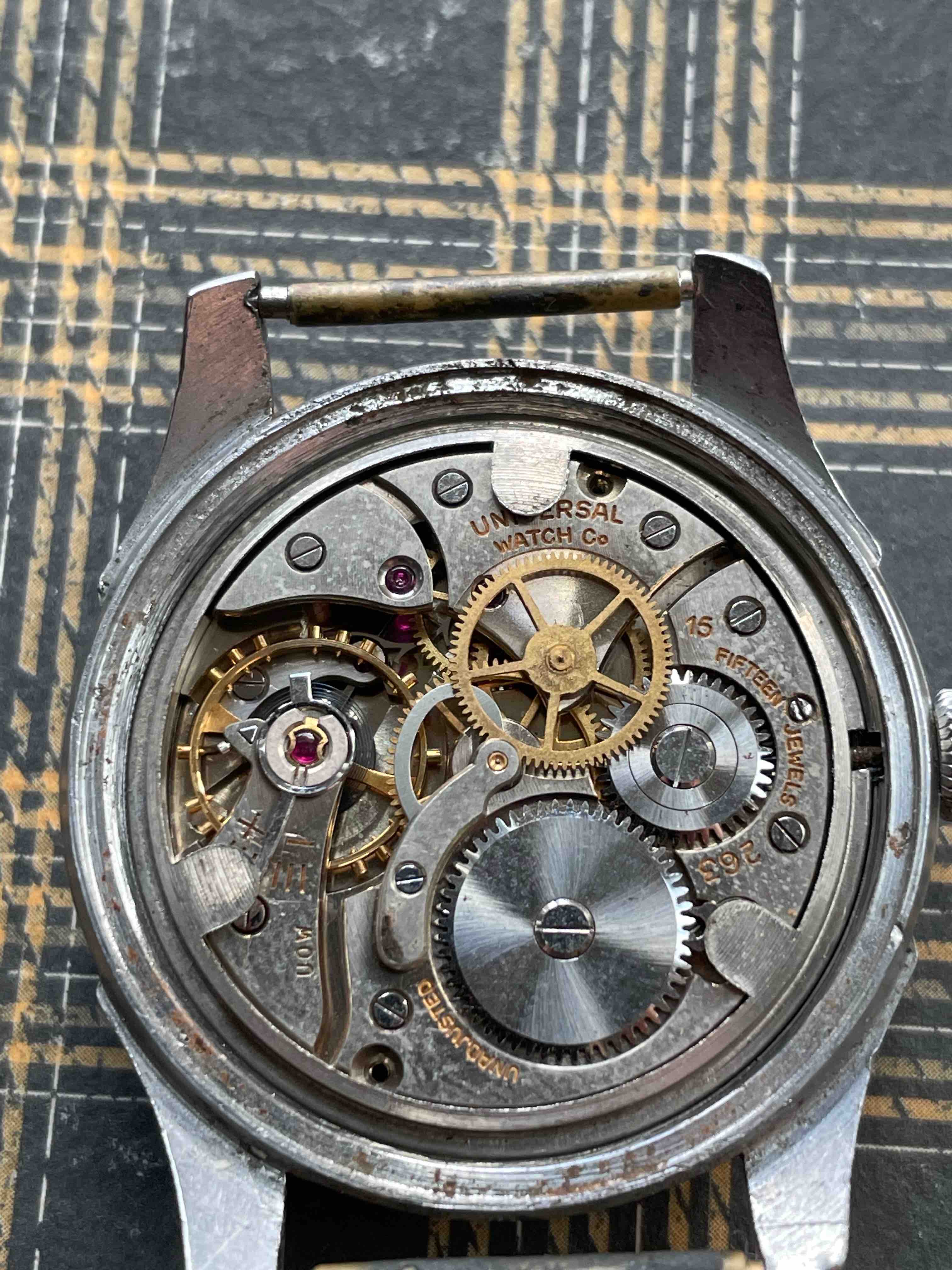 ·The UG 20721 with cal 263 has arrived and I think that its in good shape with what I hope is one minor issue: the tips of the minute and second hands are both bent downwards. Otherwise the dial is in good shape with a little bit of lume loss to 10 and 12 (and the hour hand). The case looks good to me with a ding to the bezel at 4 and damage to the slots on the case-back at 1 and 7. While the movement is not running it just looks a little dirty rather than oxidized (with the possible exception of the tail of the sweep seconds cock). Overall I believe that everything should clean up nicely. Thanks to @bgrisso for pointing out the listing and @Larry S for seconding it.