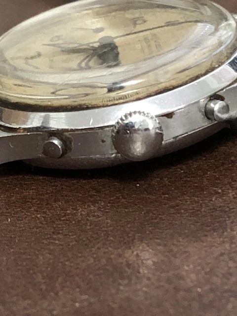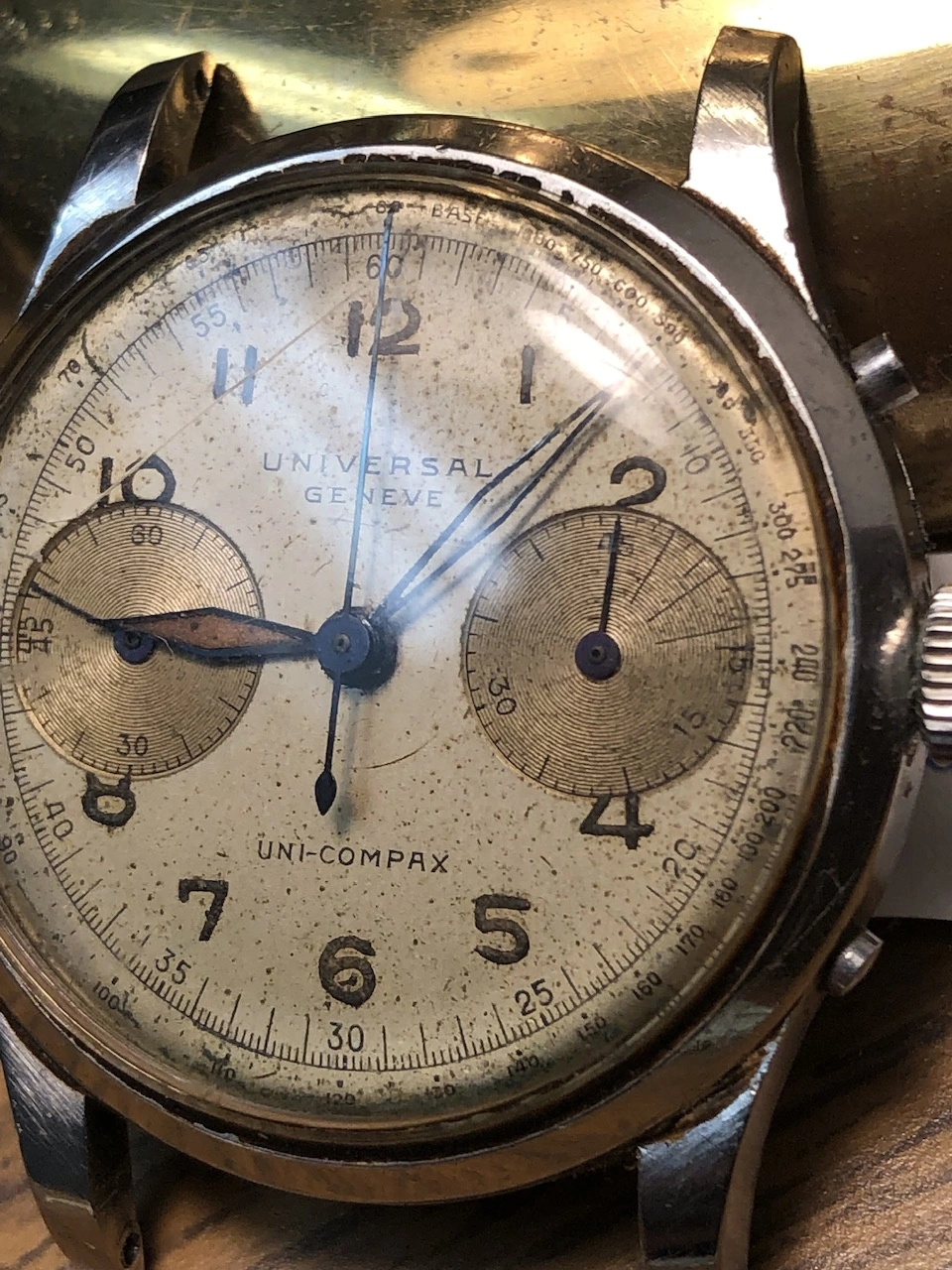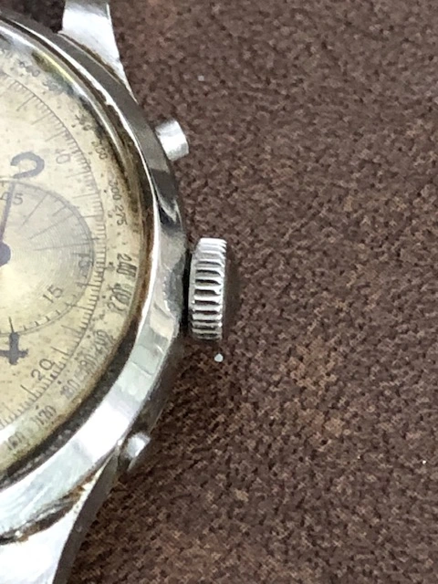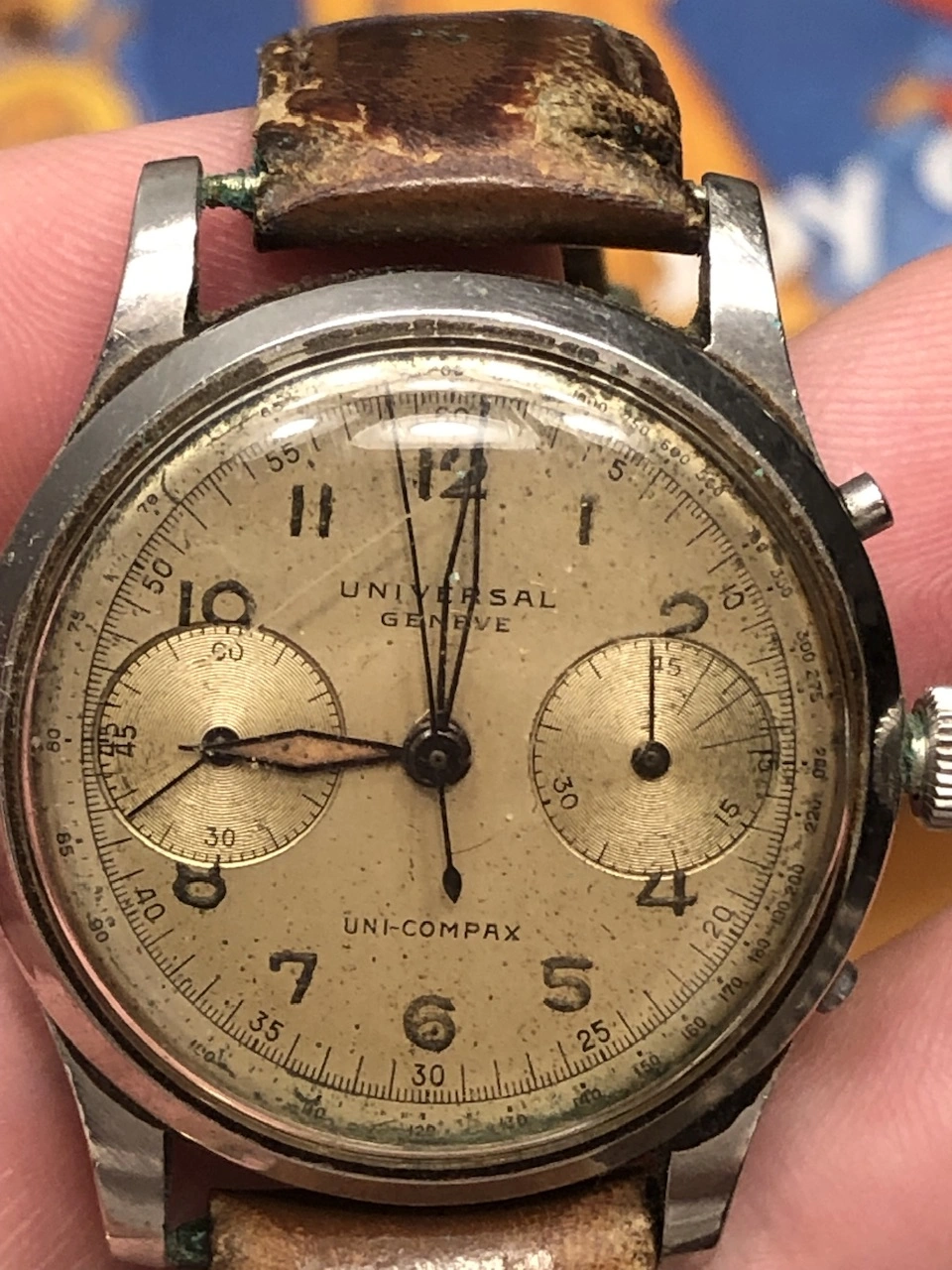 Patina is, let’s say intense, but still charming. Unfamiliar with if or how that might clean-up. Looks to have double stamped 45s and 15s which I’ve seen on a few faces, and debated a bit here. 36mm case. Maybe a 287cal? Tiny pushers on the case too.