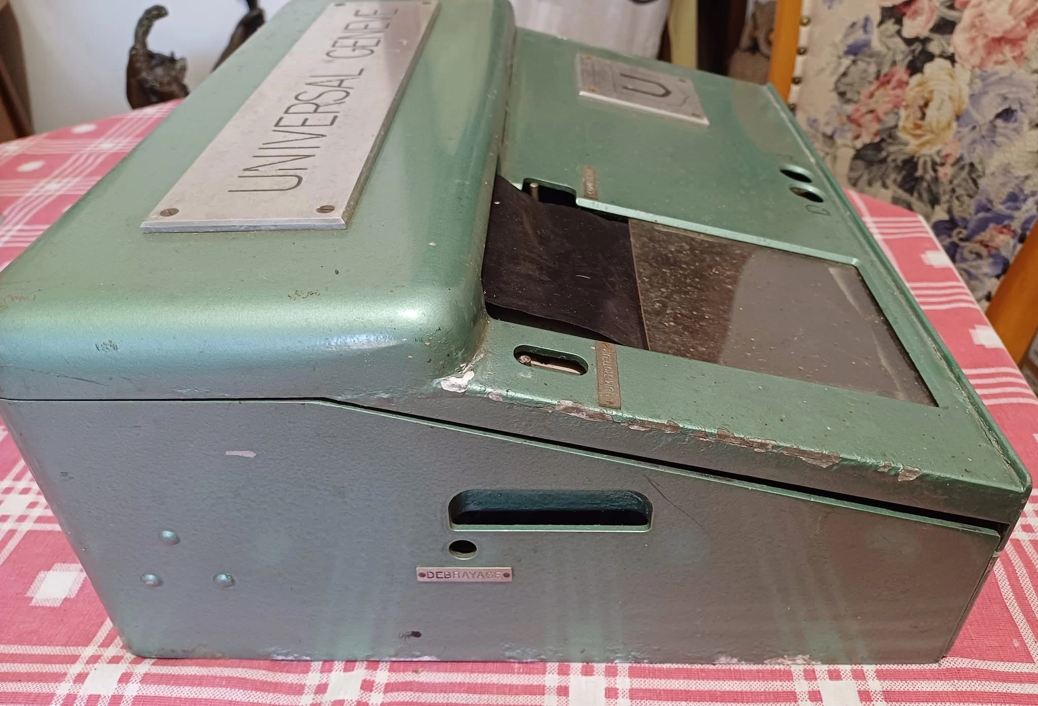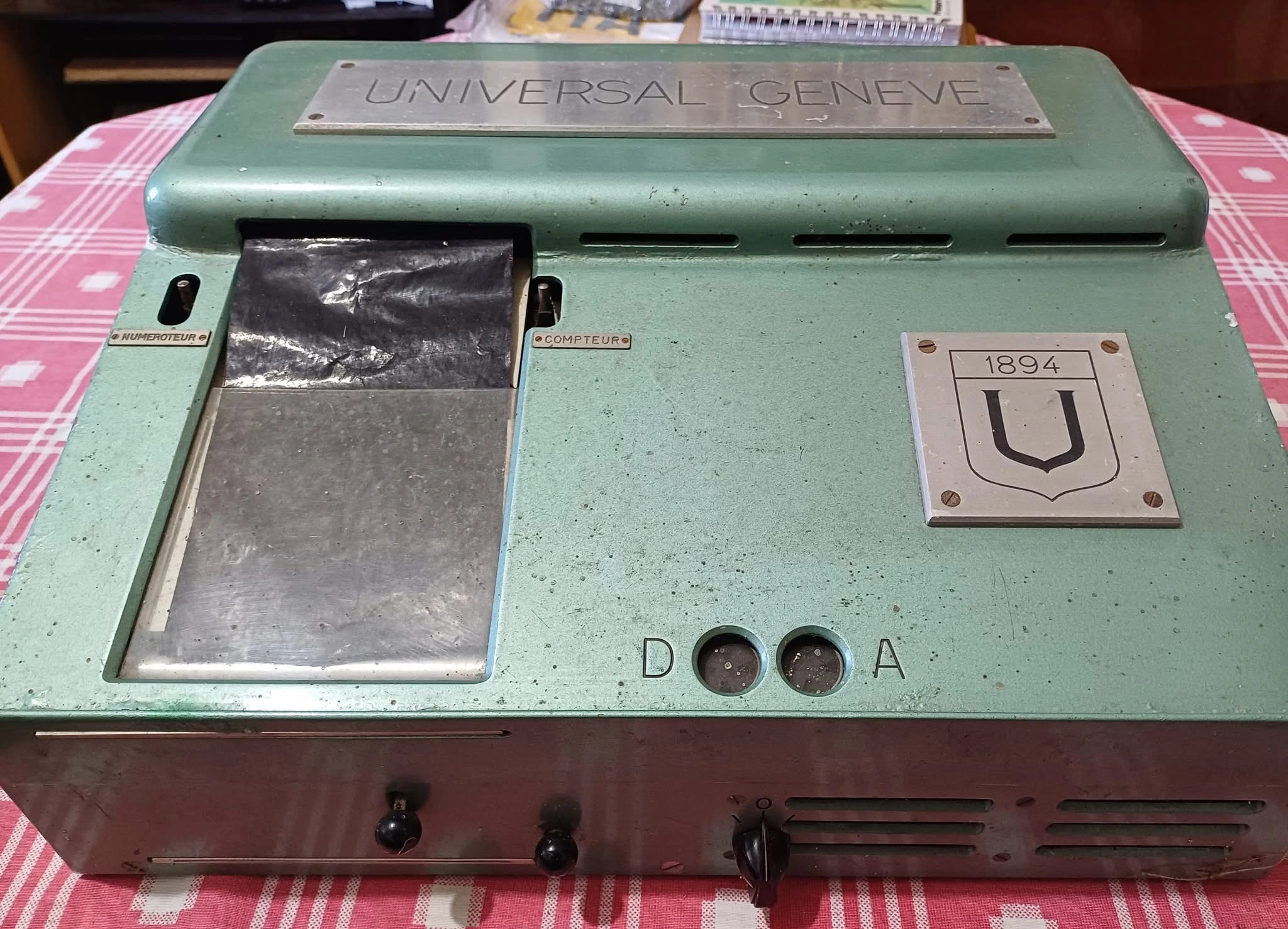 Few Universal Genève-branded timing machines survive. Most were dismantled when solid-state Witschi timers replaced paper-record systems in the 1970s. This surviving unit, with intact plates, glass, and internal tubes, represents a rare industrial artifact of mid-century Swiss horological engineering.
