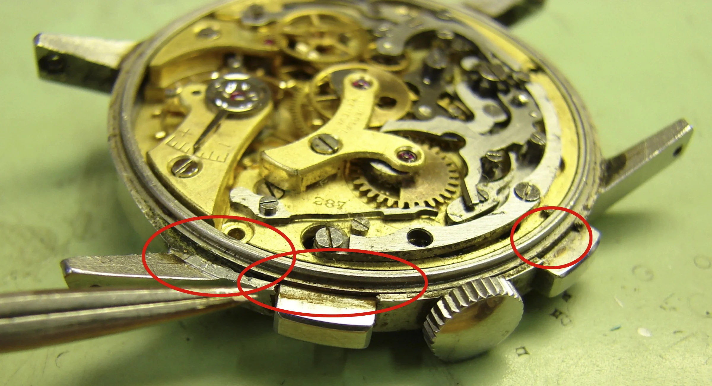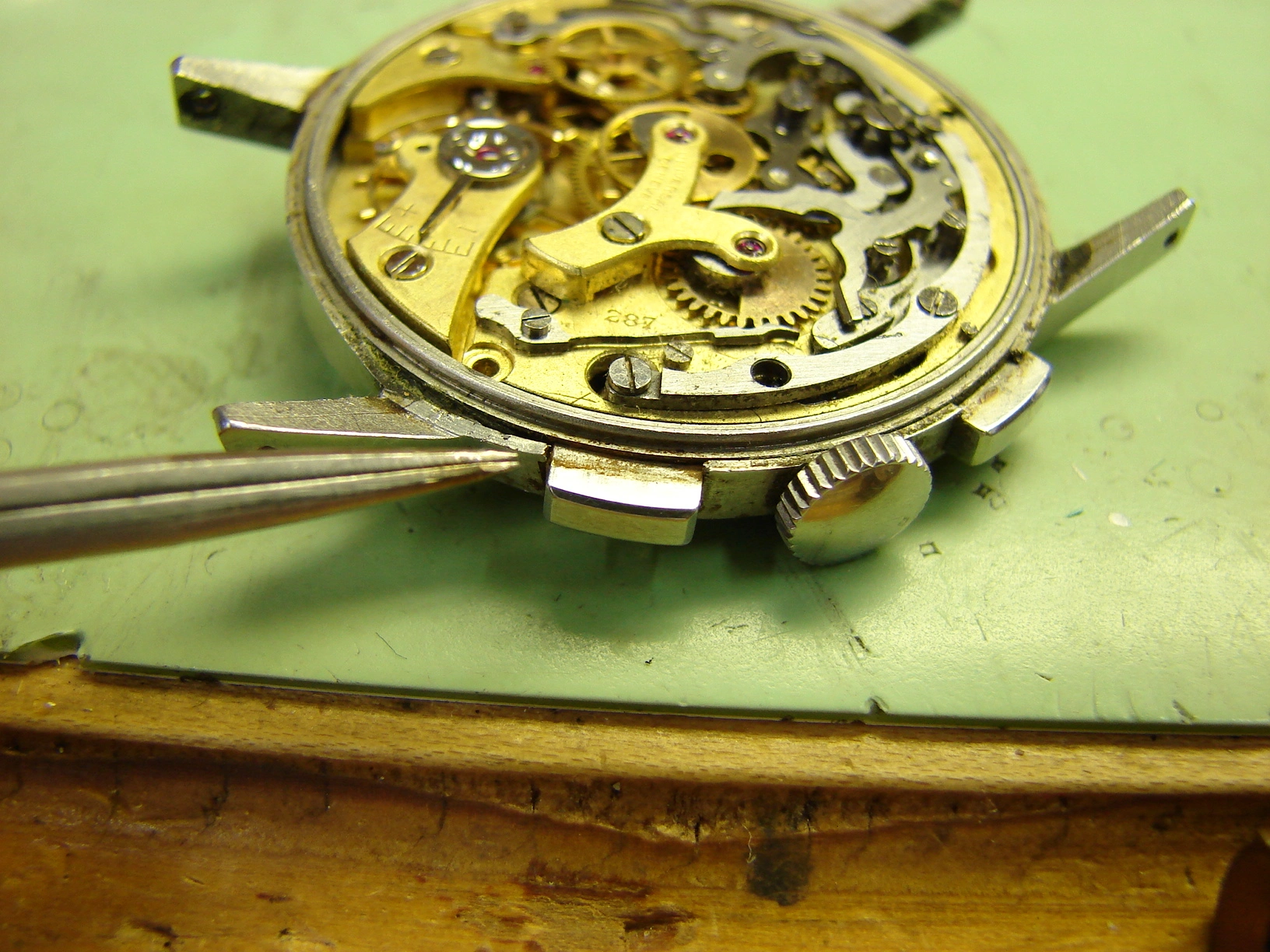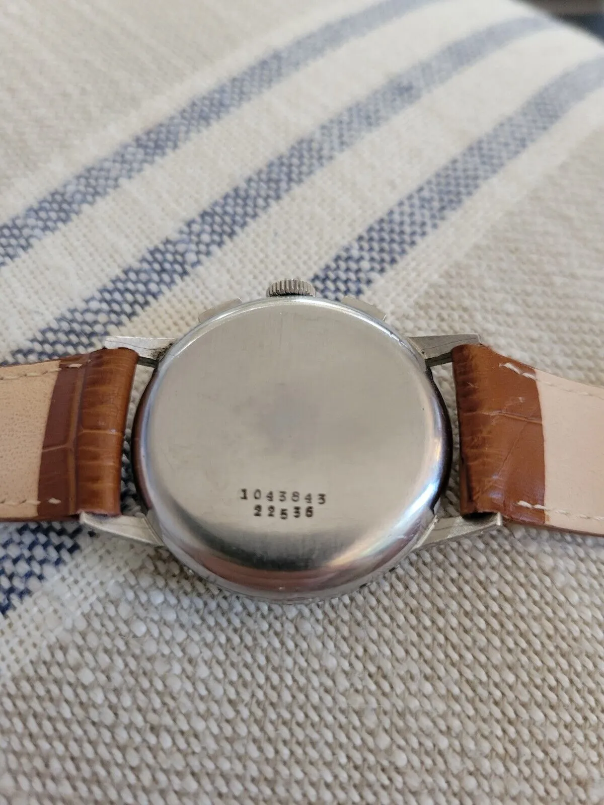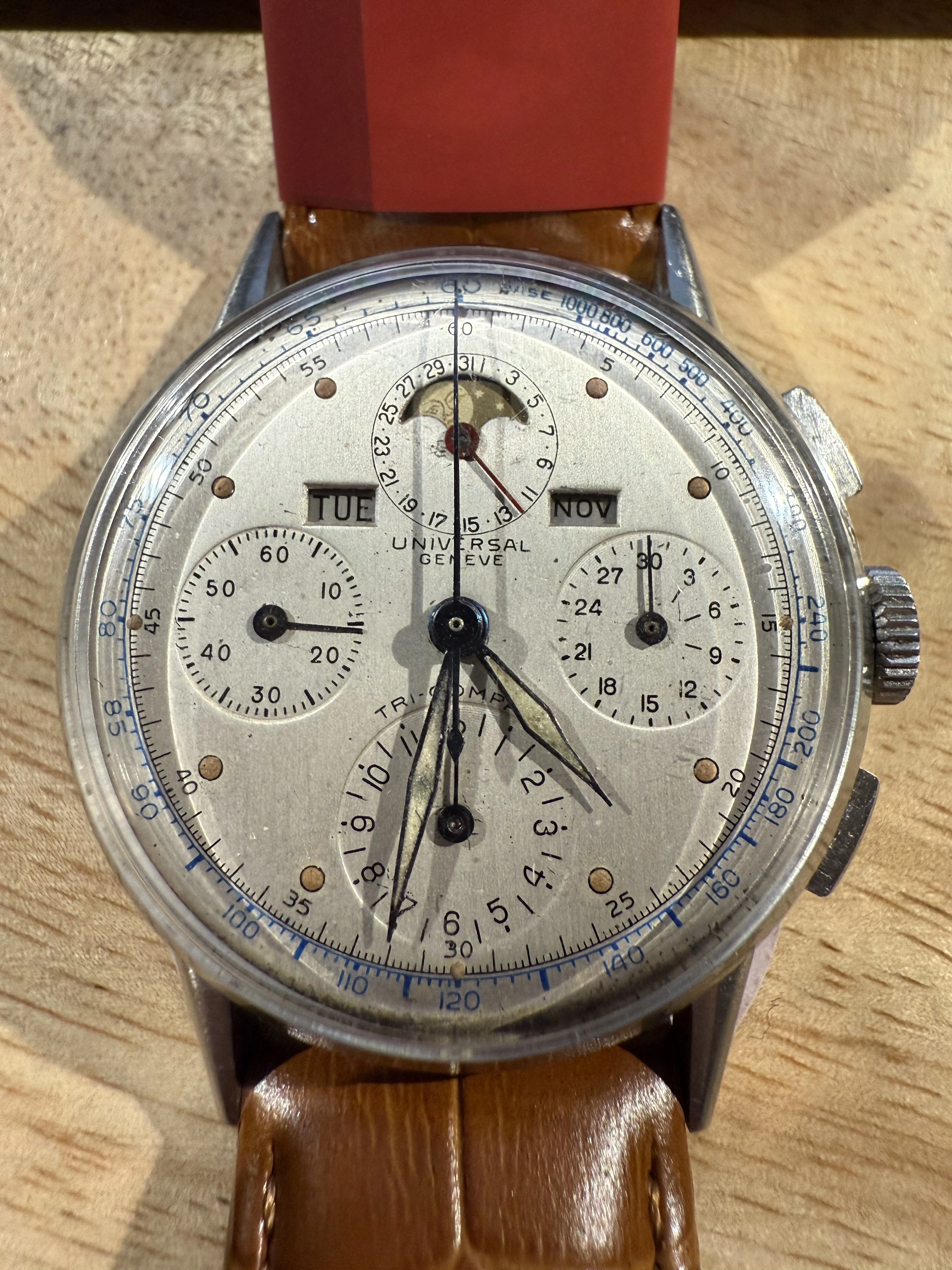 ·I'm new to watch collecting but pretty soon came to admire the UG Tri-Compax. I took a gamble and purchased this one, receiving it today. I'm pleased with it but wonder what folks more experienced in this watch think about the state of it and perhaps what a ballpark fair market value might be. It was recently serviced and functions well. Just because I think it's interesting to share, the seller, a retired Navy veteran from Maryland, told me he purchased it from the estate of Colonel Charles Read Madary, the public information officer for General Eisenhower in WWII. The family told the seller that it was purchased during the war and worn in service. The first three photos are mine, the other two are from the seller, the last from when he had it serviced. Anything folks have to share is welcome. Thanks all.