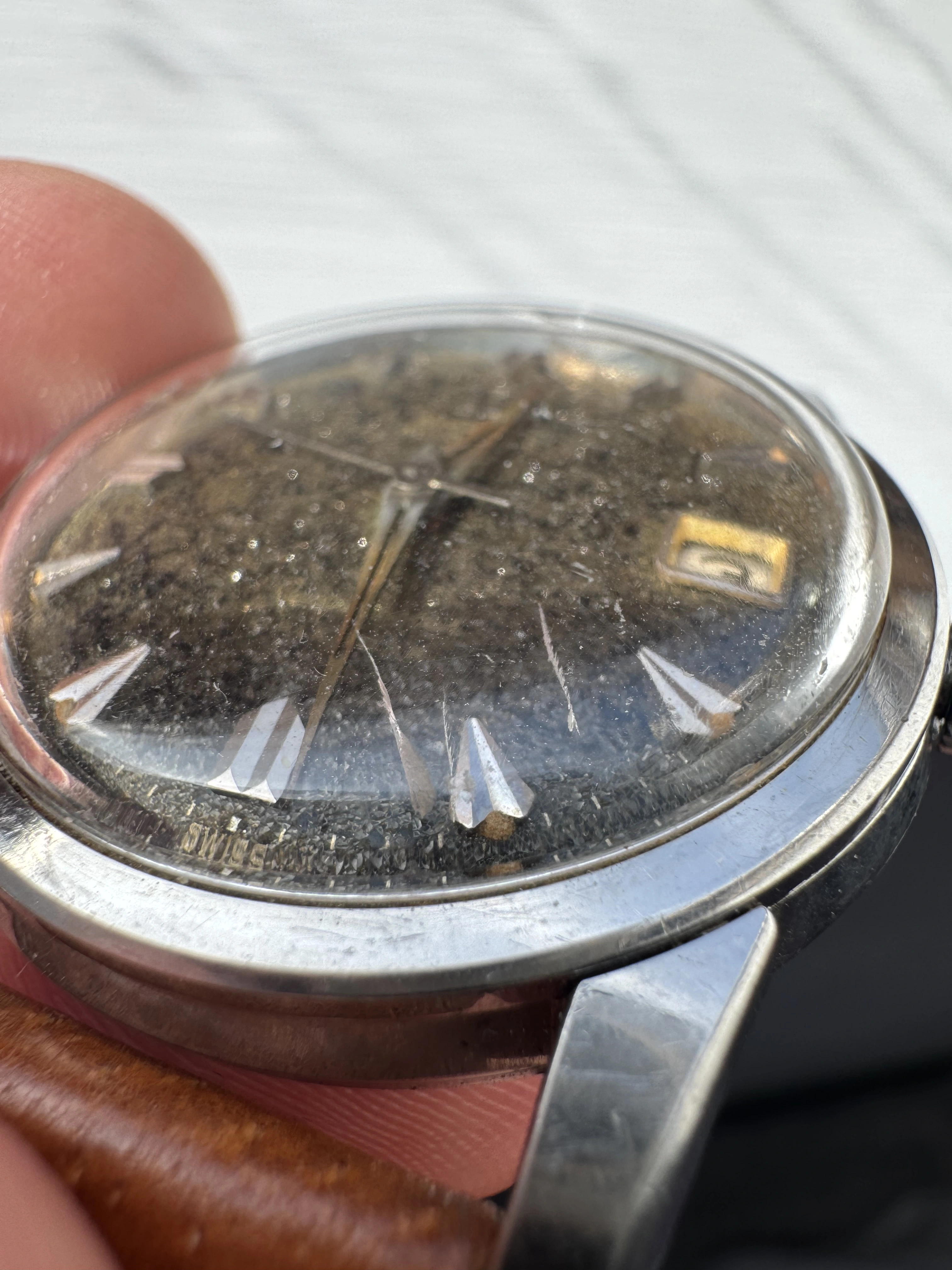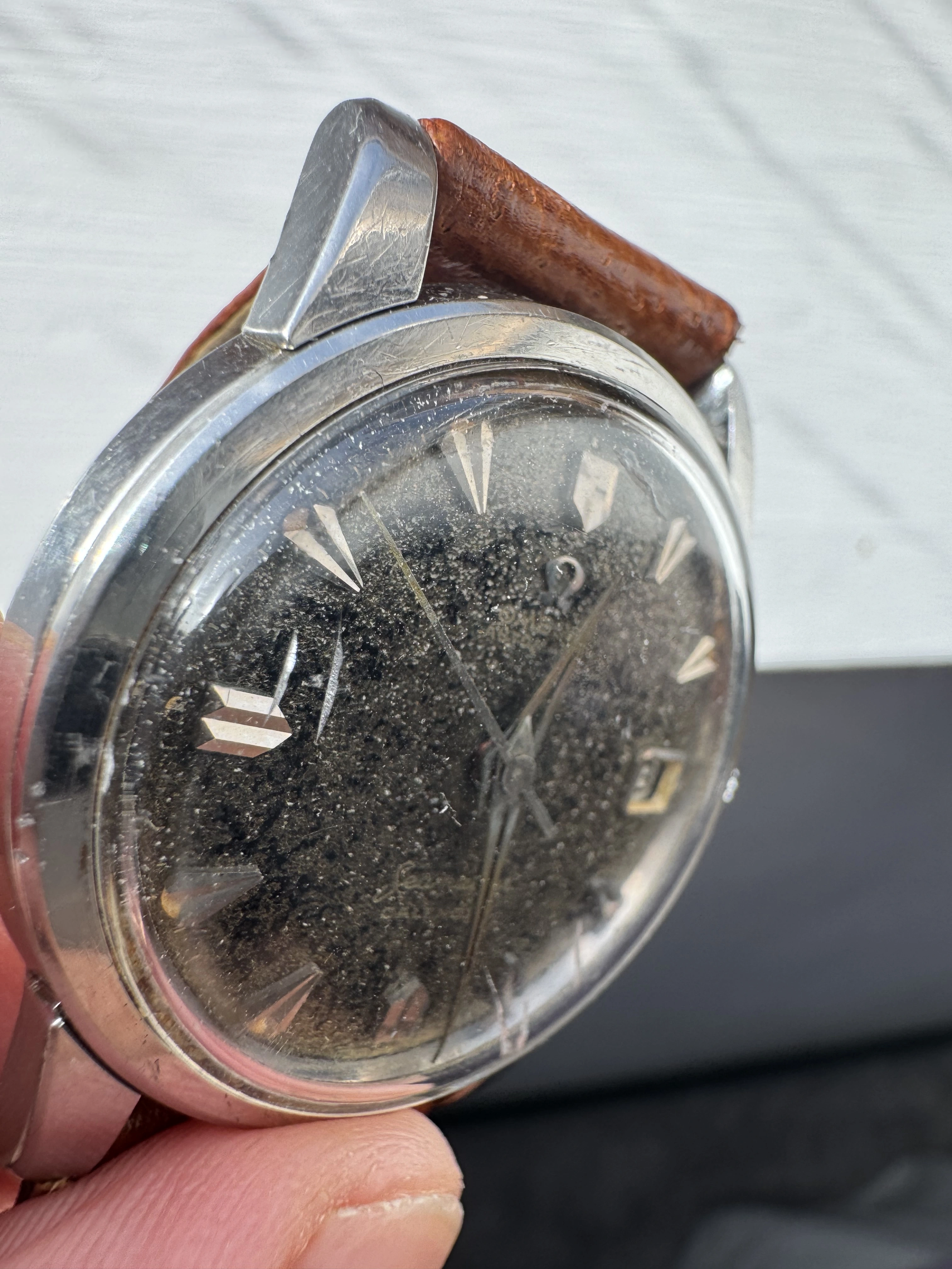I’m going to have the crystal changed, crown changed to flatfoot original. James Hyman to relume the hands and replace the missing plots are 12/3/6/9. Dial is unmarked - crystal is just a state.