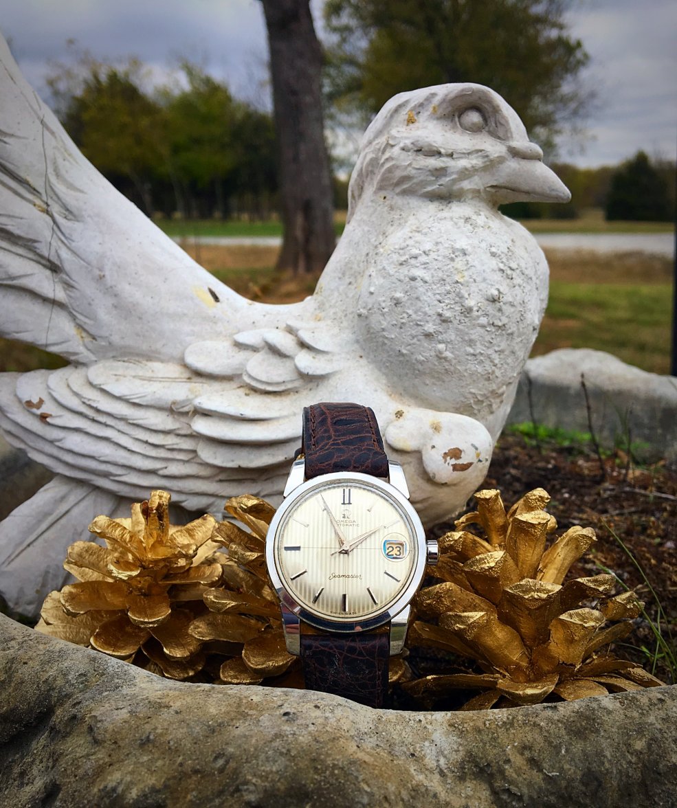 My two sons & I were strangely mesmerized by the odd cracked plaster bird with carbuncled breast proudly thrust forward, a tree springing from its back, foliage hair from its head, its blind eye resolutely ignoring the weirdly juxtaposed three gold-spray painted pine cones and pin-striped watch in the foreground. Trippy.
