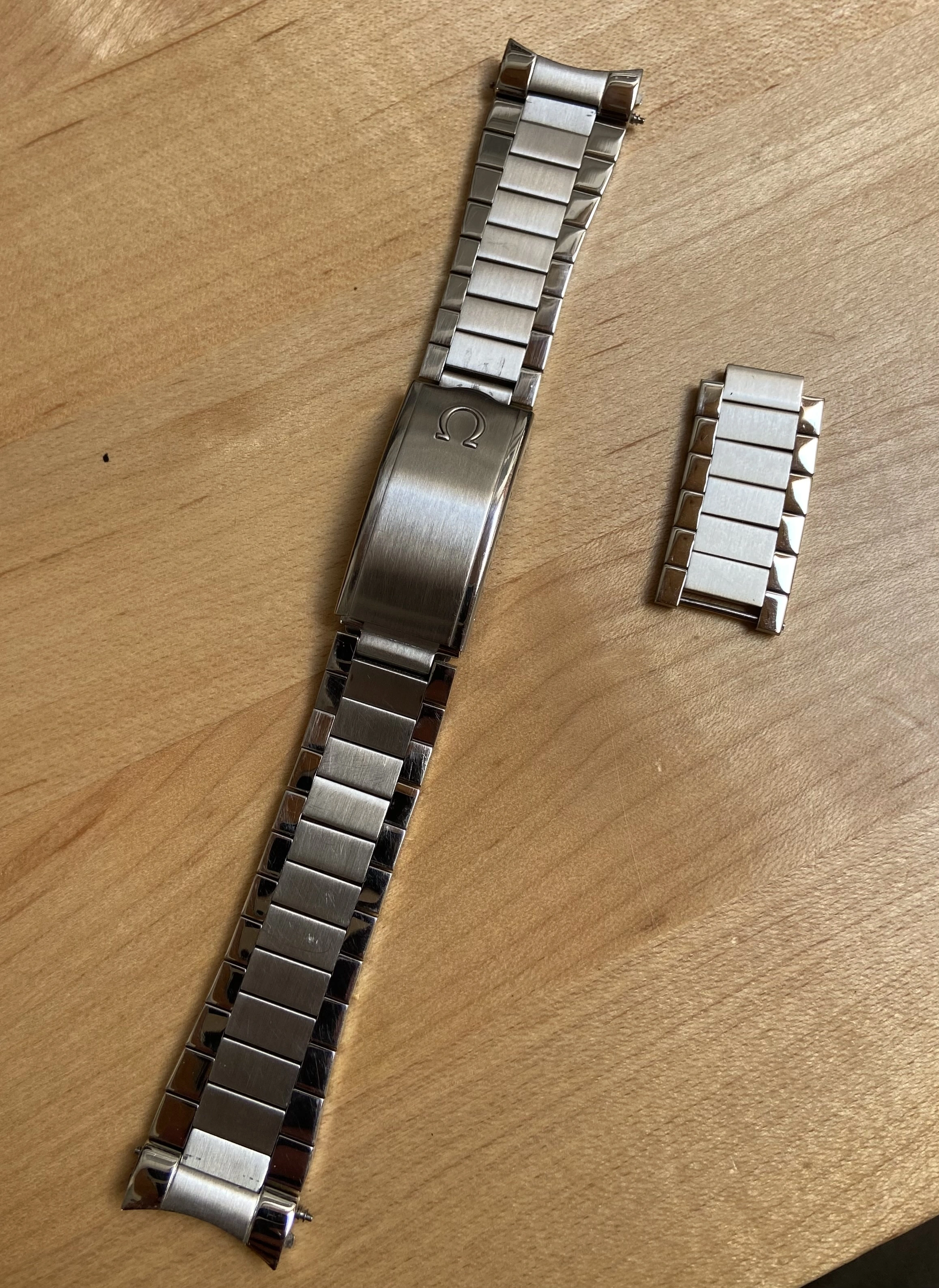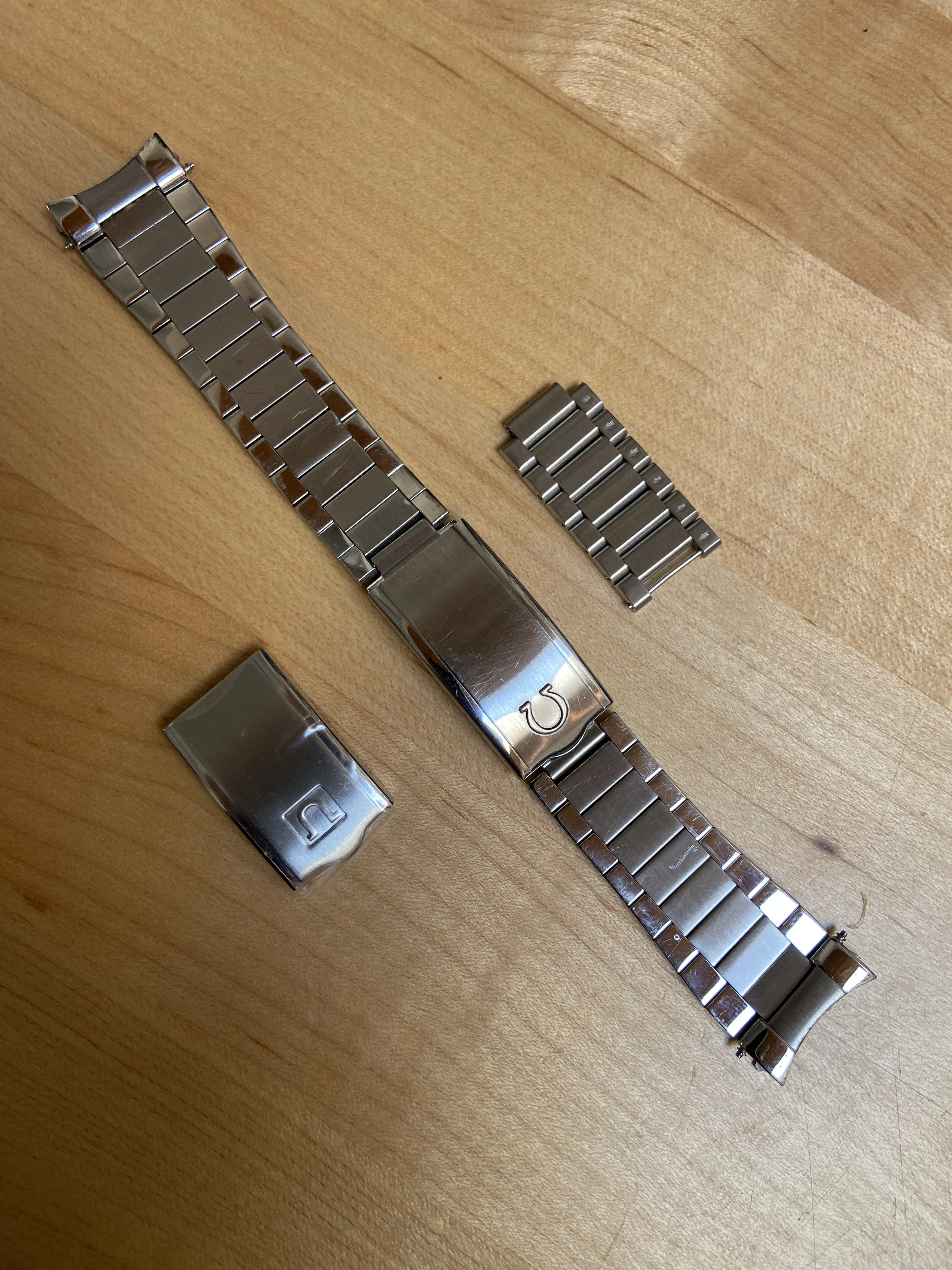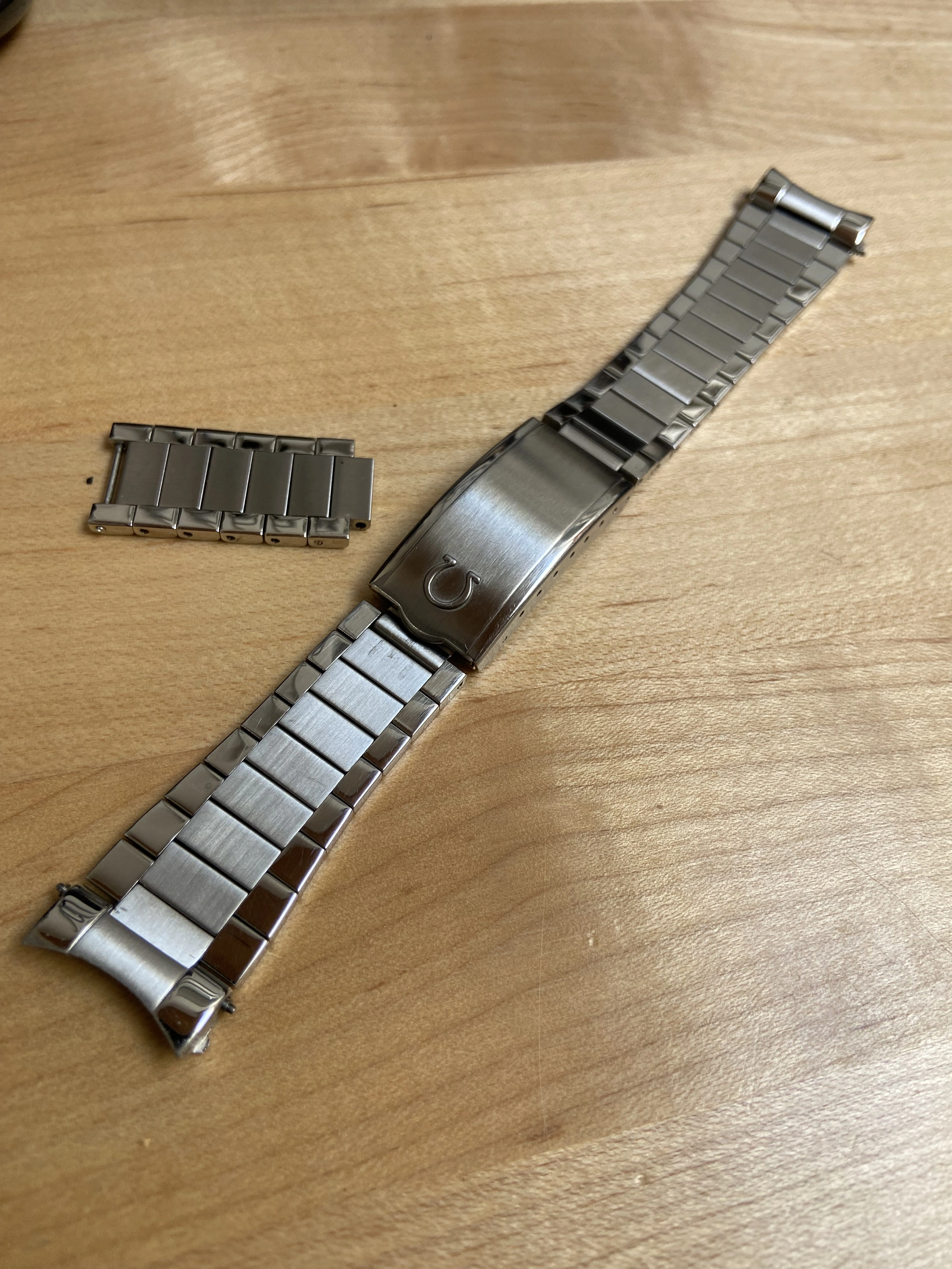 Currently sized for a 7" wrist but all extra links are present and included. Condition is very good with just a few micro-scratches, the Omega clasp cover is very clean with no desk-diver marks. I found this to be a very light and comfortable bracelet, selling it because I sold my FOIS.