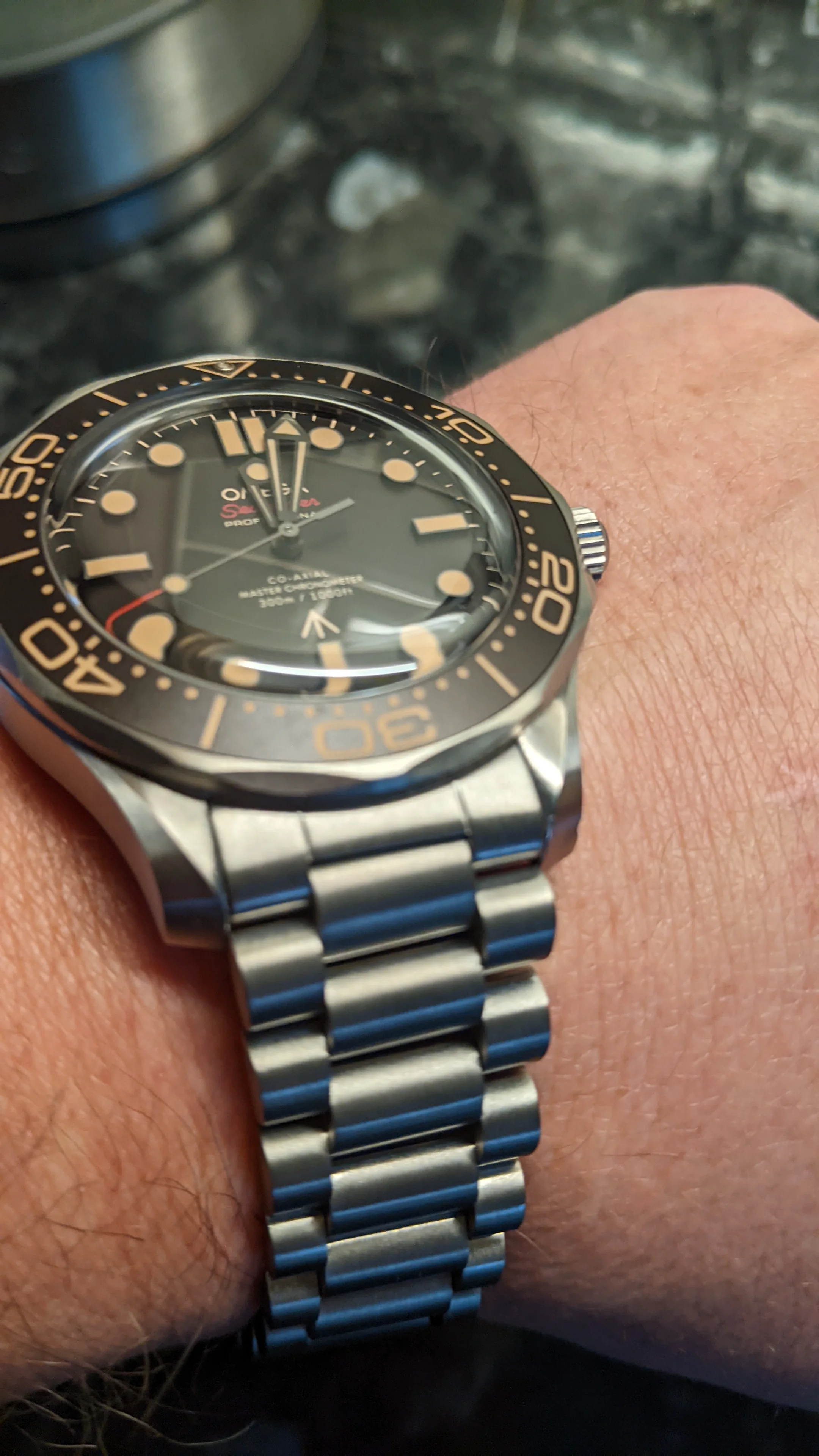 Watch is still very light compared to the SS 300MC Seamaster with the US 1460 I wear that on at times. The bracelet looks identical to the watch case and the solid endlinks are perfectly aligned.