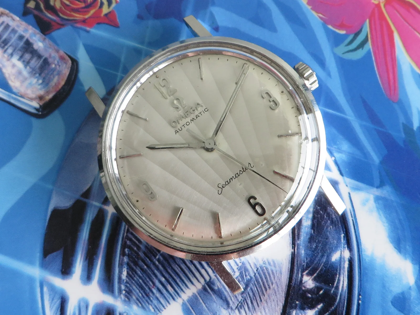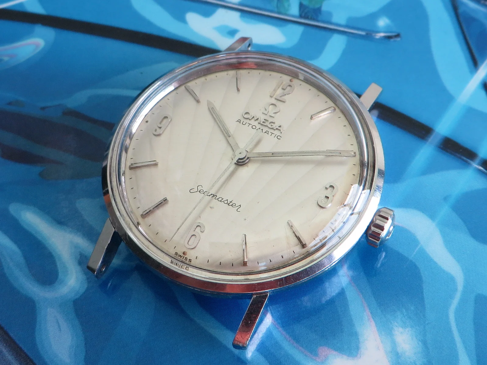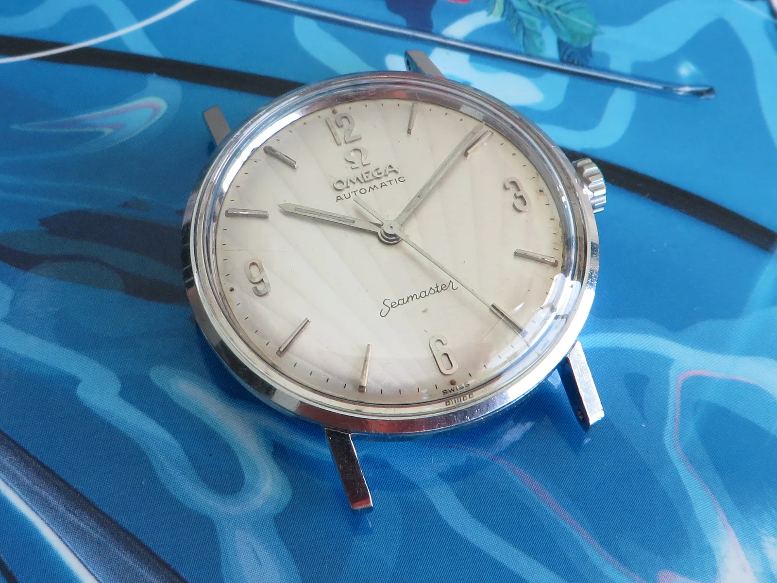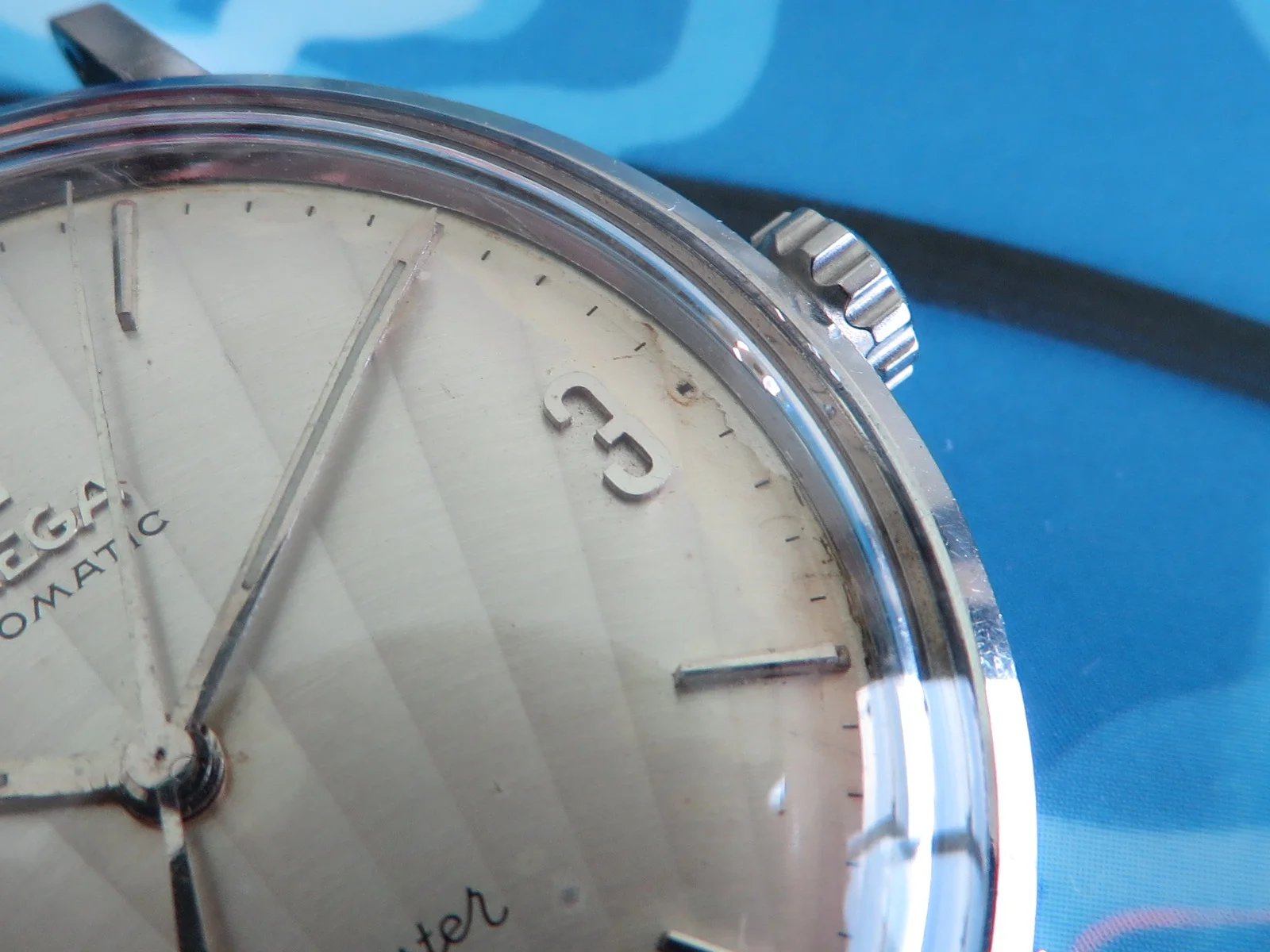 Distinctive original uncommon embossed CLAM SHELL pattern dial in brushed silver with applied tapered multi-faceted markers and Arabic numerals, Omega symbol and script. Far from perfect, but when is the last time you saw one?