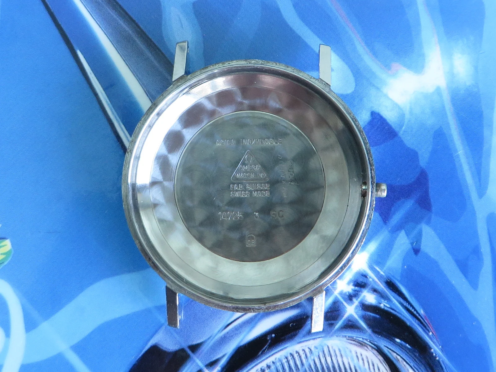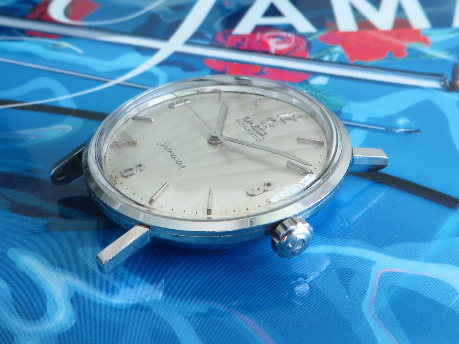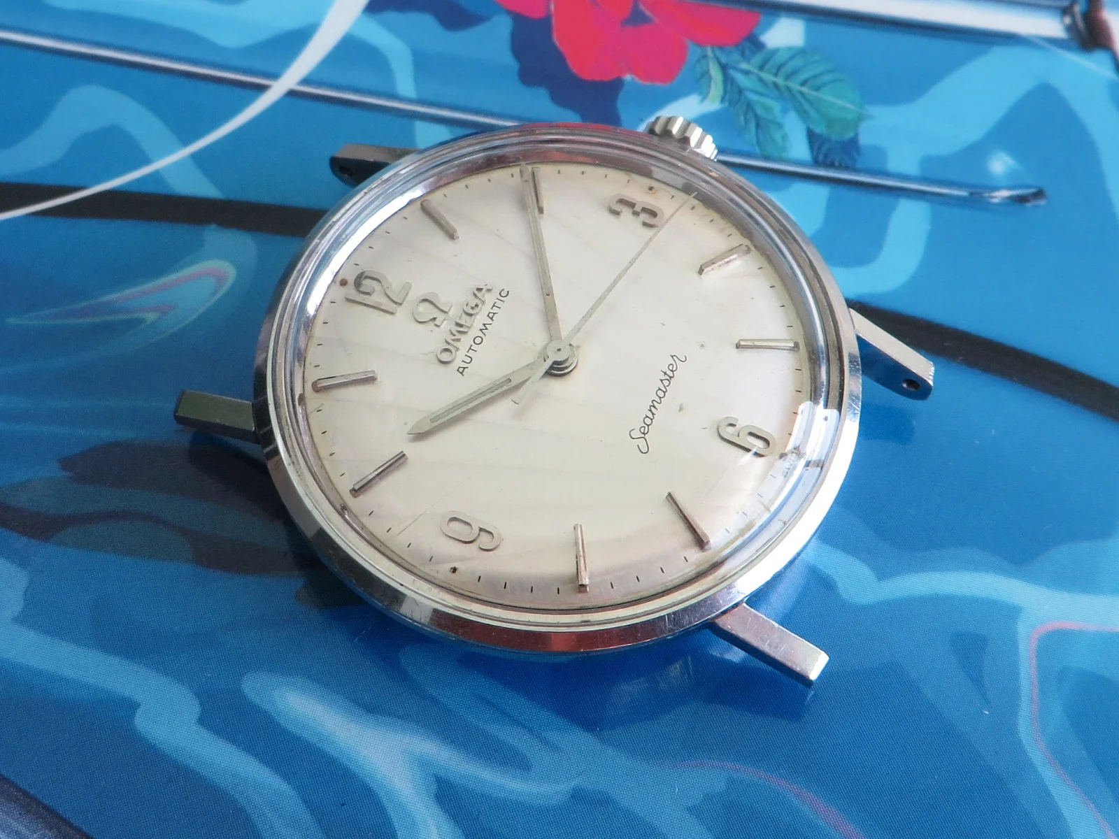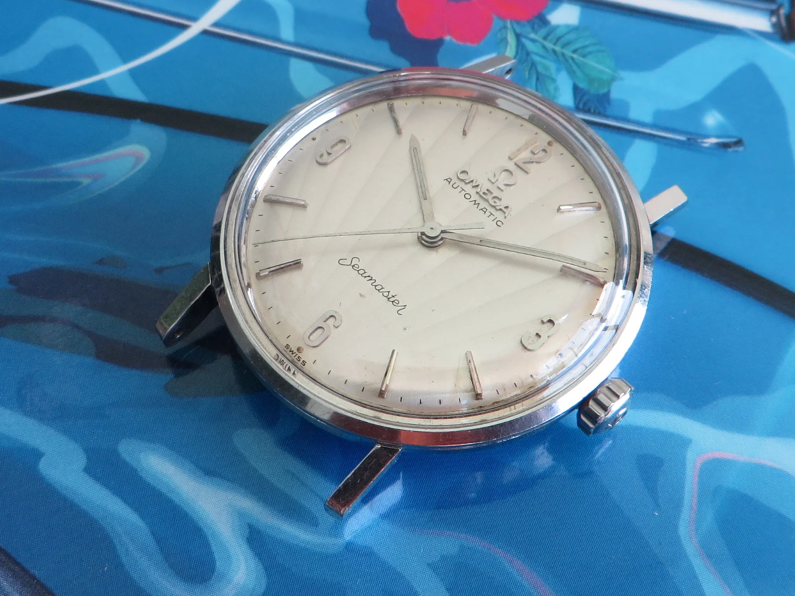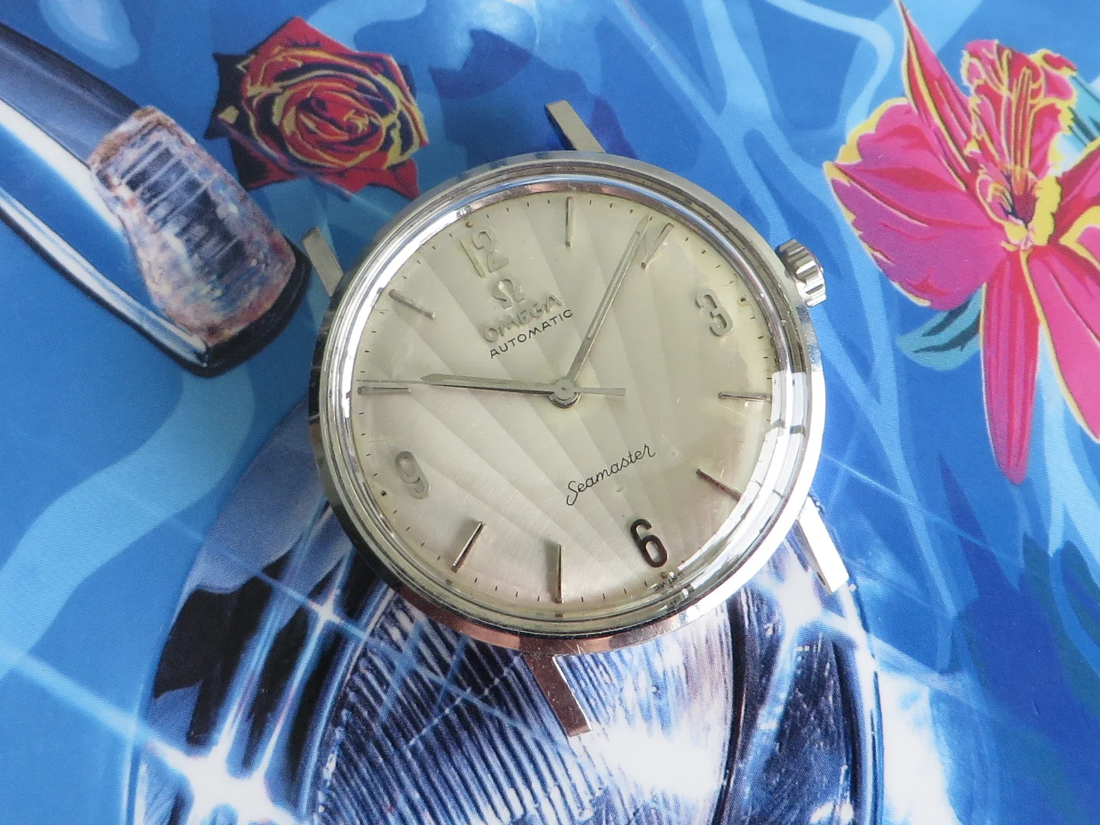 Distinctive original uncommon embossed CLAM SHELL pattern dial in brushed silver with applied tapered multi-faceted markers and Arabic numerals, Omega symbol and script. Far from perfect, but when is the last time you saw one?